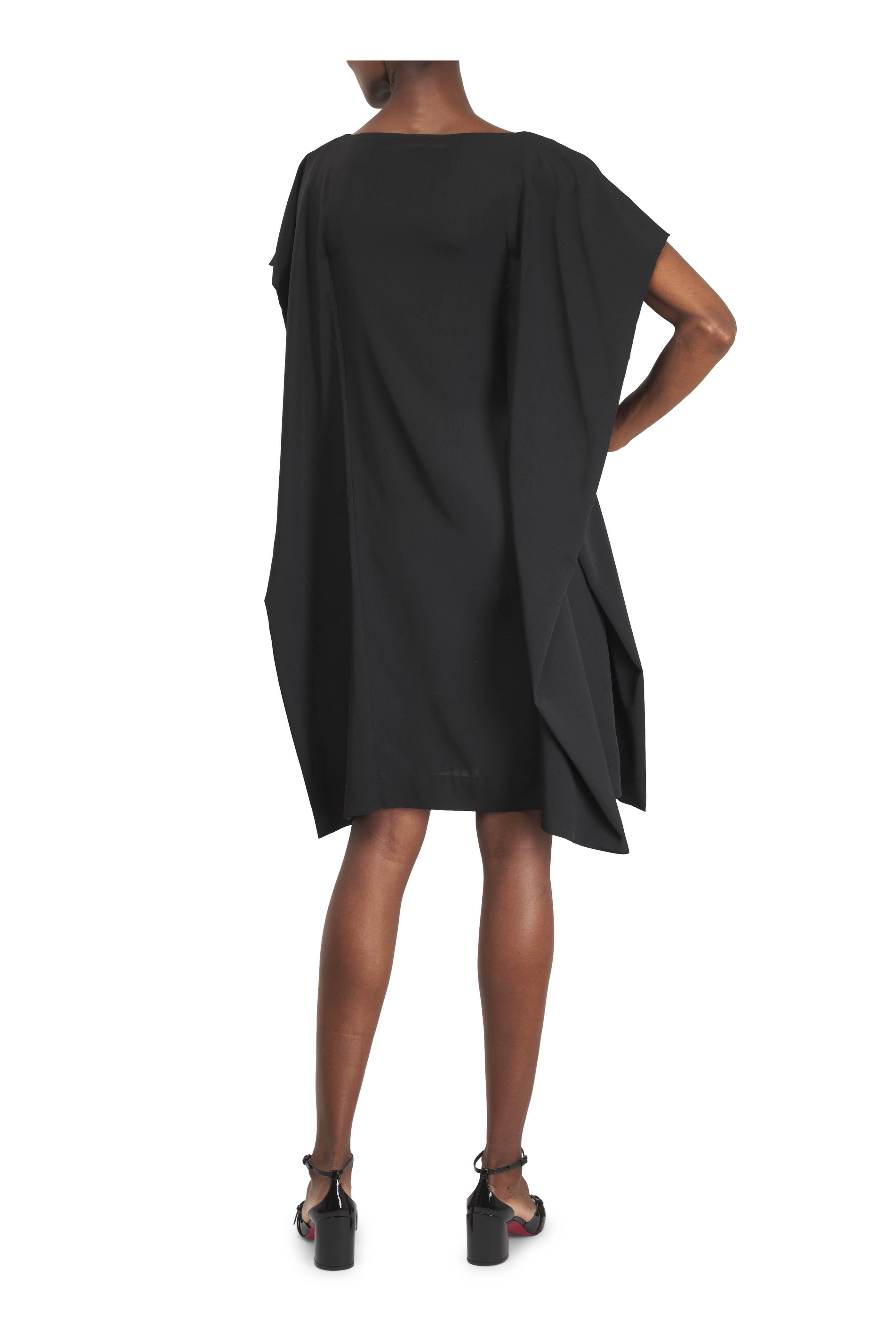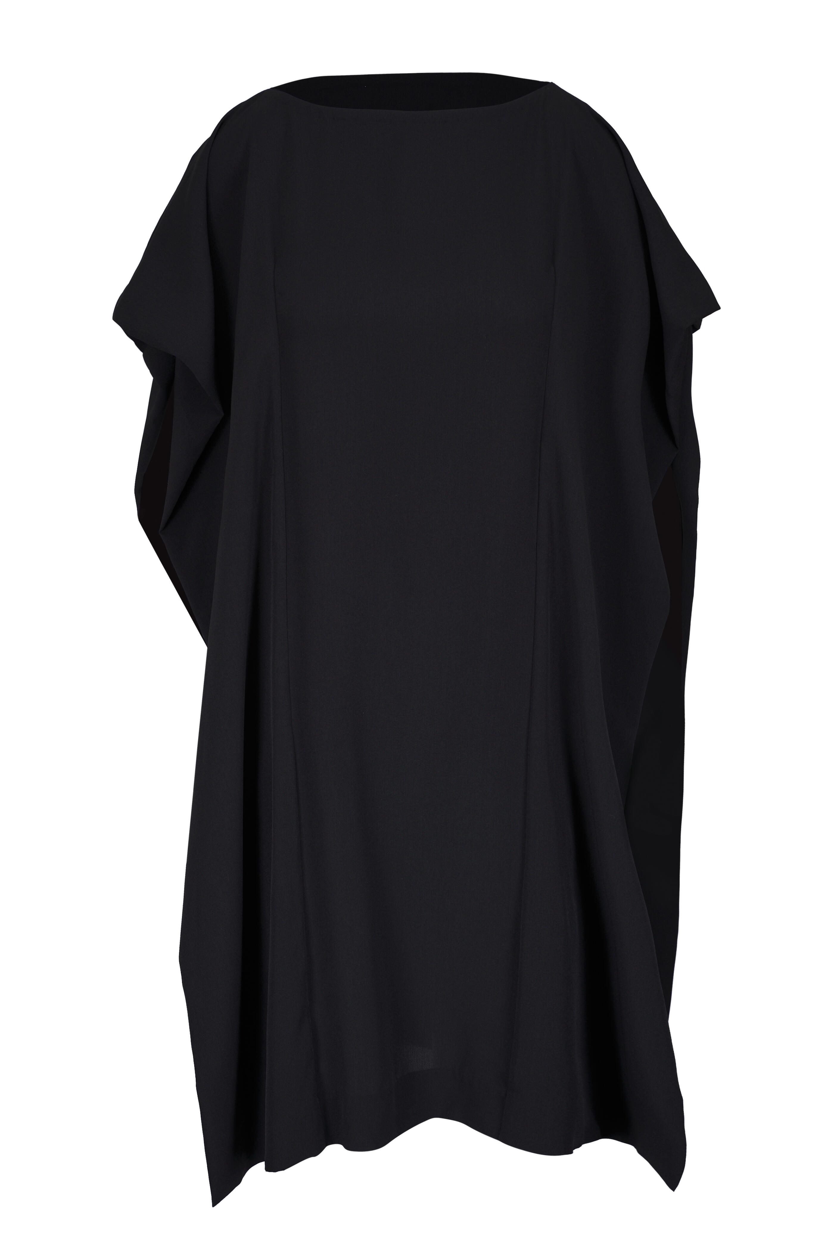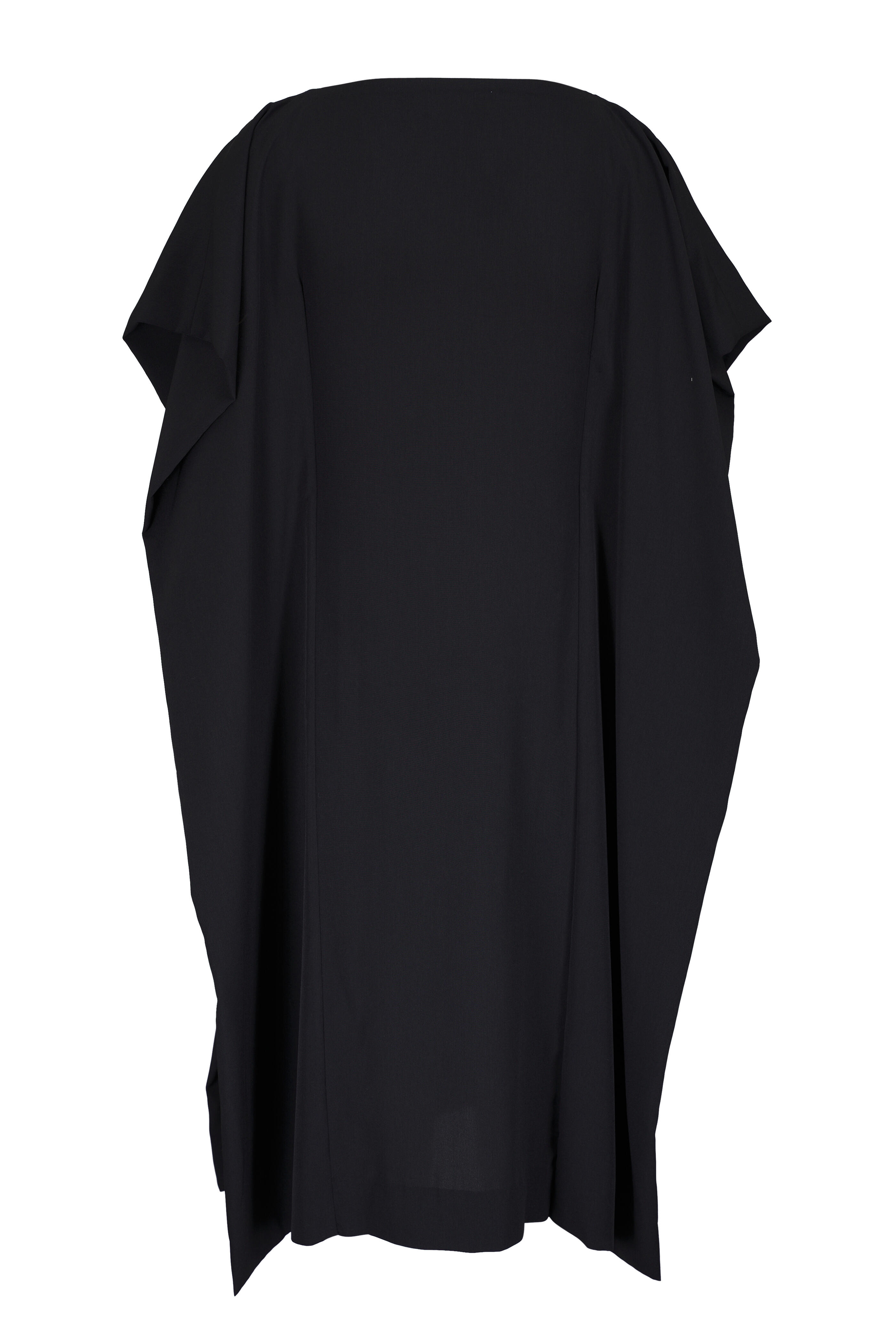Slip on style. Flowing side panels. Short sleeves. Loose fit. Knee length. 100% polyester. Dry clean.