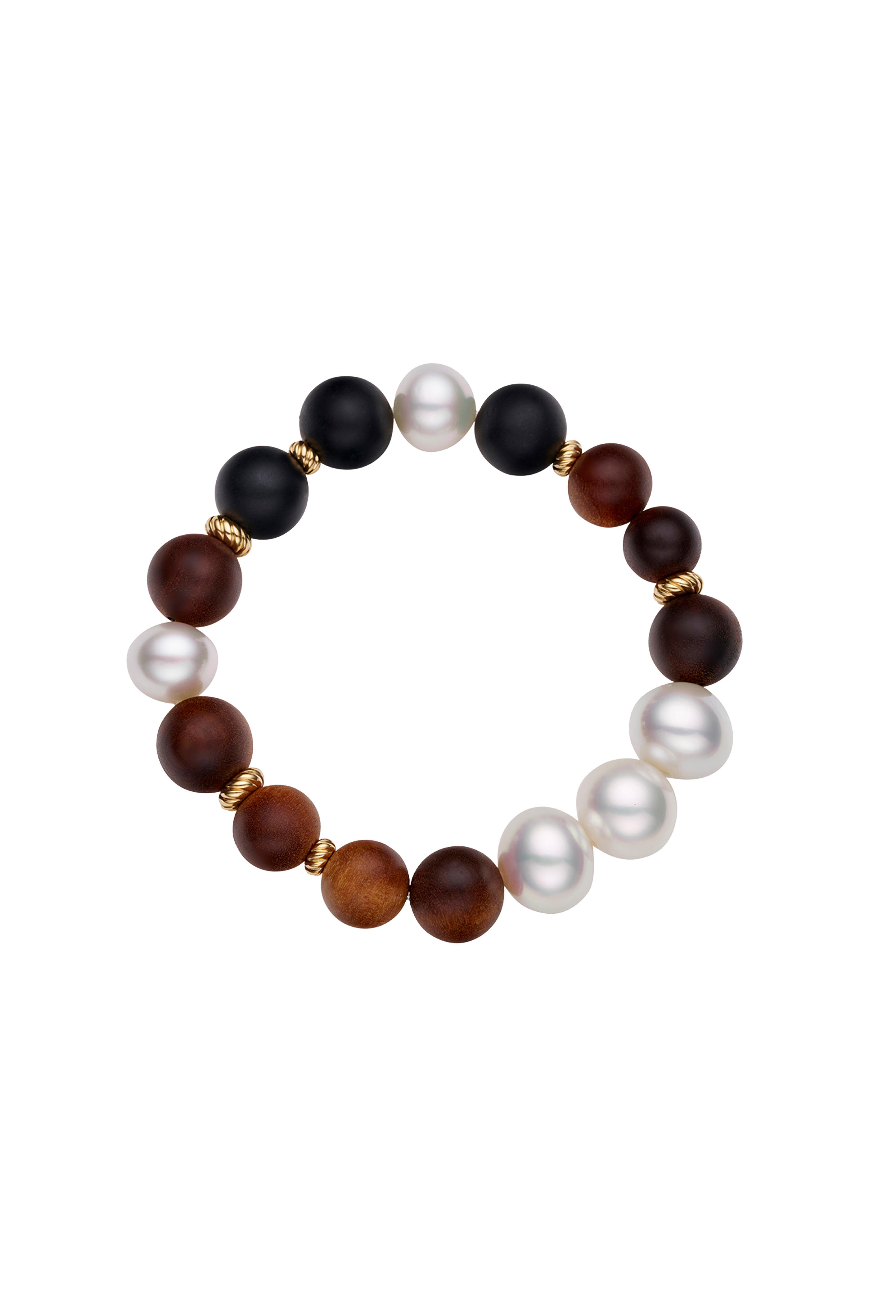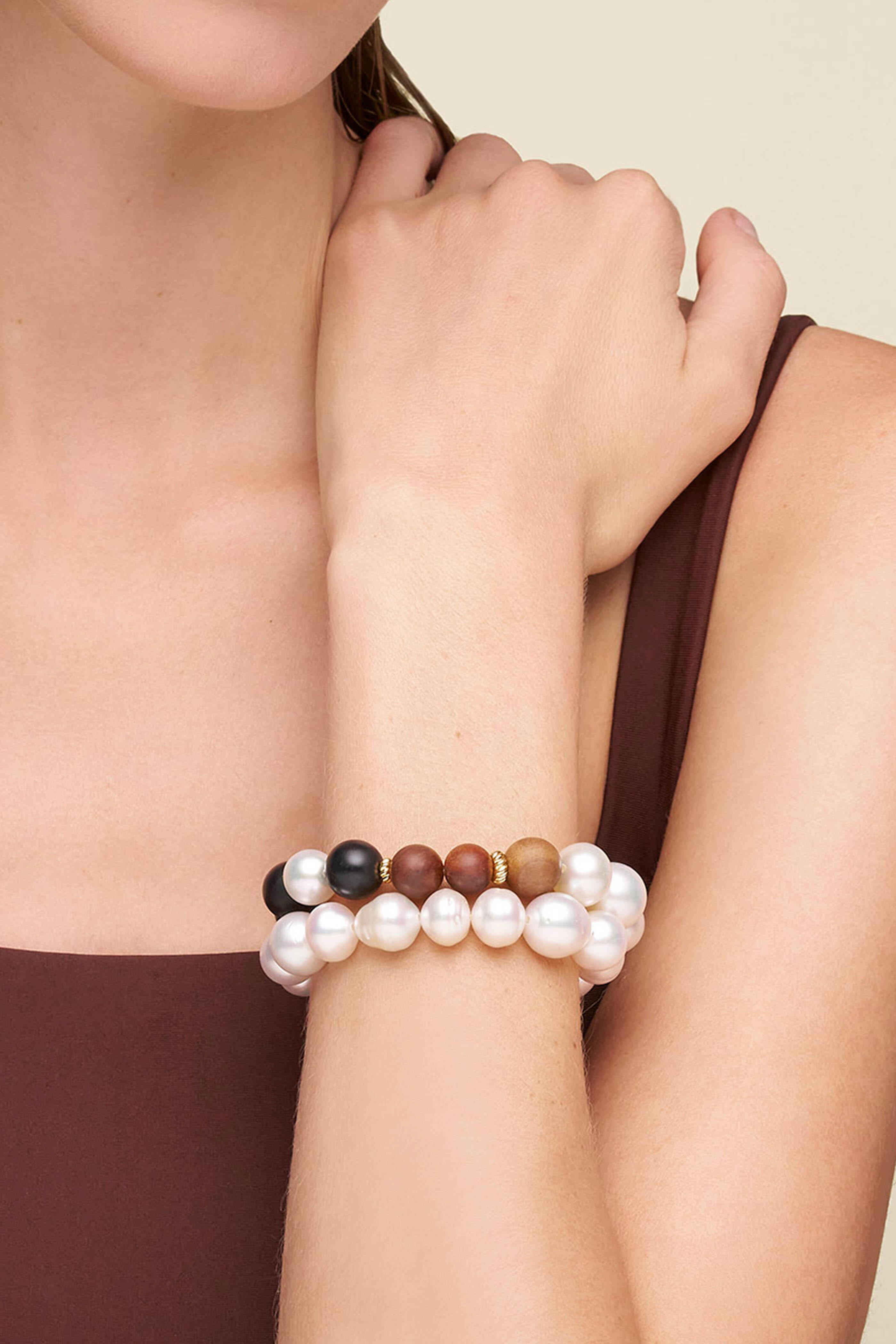 Inspired by the majestic hues of dusk over Australia’s North West, the Kimberley Golden Dusk Bracelet is a contemporary take on pearl jewellery, designed for effortless everyday elegance. Five hand-selected Australian South Sea pearls are artfully paired with dark native sandalwood, onyx, and 18K yellow gold rondelles, creating a striking contrast of texture and tone. Whether worn alone or layered with other pearl bracelets, this piece embodies the natural beauty of the Kimberley landscape in a refined, wearable design.