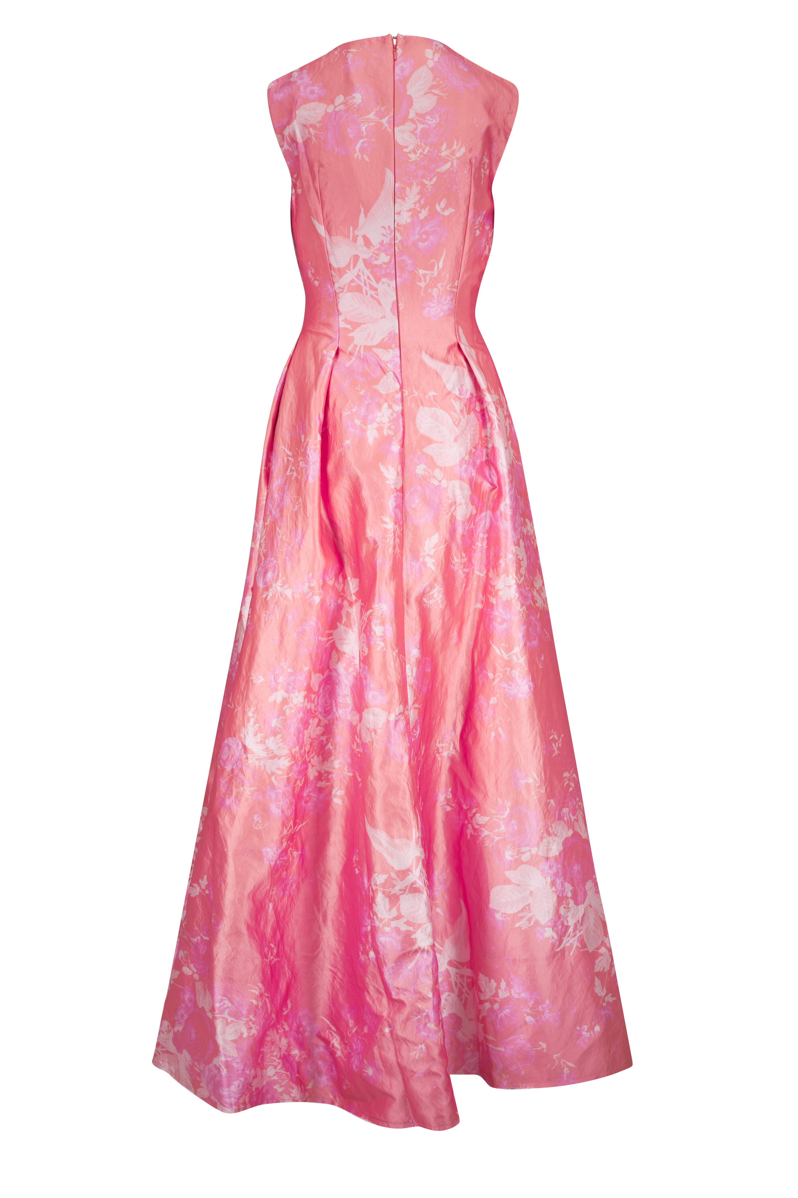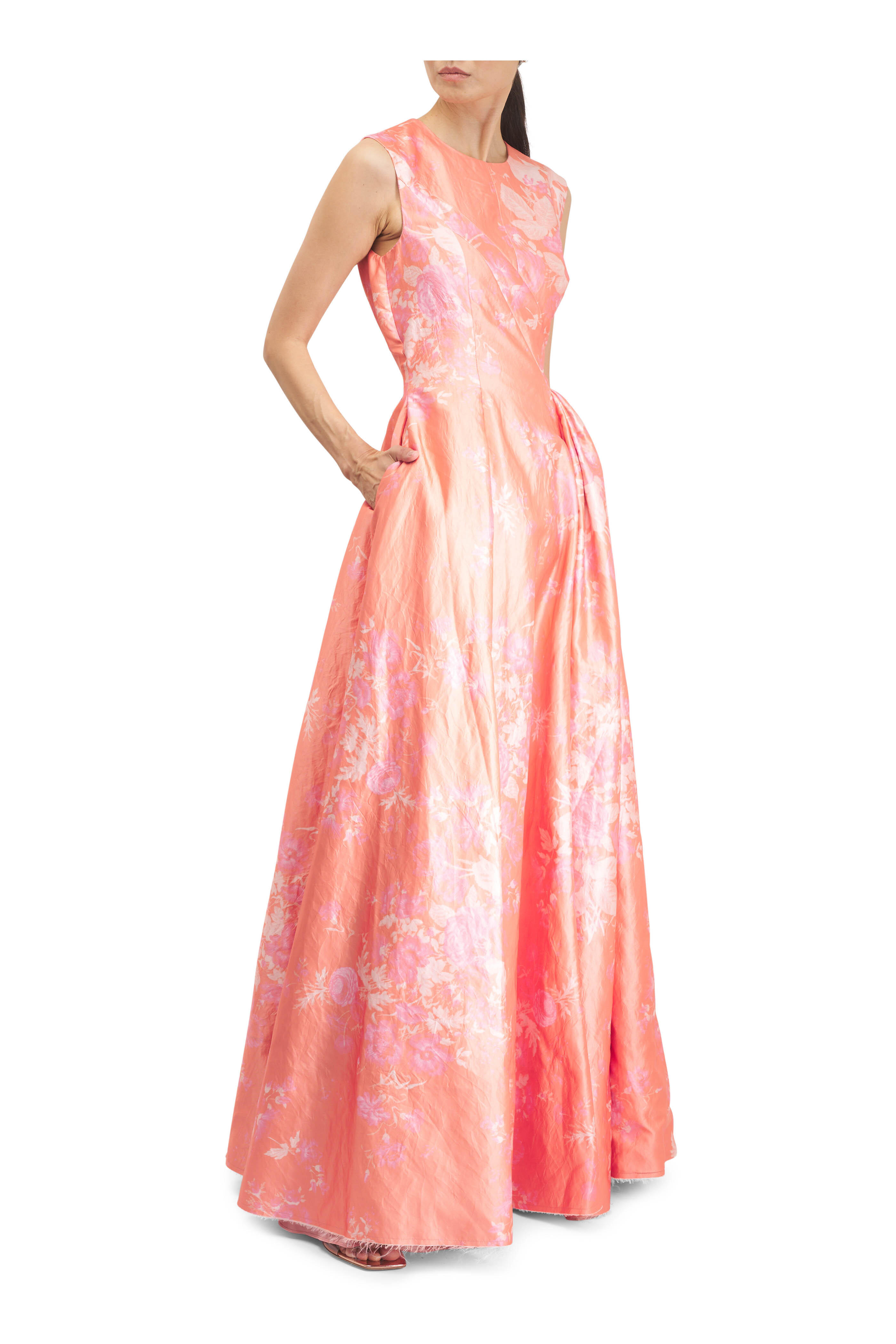 Round neckline. Concealed back zip. Side slip pockets. Front ruching. Raw hem. Made in the UK. 63" shoulder to hem. 94% polyester, 6% metal; secondary: 100% polyamide; lining: 100% silk. Dry clean.