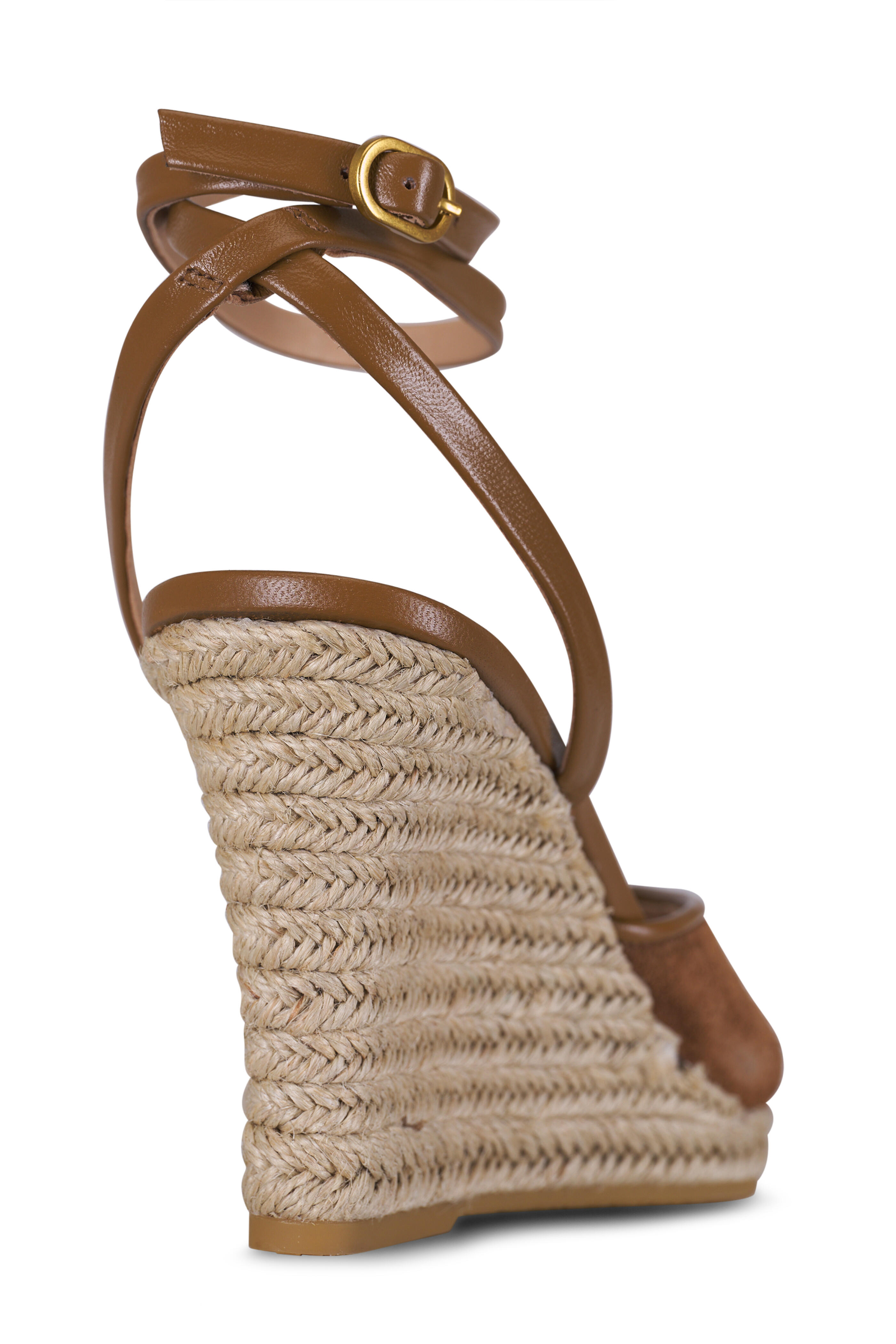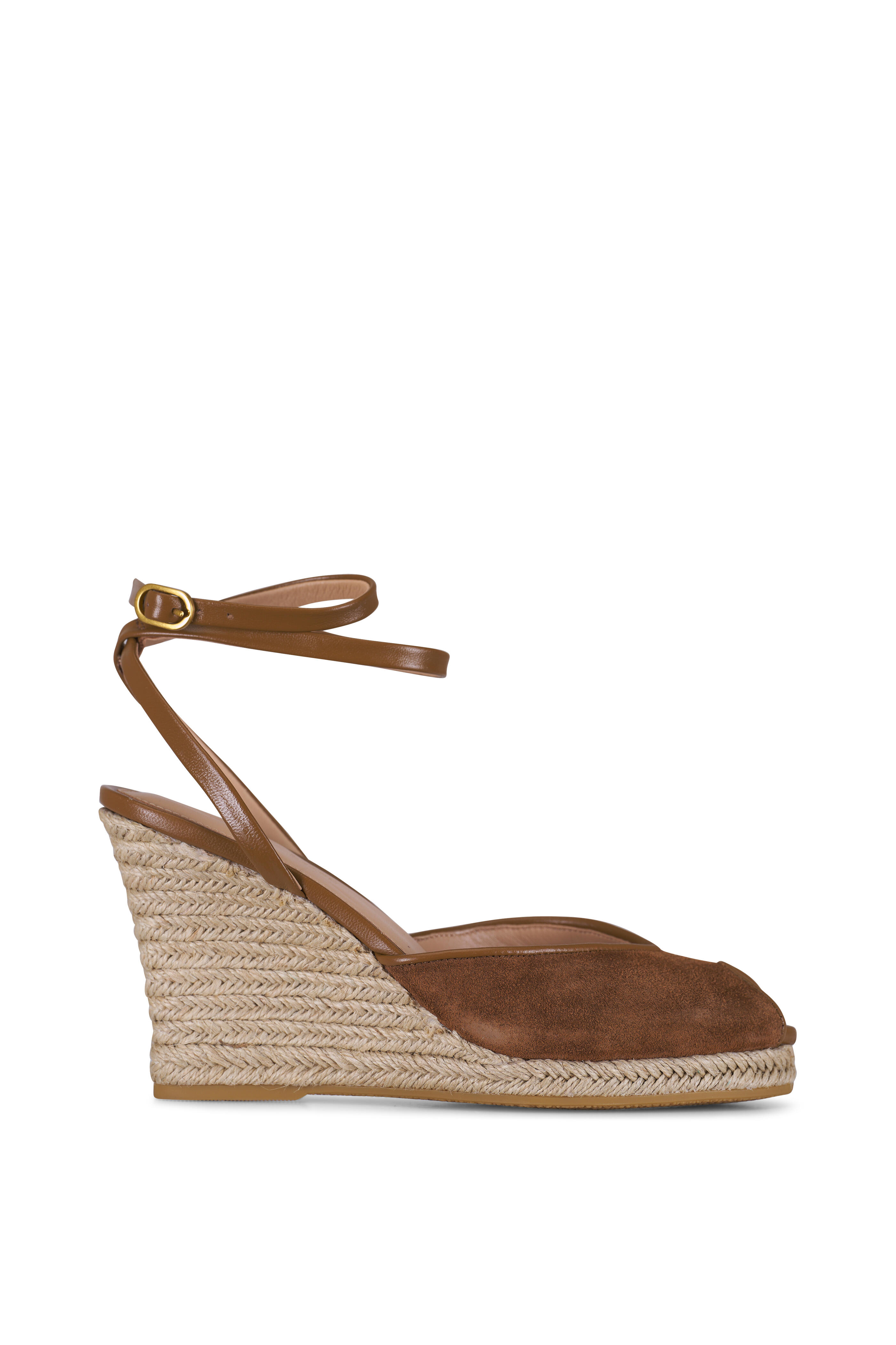 Suede upper. Peep toe. Adjustable buckle wrap around ankle strap. Leather lining and cushioned leather footbed. Jute midsole. Rubber sole. Imported. Heel measurement: 3.5".