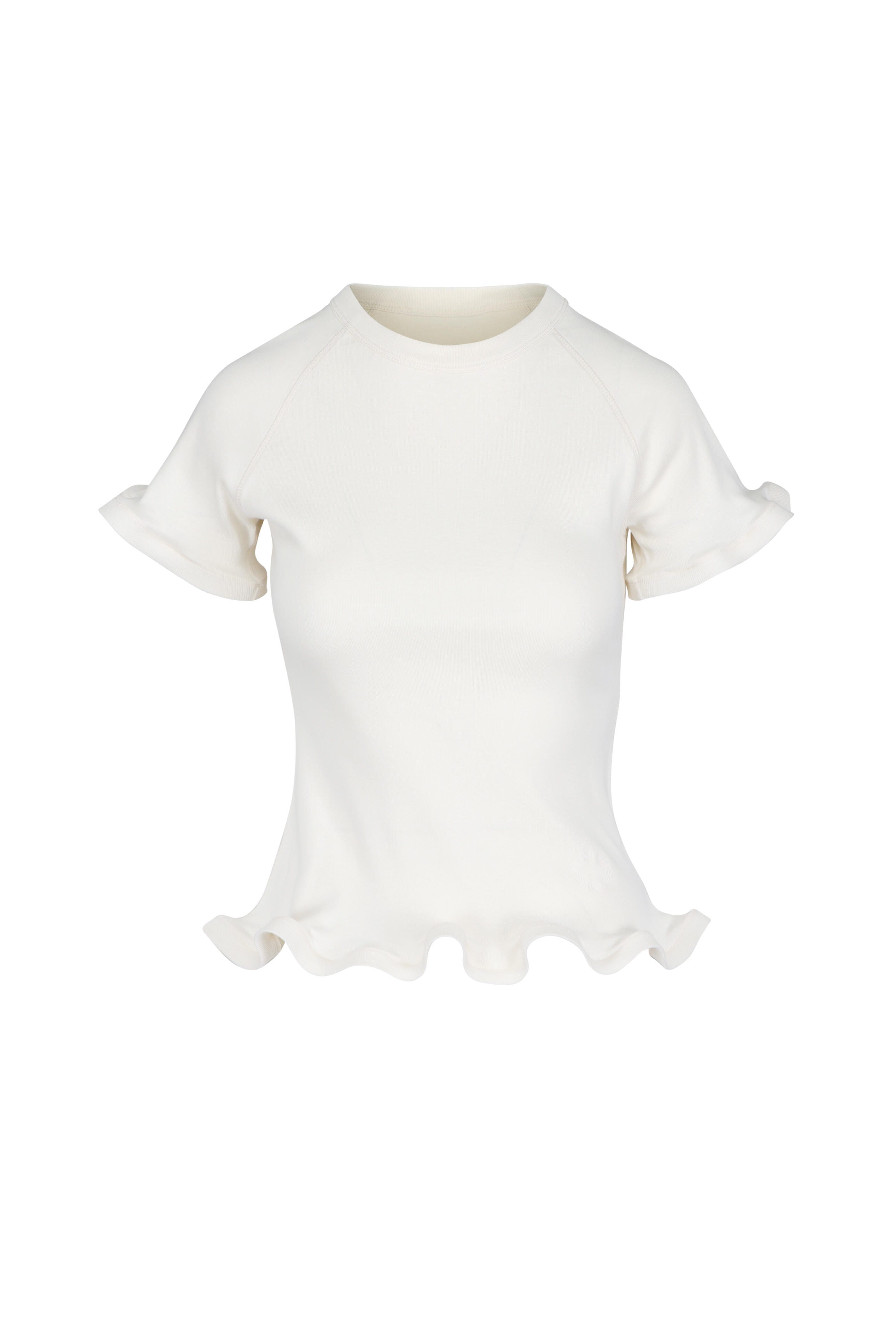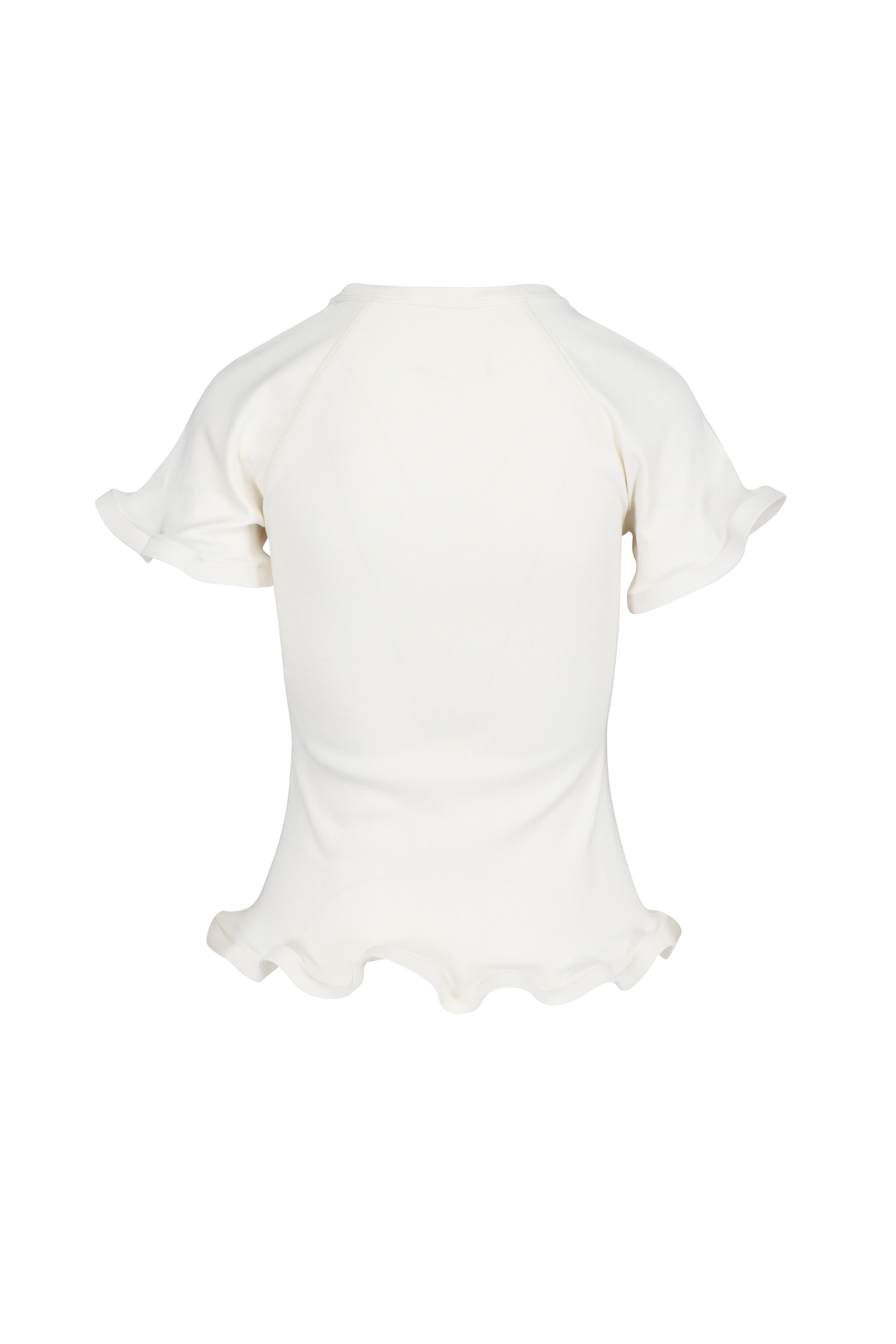 Crew neck. Short sleeves. Frilled edges at cuffs and hem. Imported. Fits true to size.. 100% cotton. Dry clean.