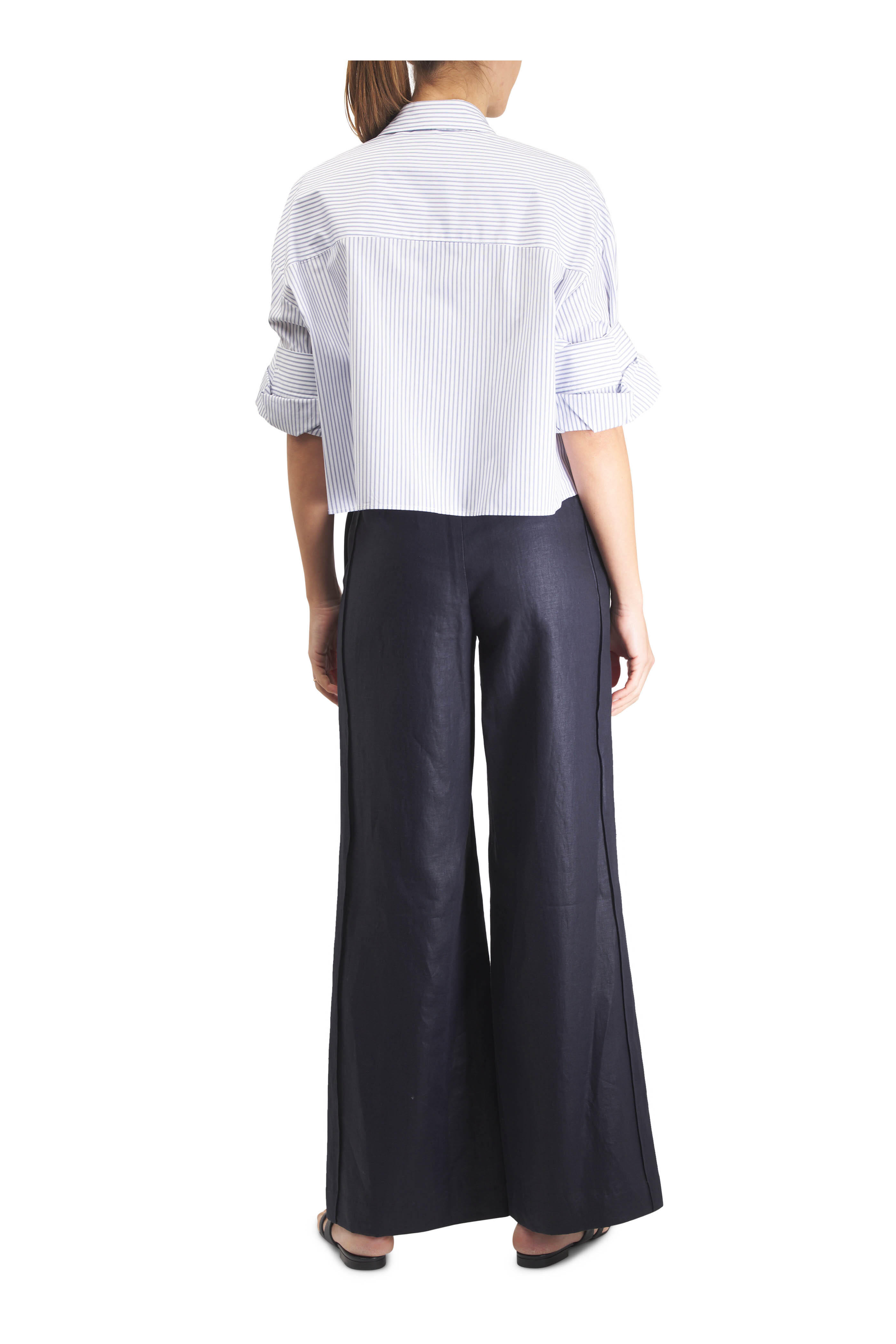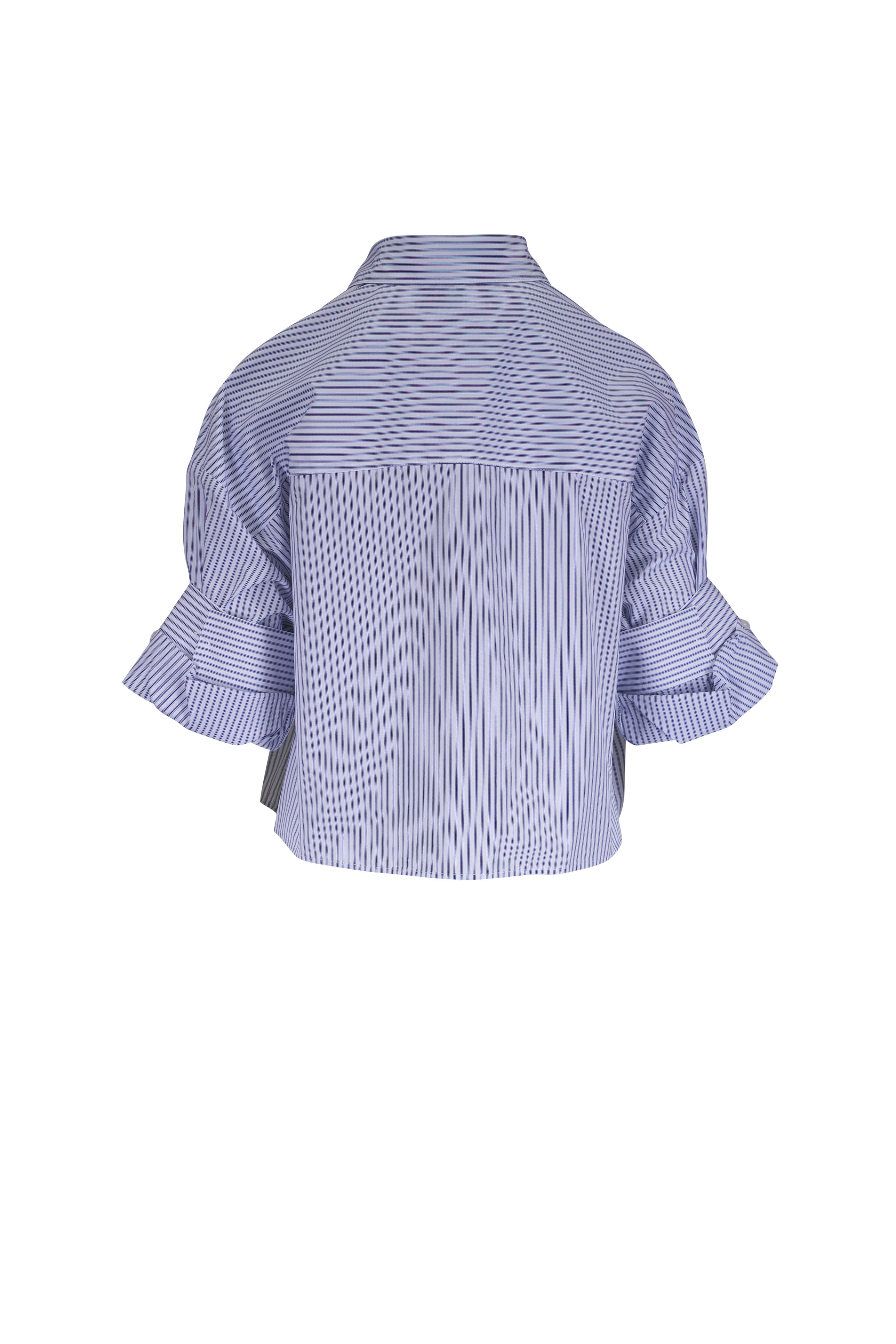 Spread collar. Front button placket. Chest patch pocket. Three-quarter sleeves; convertible cuffs. Cropped hem. Made in the USA. Approximately 20" shoulder to hem (measurements taken from size XS/S). 100% cotton. Dry clean.