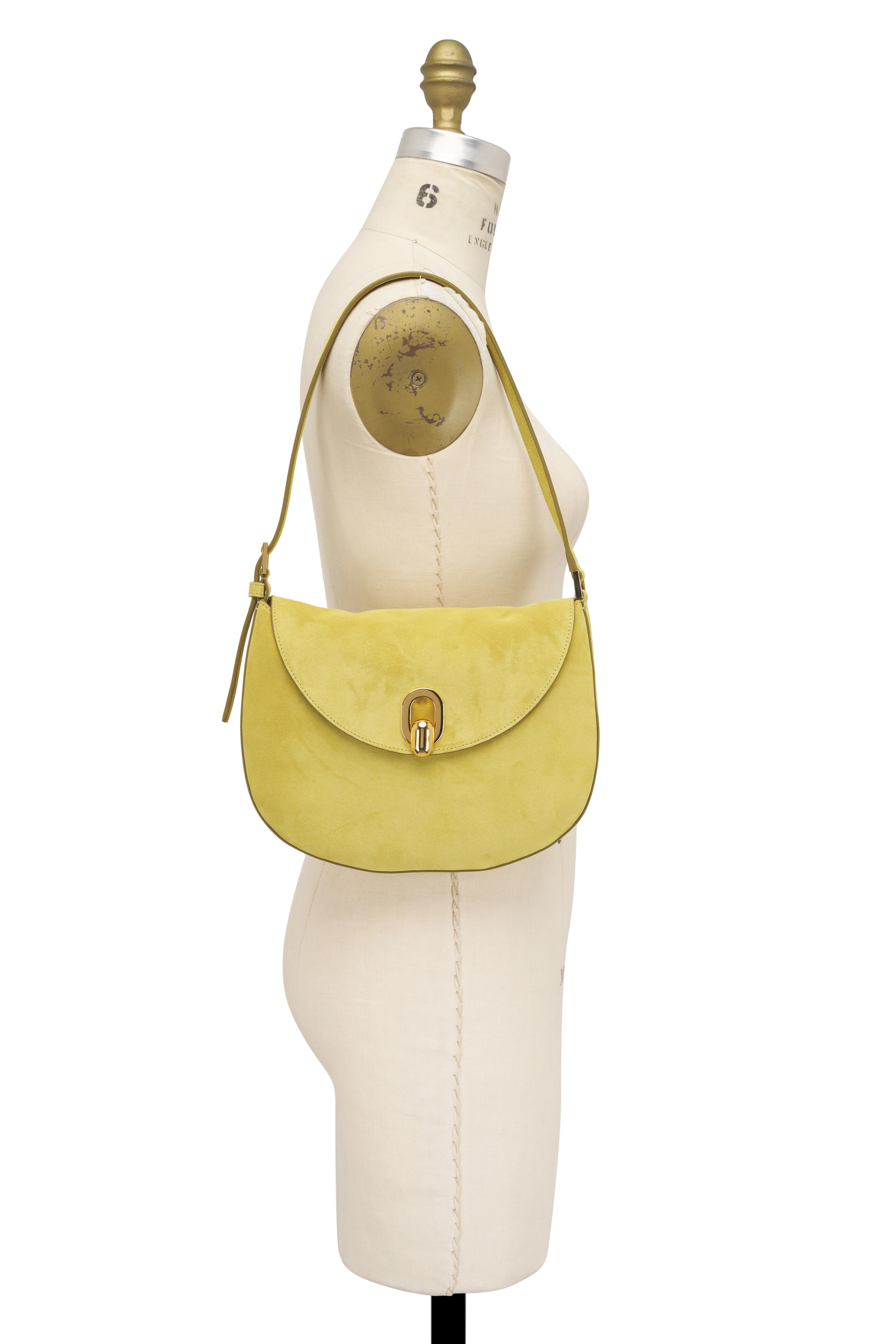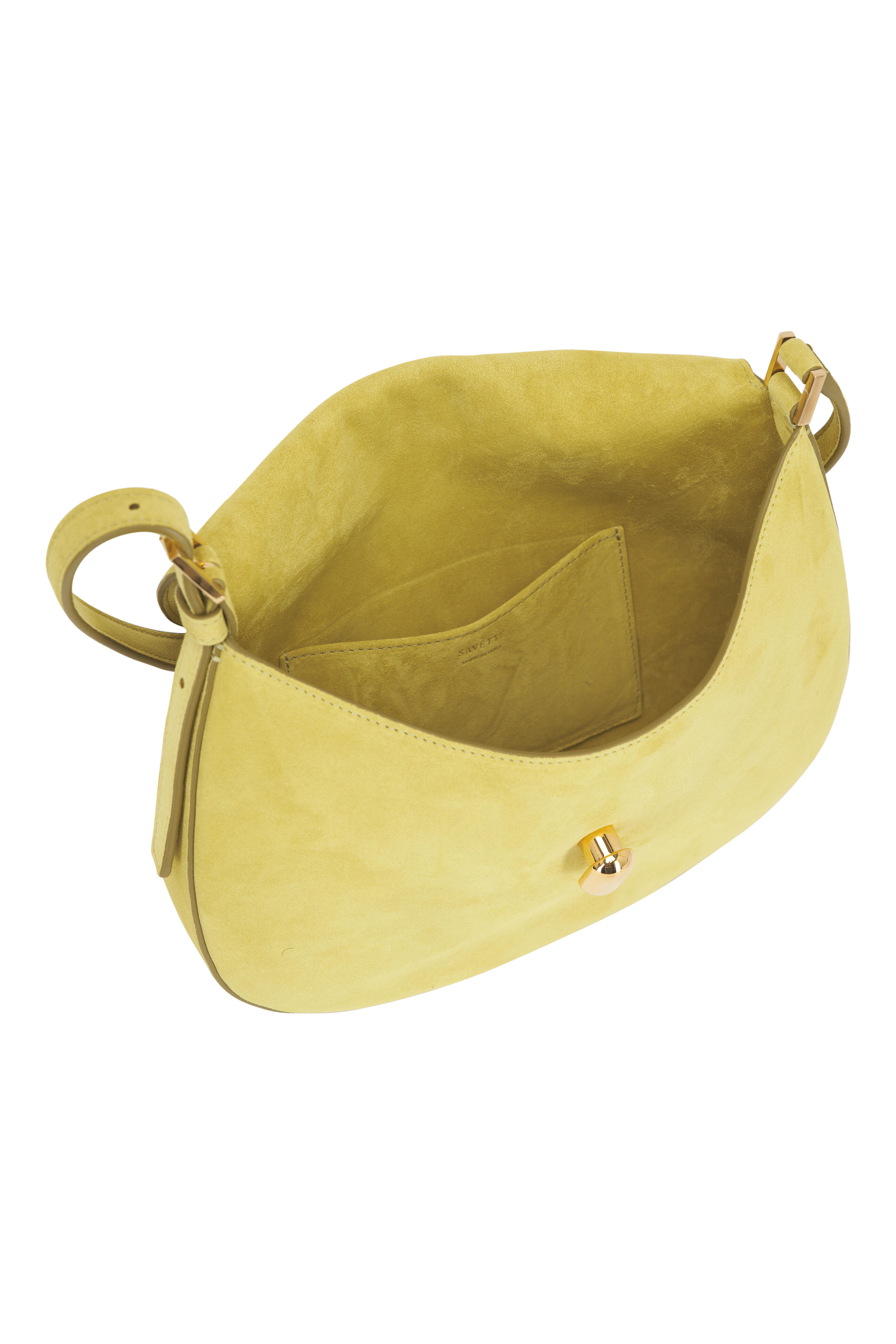 Suede. Adjustable shoulder strap. Flap with turn-lock closure. Single compartment. Interior wall pocket. Suede lining. Made in Italy. 10.5 inches long x 8 inches wide x 1.5 inches deep.
