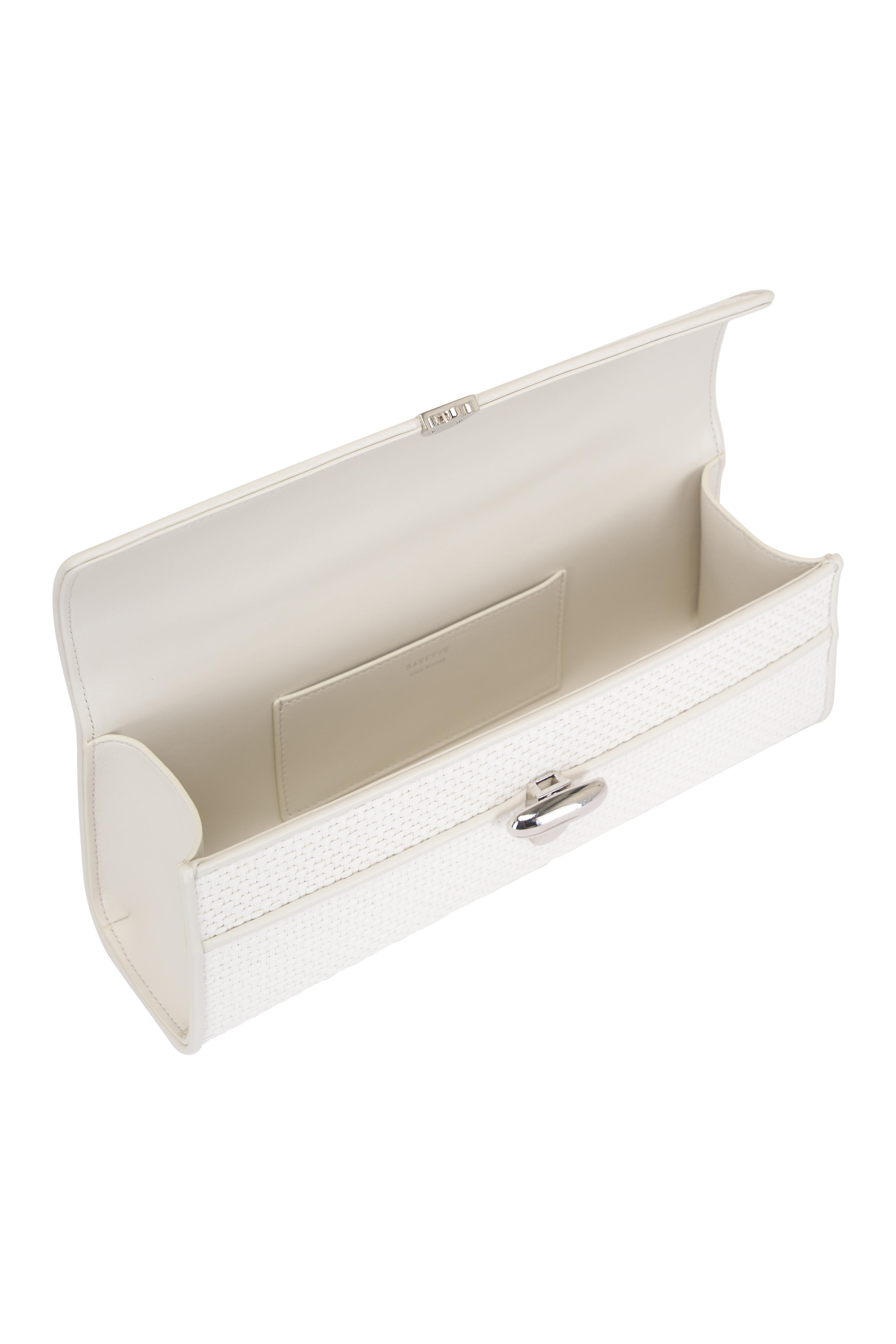 Woven raffia and calf leather. Flap closure with turn lock. Single leather top handle. Single compartment. Interior wall pocket. Leather lining. Made in Italy. 11 inches long x 4.5 inches wide x 3 inches deep.