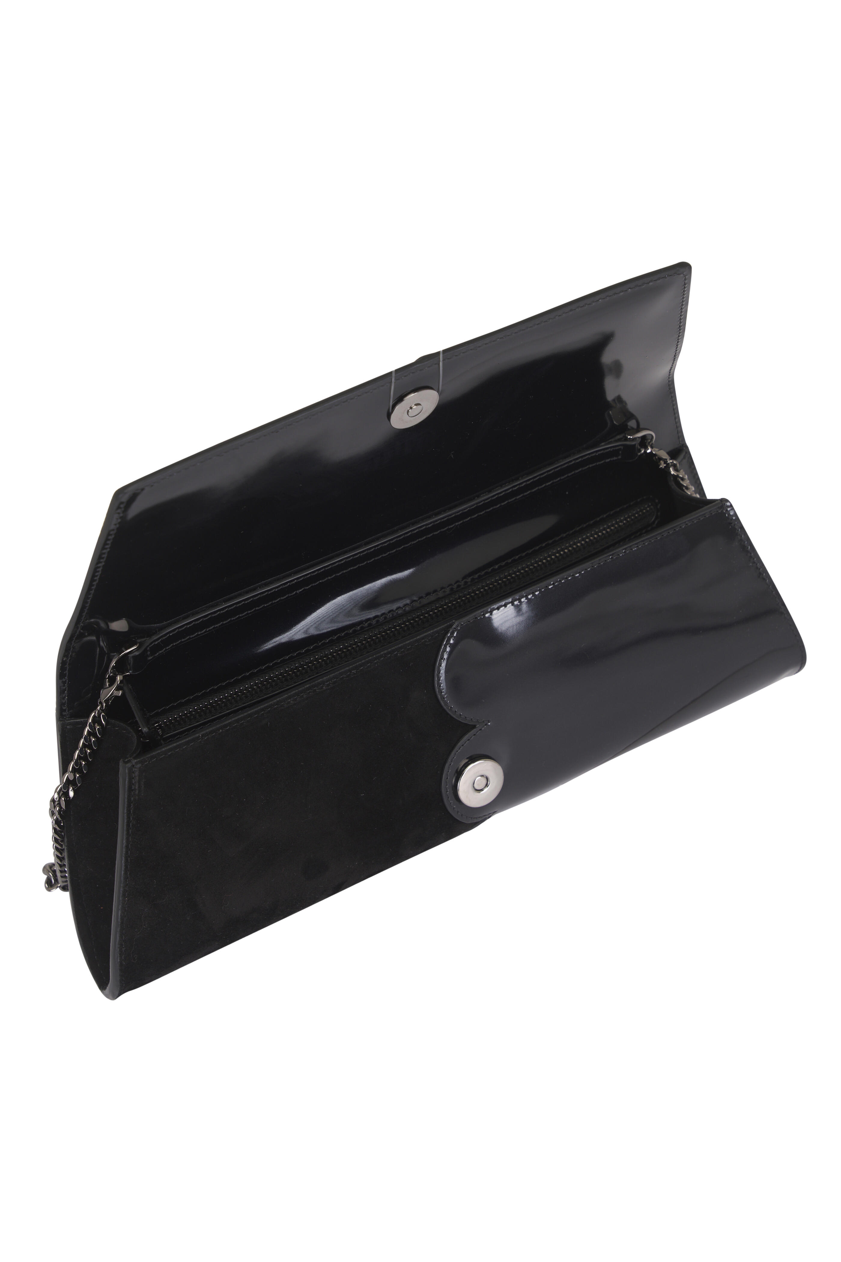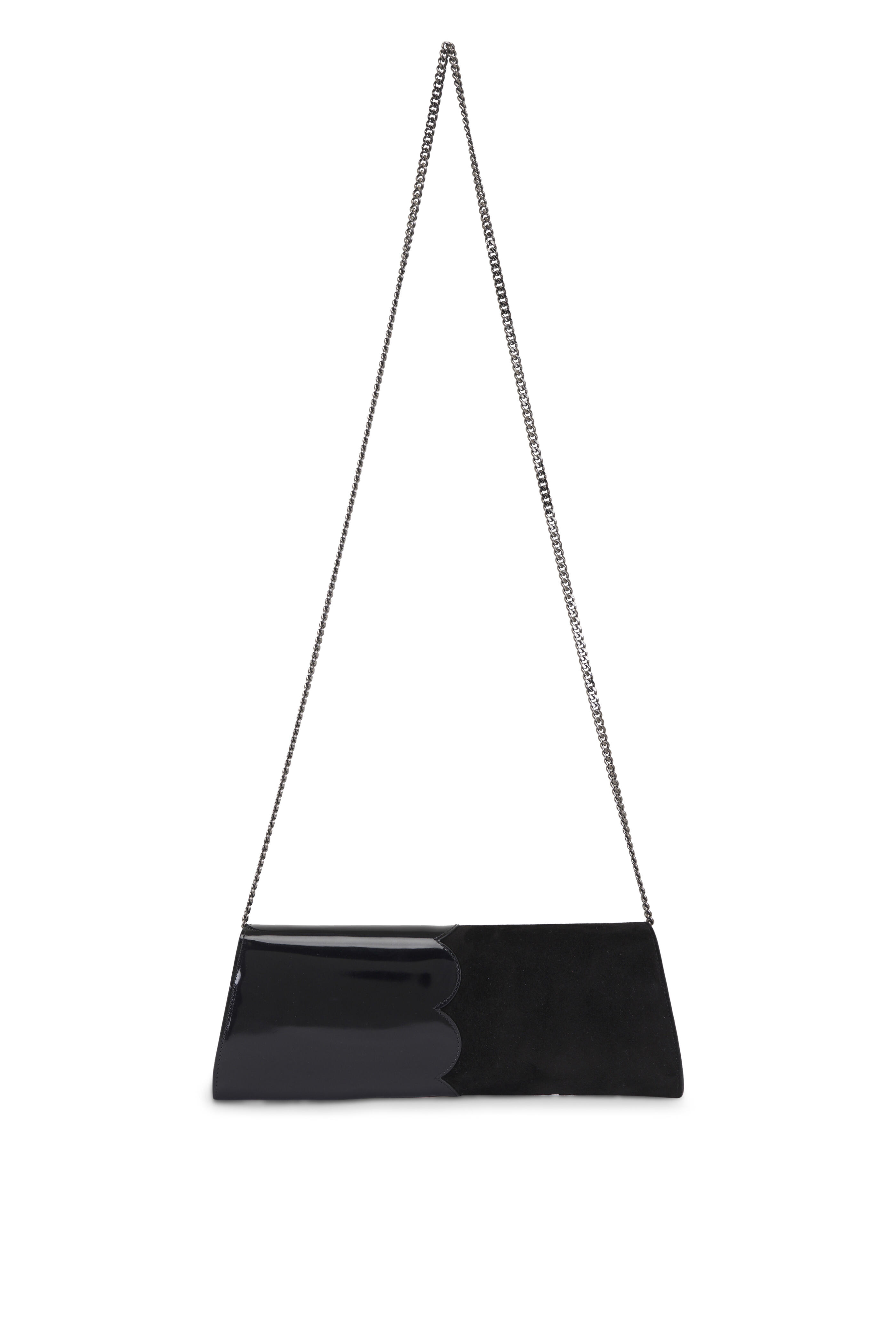 Suede and leather outer. Leather lining. Fold over flap; magnetic closure. Detachable chain shoulder strap. Outer scallop design. Interior wall zipper pocket. Imported. Approx: 4.5" H x 11.6" W x 2.2" D.