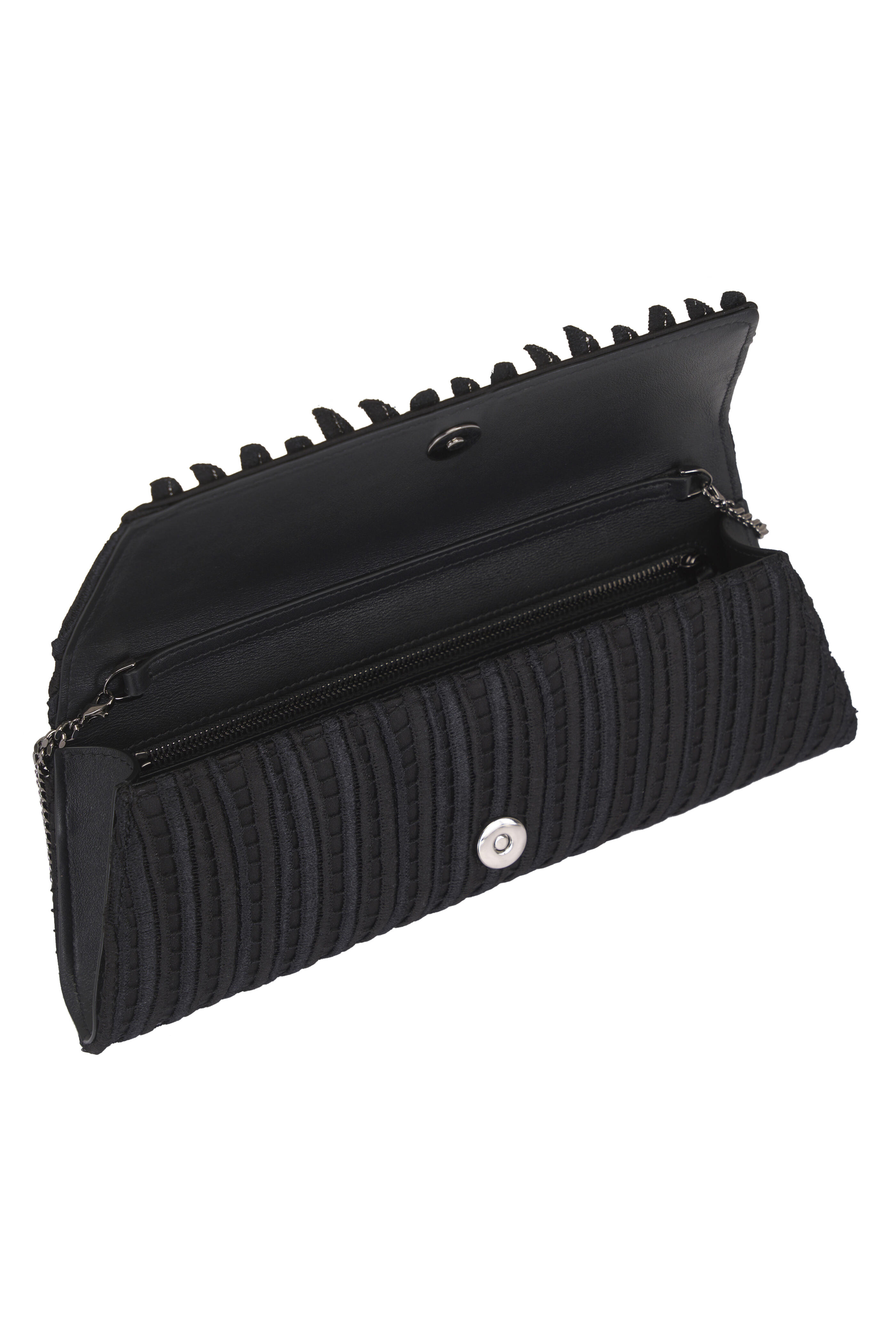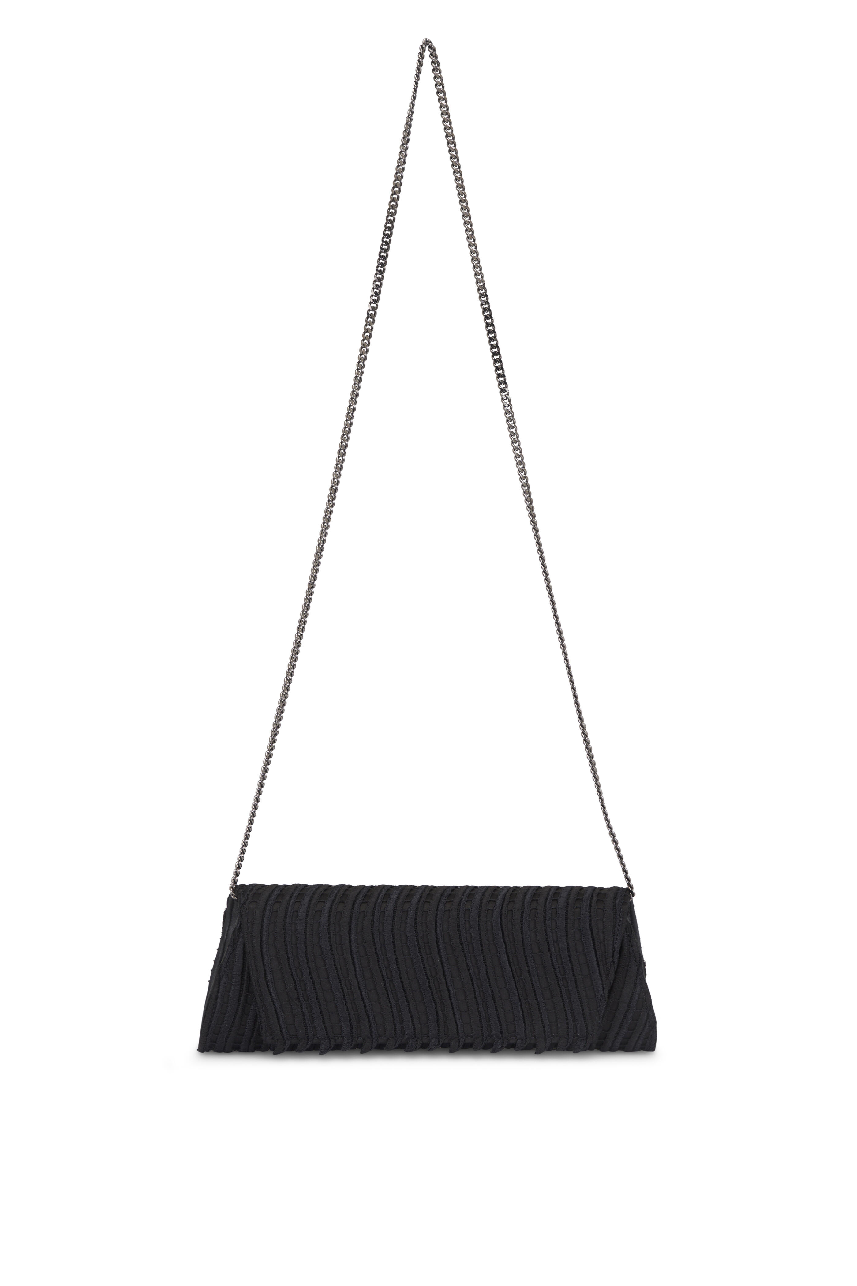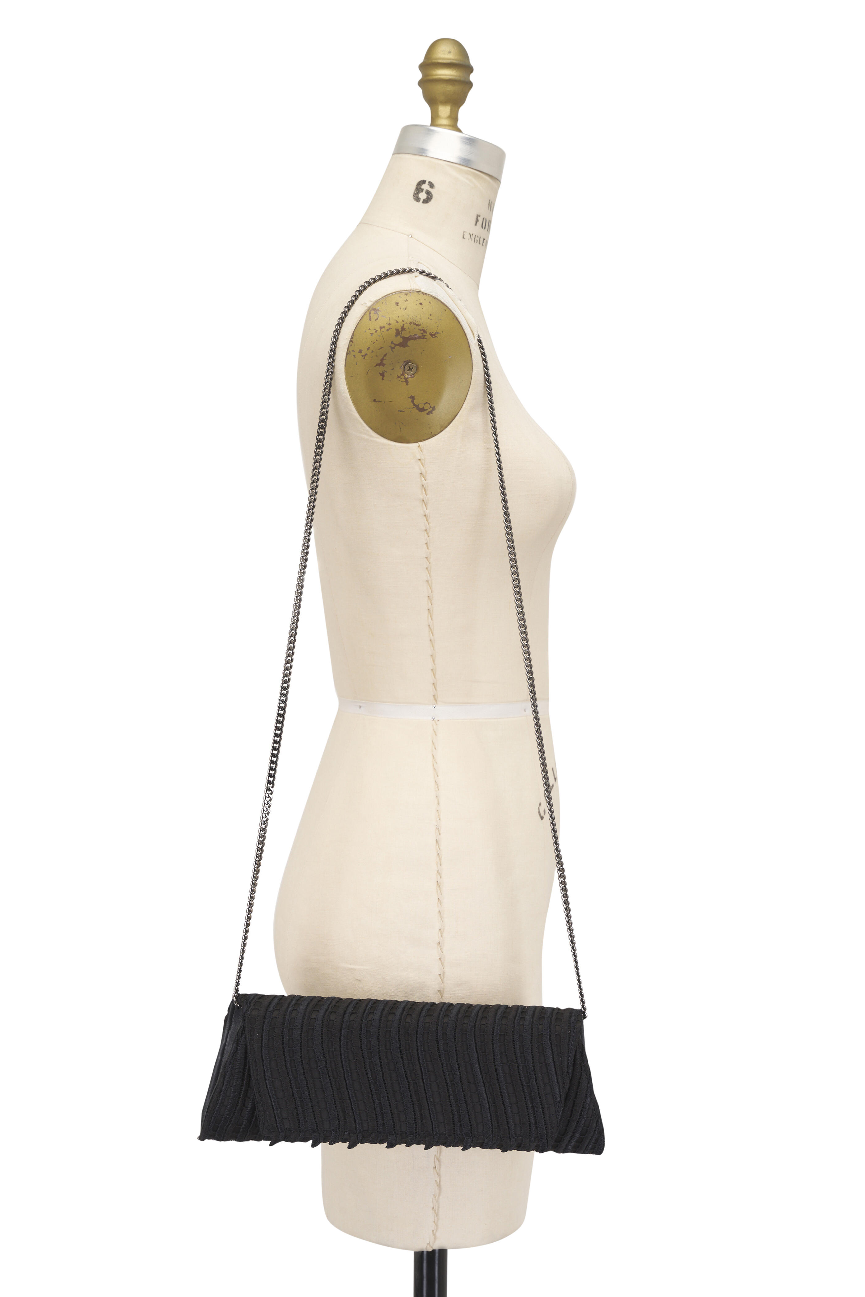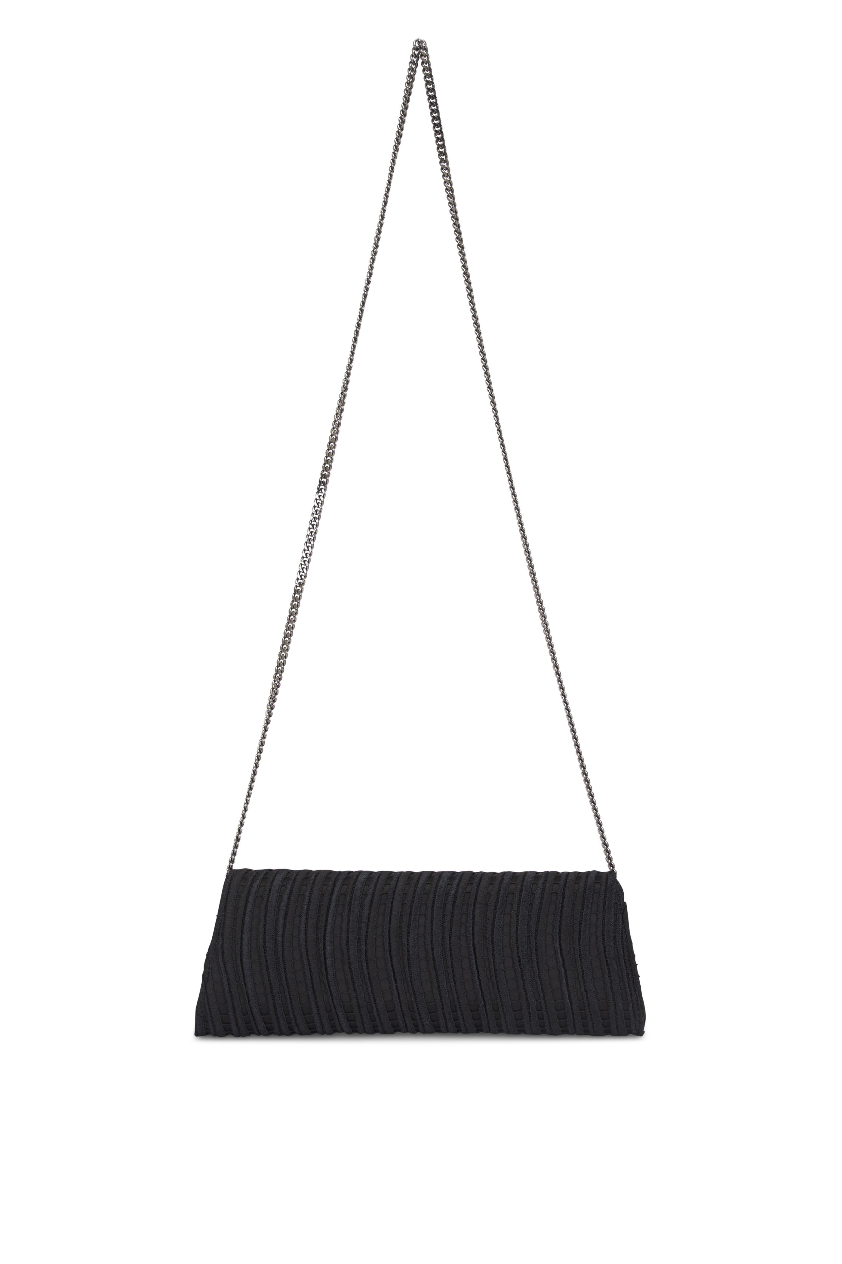 Silk satin; leather trim. Detachable chain shoulder strap. Front flap; magnetic closure. Interior zip pocket. Graphite-tone hardware. Imported. 11.6" x 4.5" x 2.1" cm.