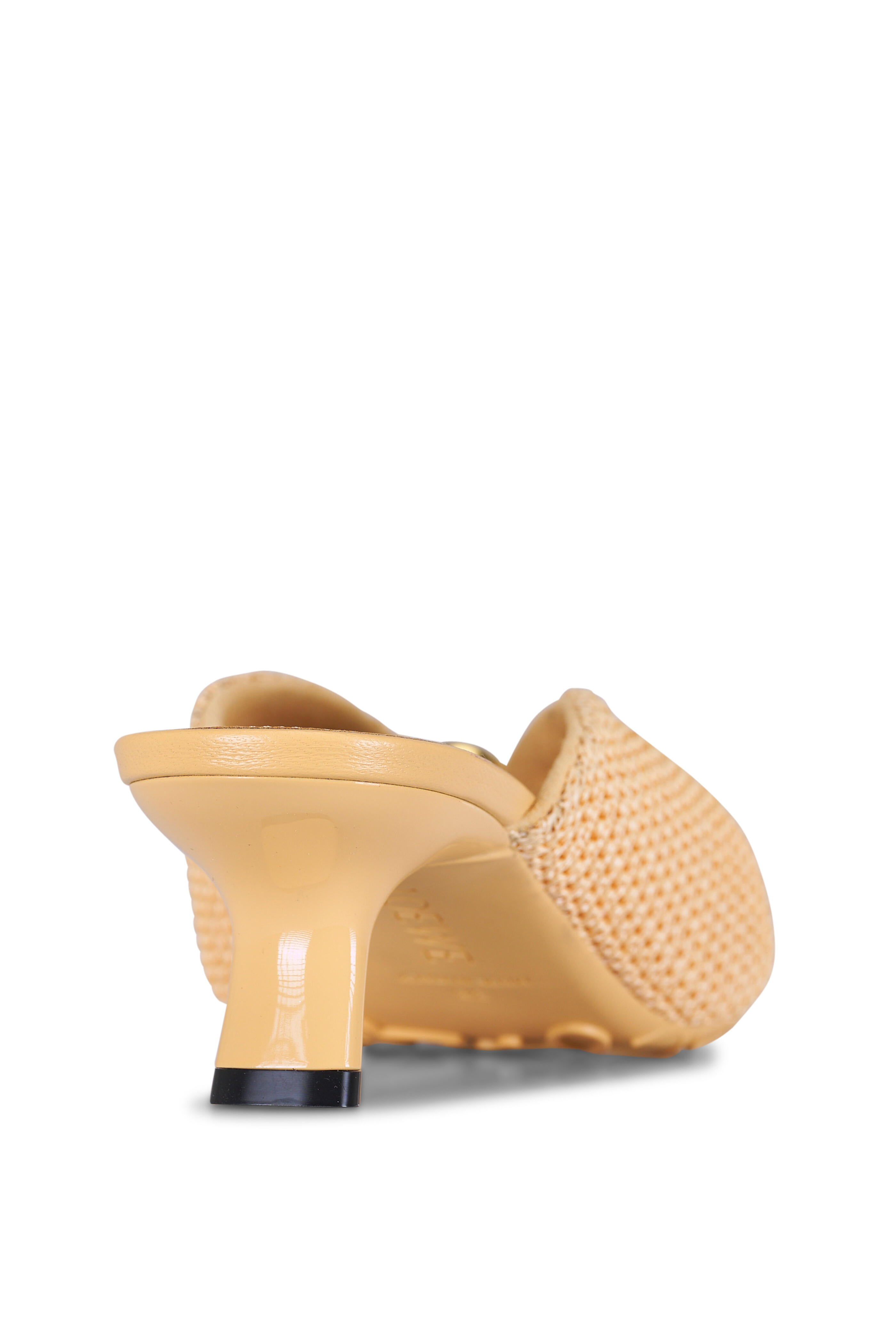Raffia upper. Open, petal toe. Metallic pebble with an Anagram engraved detail at vamp. Slide on style. Leather insole. Anagram embossed rubber outsole. Kitten heel. Made in Italy. Heel measurement: 45mm.