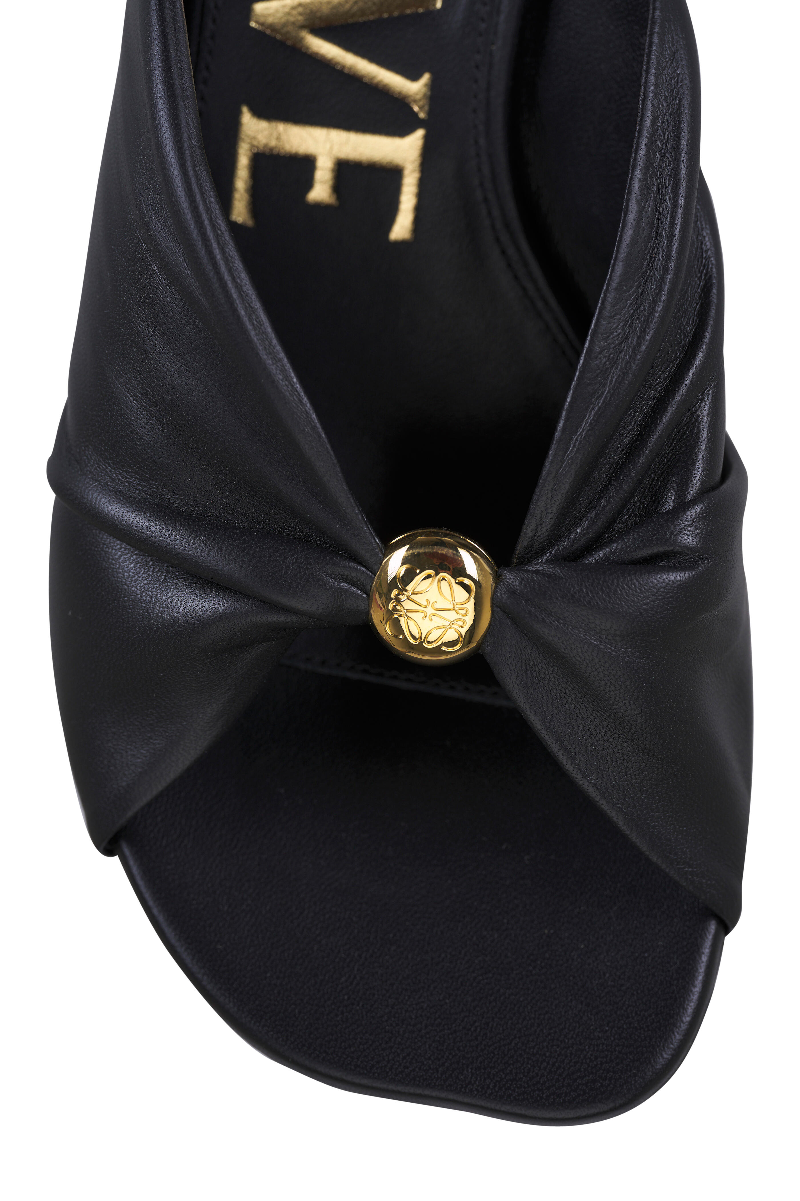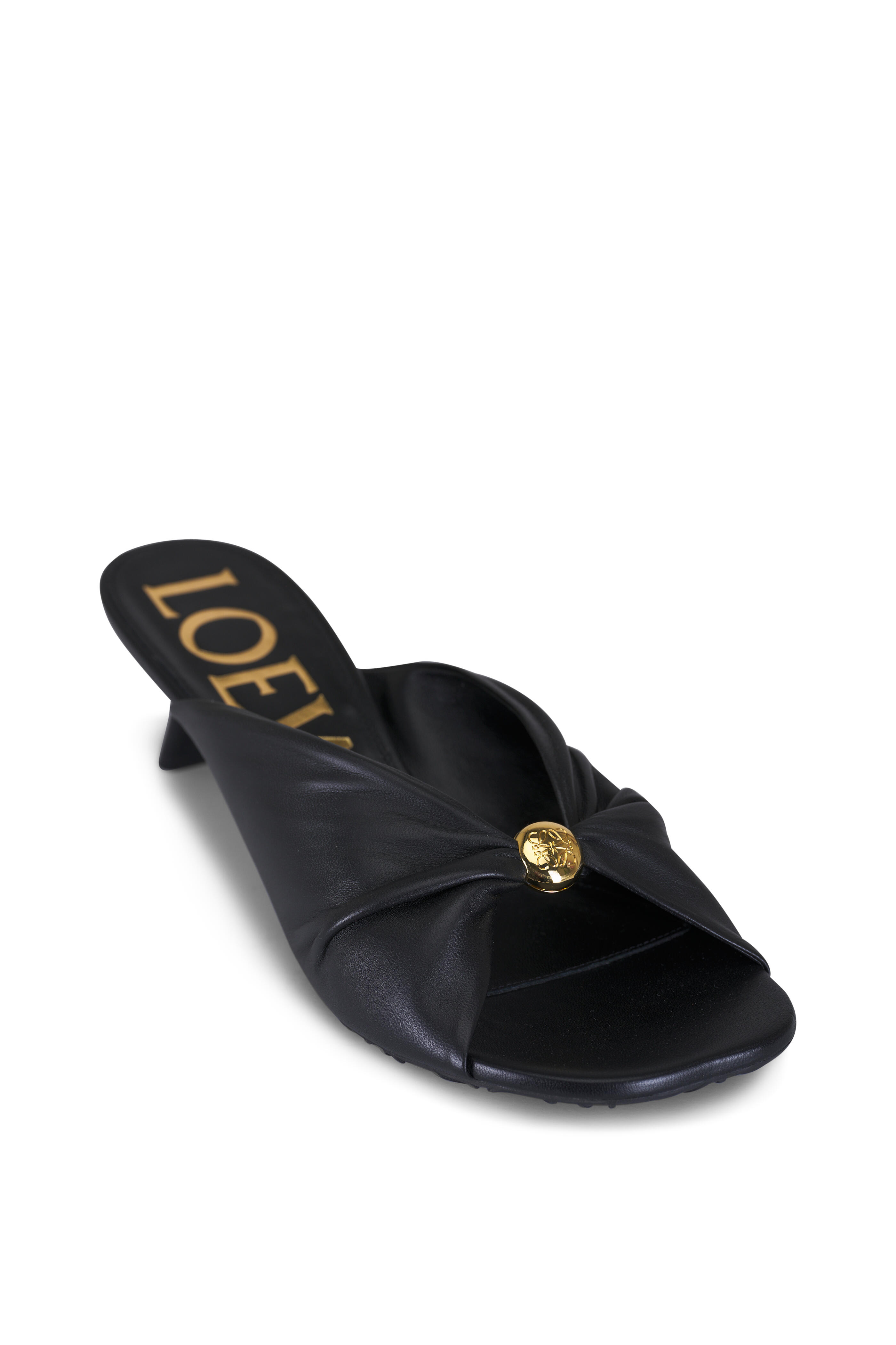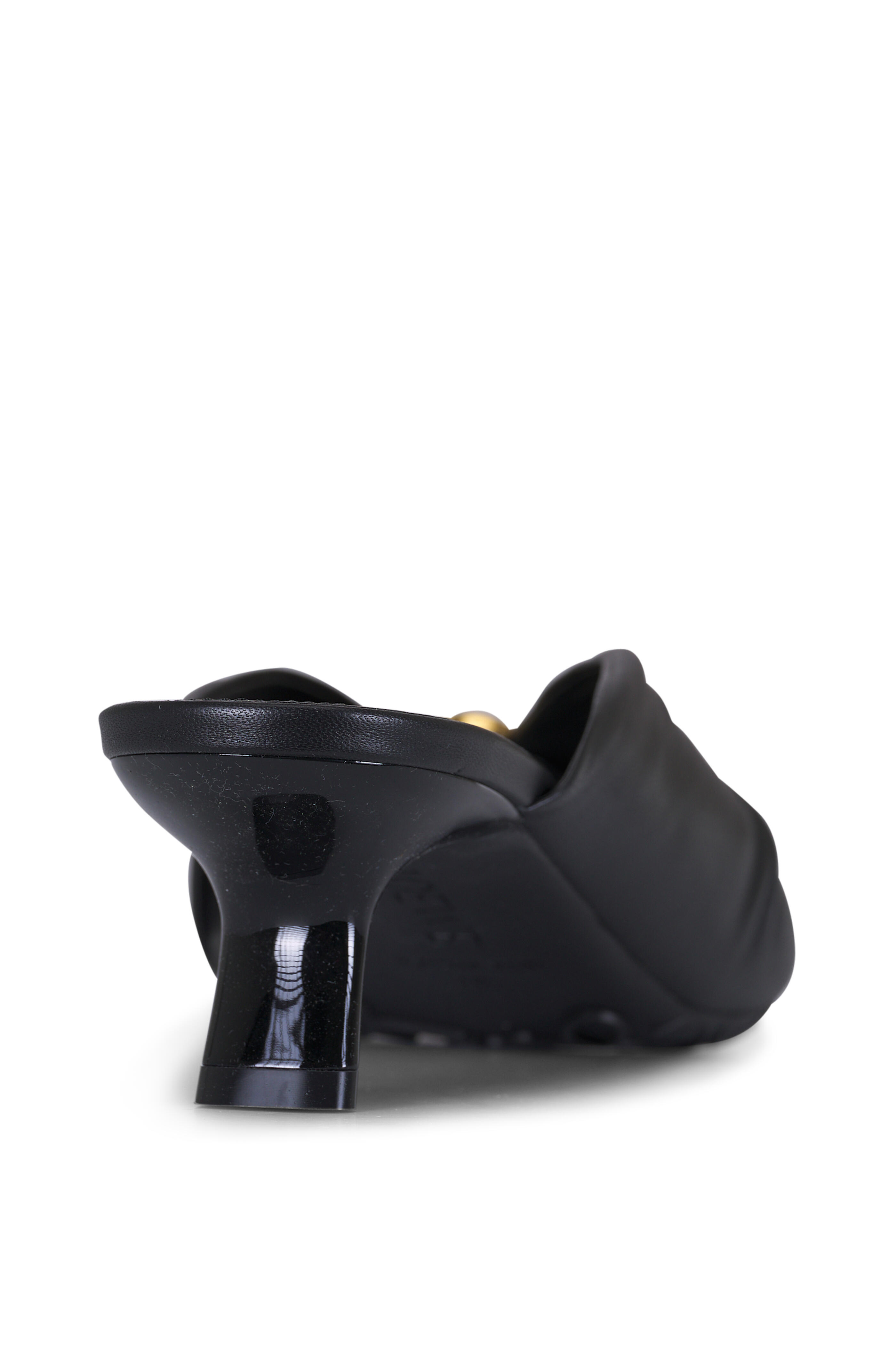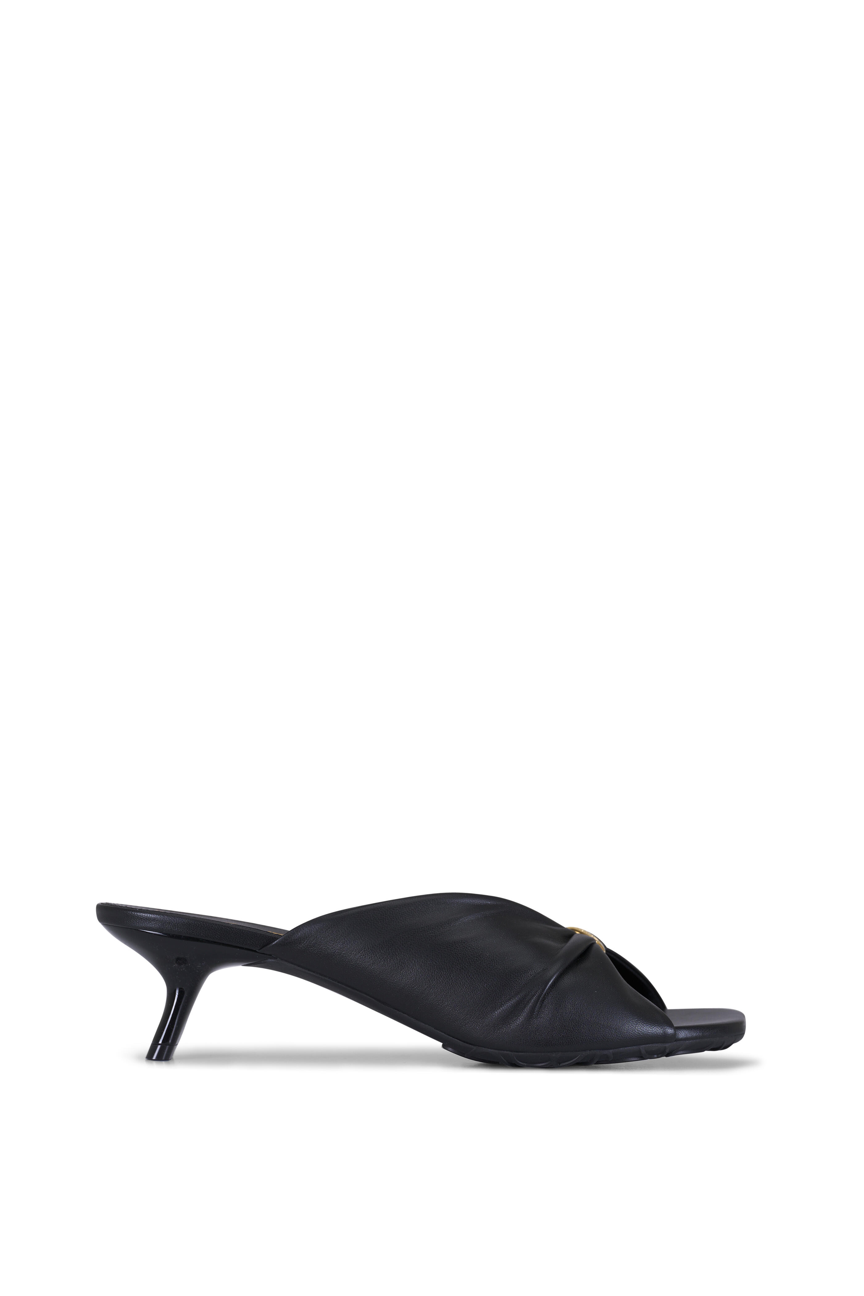 Leather upper. Open, petal toe. Metallic pebble with an Anagram engraved detail at vamp. Slide on style. Leather insole. Anagram embossed rubber outsole. Kitten heel. Made in Italy. Heel measurement: 45mm.