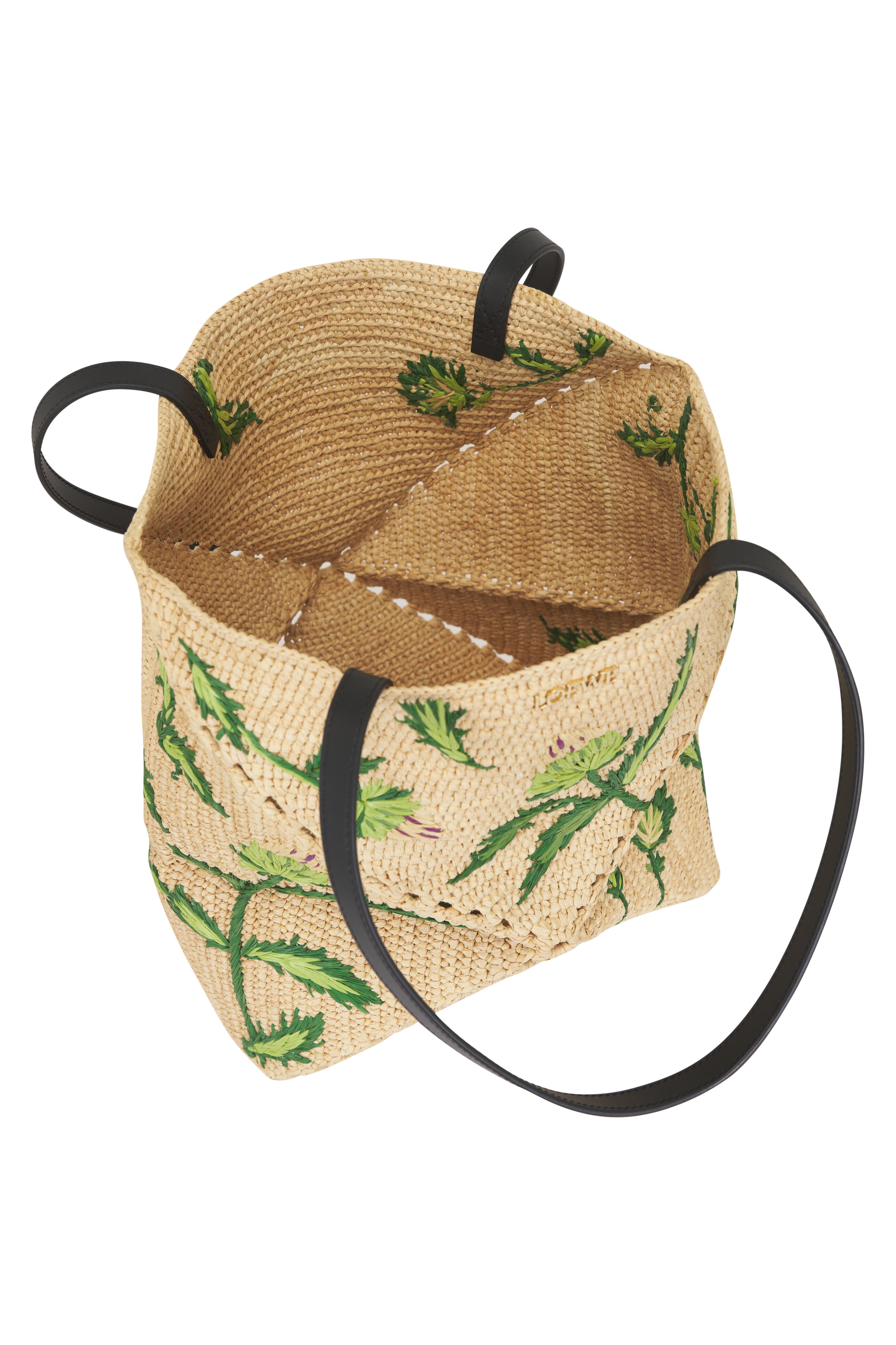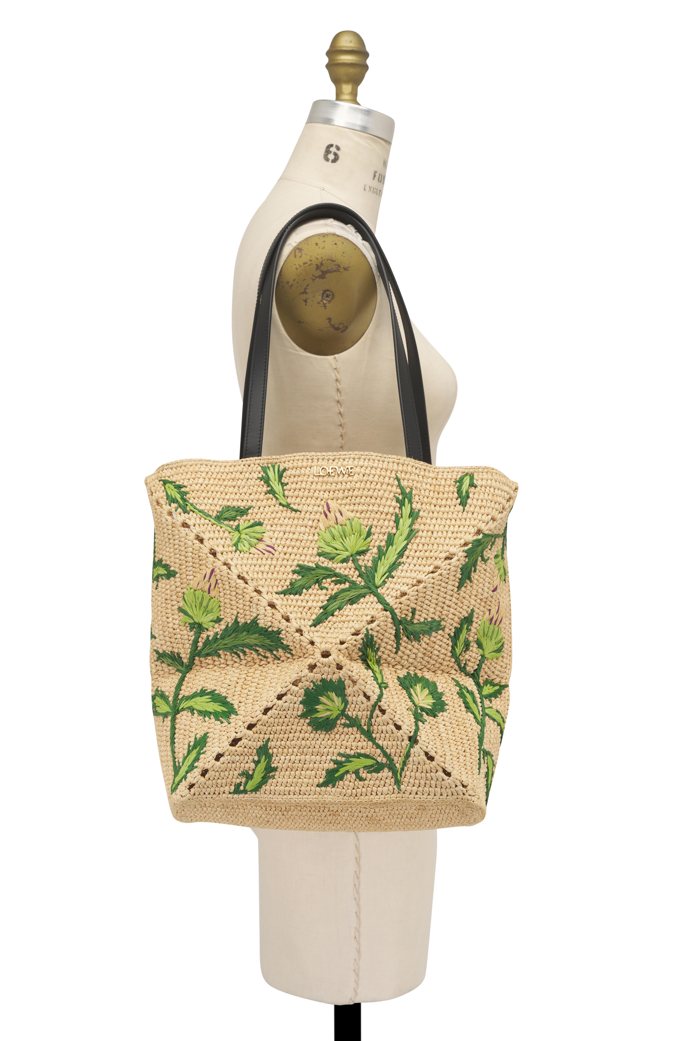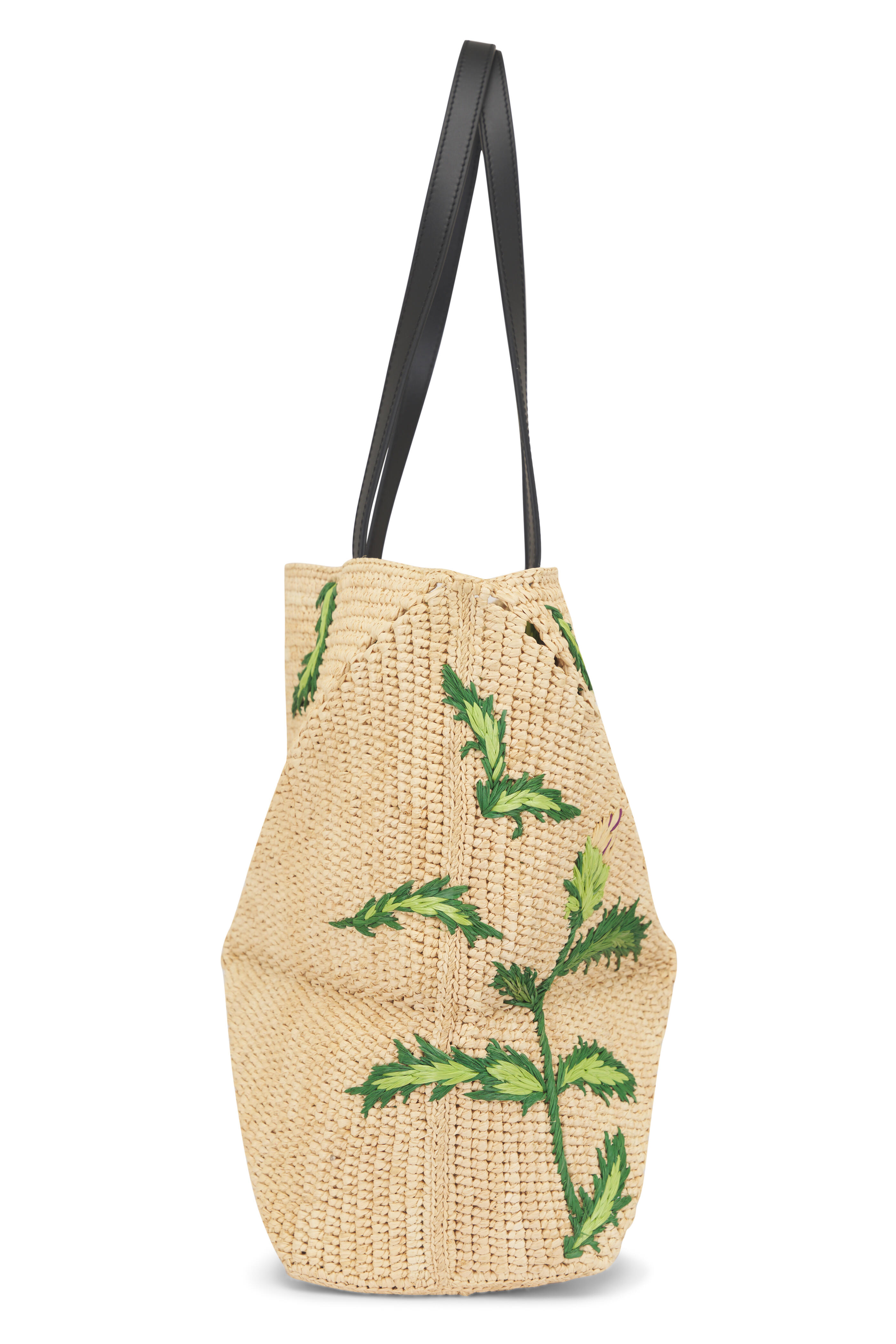 Raffia outer. Dual flat leather handles. Open top; one main compartment. Foldable design. Gold-tone embossed logo. Hand embroidered. Made in Spain. Height: 12.4". Width: 10". Depth: 5.7". Handle drop : 10.6".