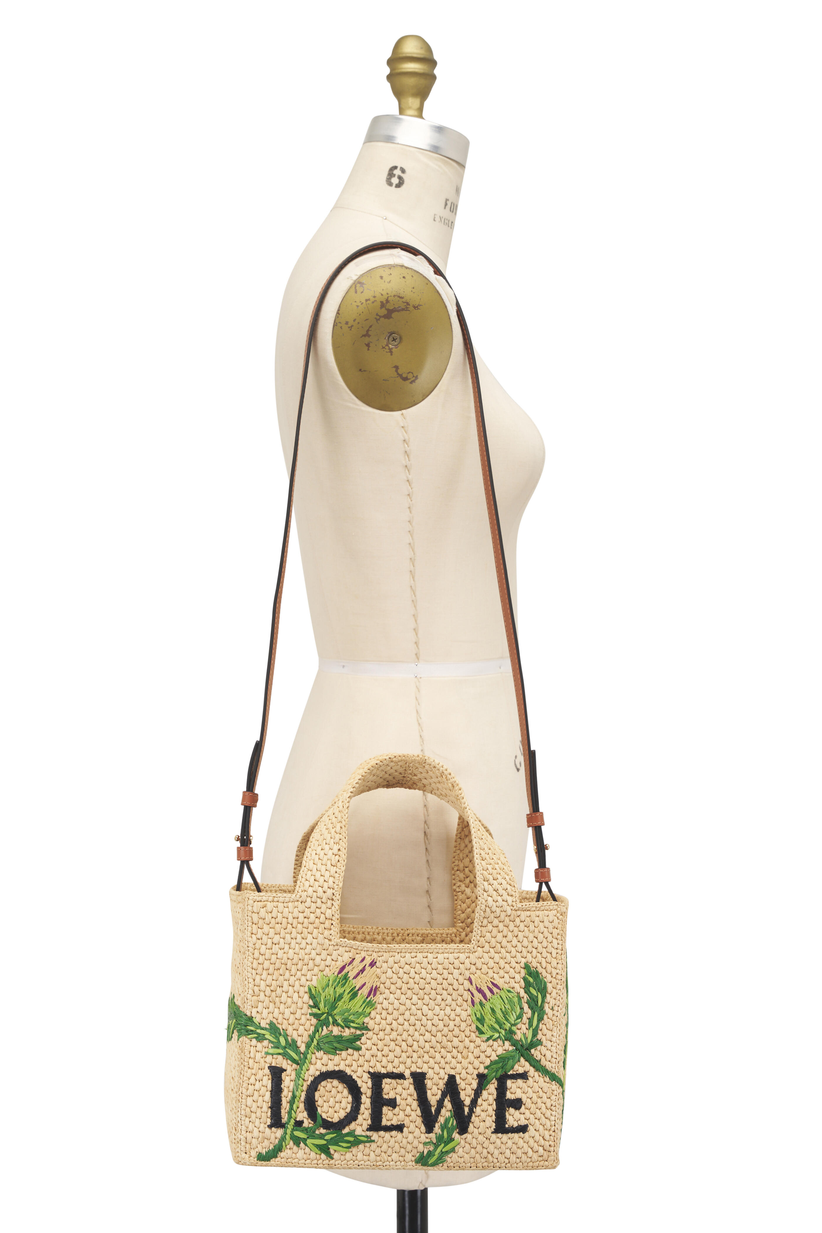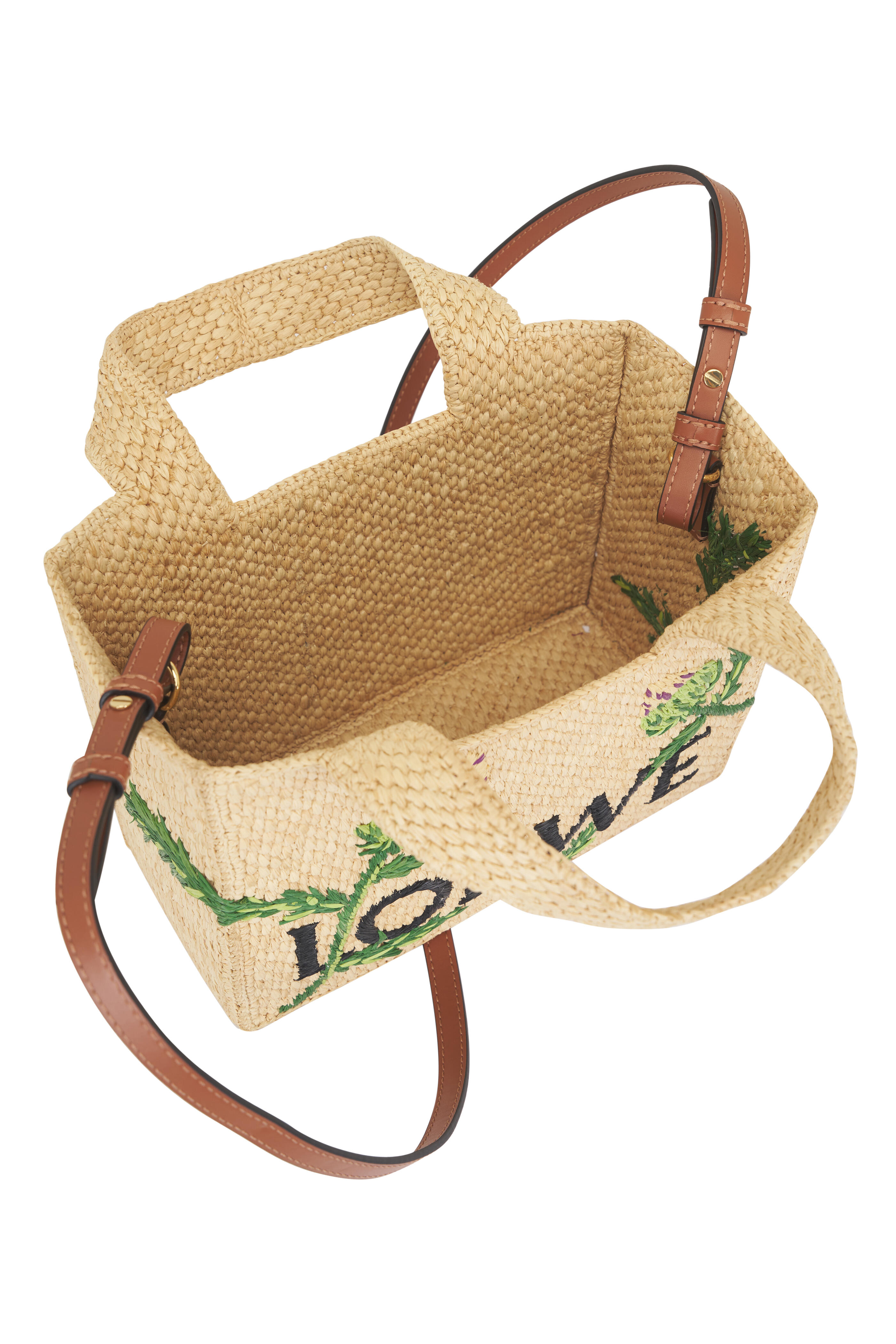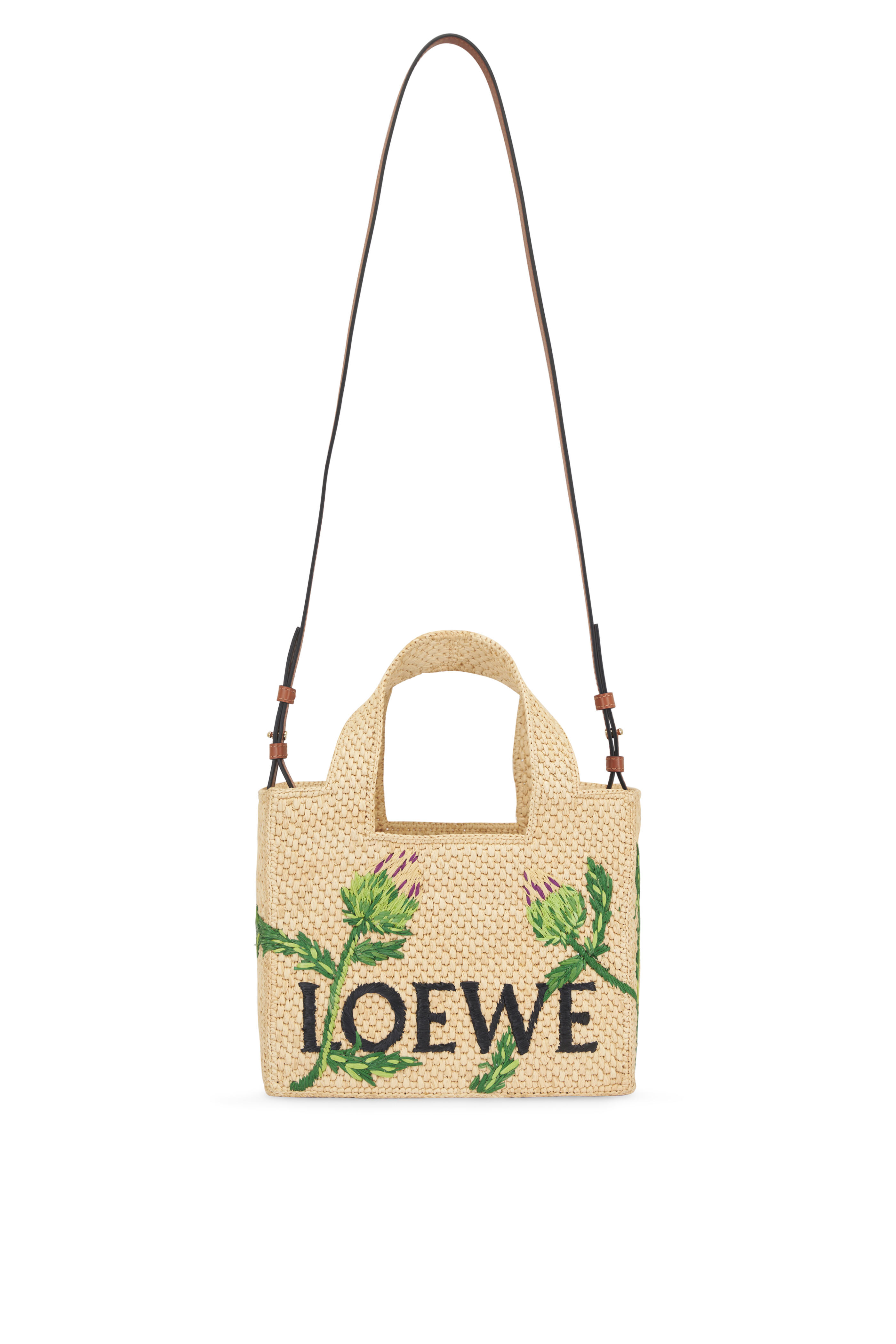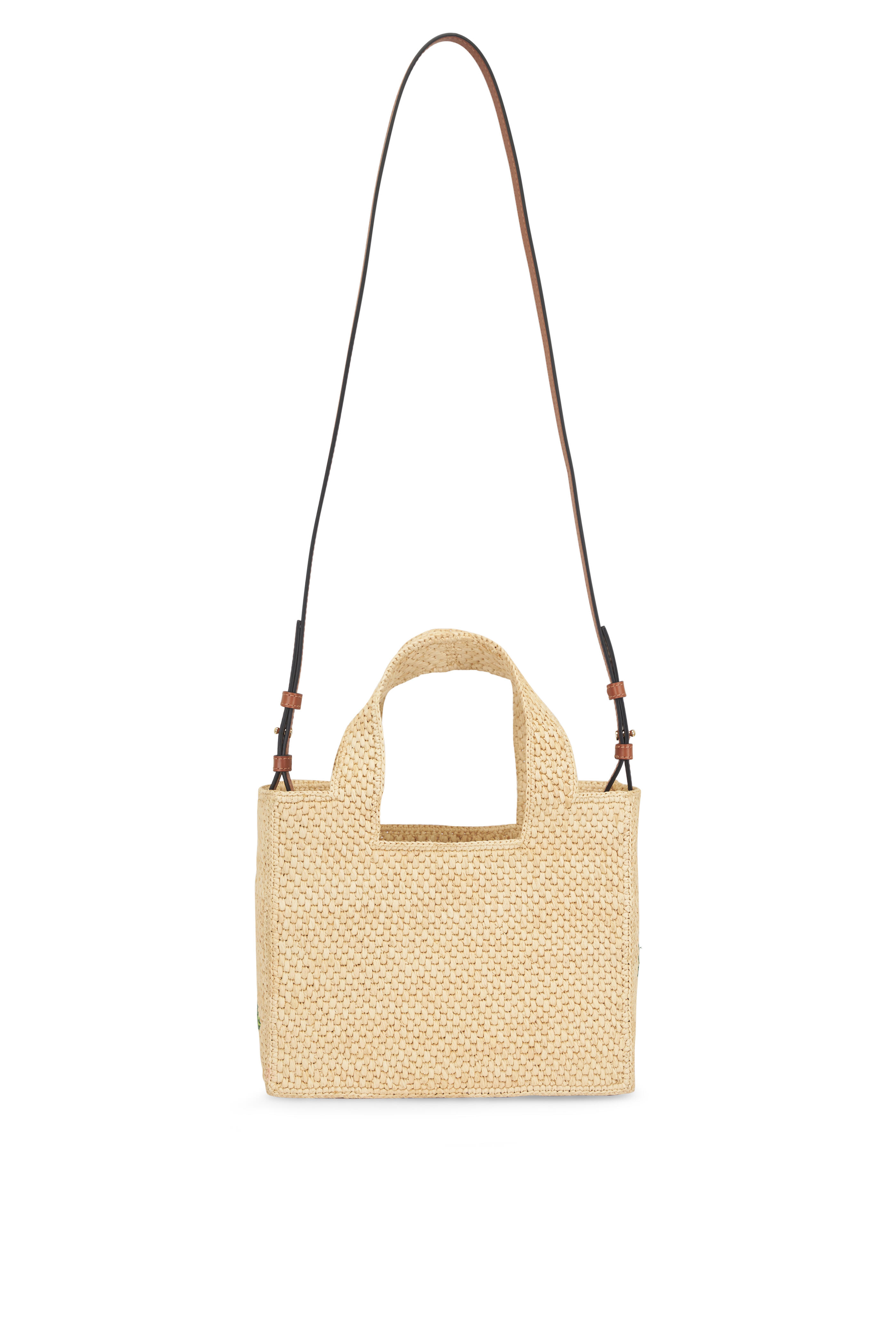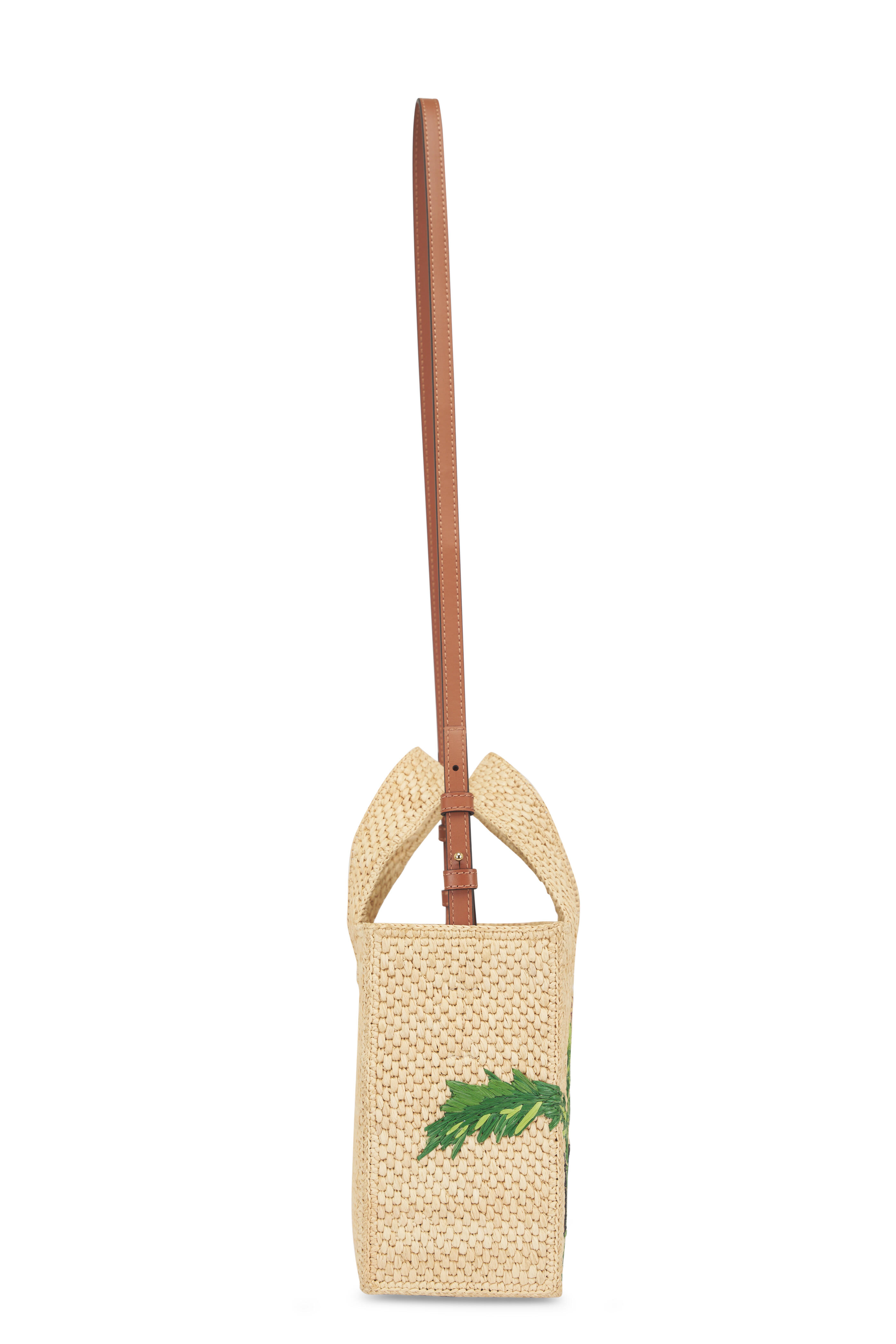 Embroidered raffia. Dual top handles. Detachable and adjustable strap. Unlined. Gold-tone hardware. Made in Madagascar. Height: 7.7". Width: 9.4". Depth: 4.3". Handle drop: 6.3". Strap length: 42.1" - 46.1". Strap drop: 20.5" - 22.4".