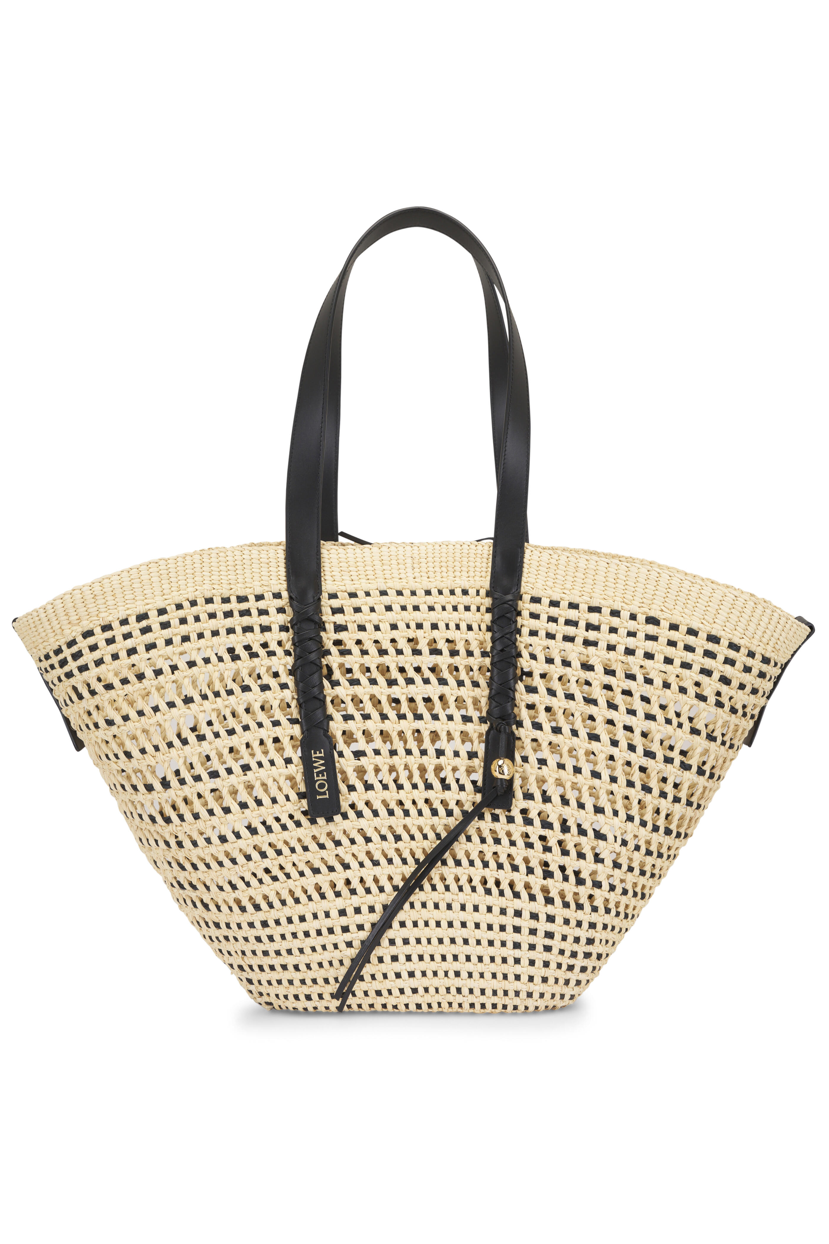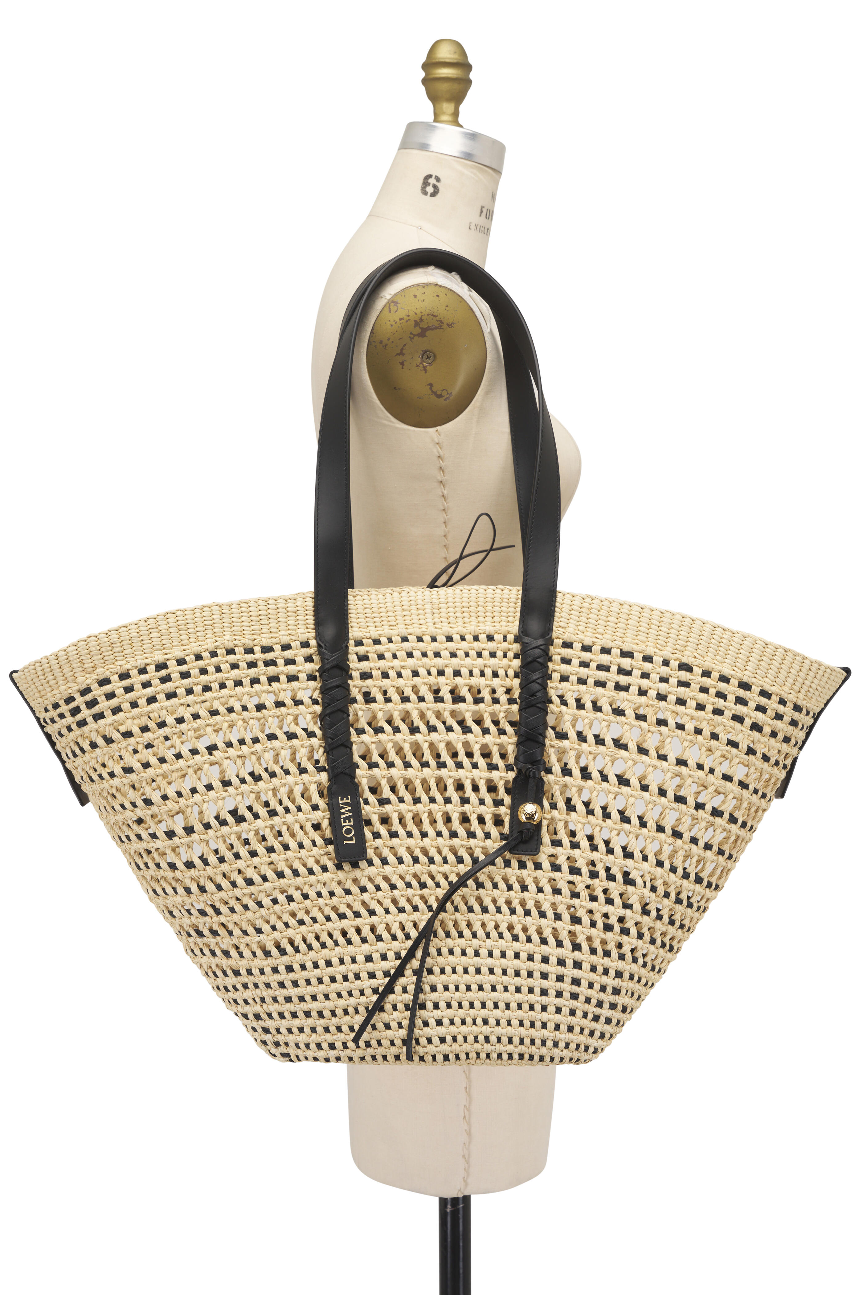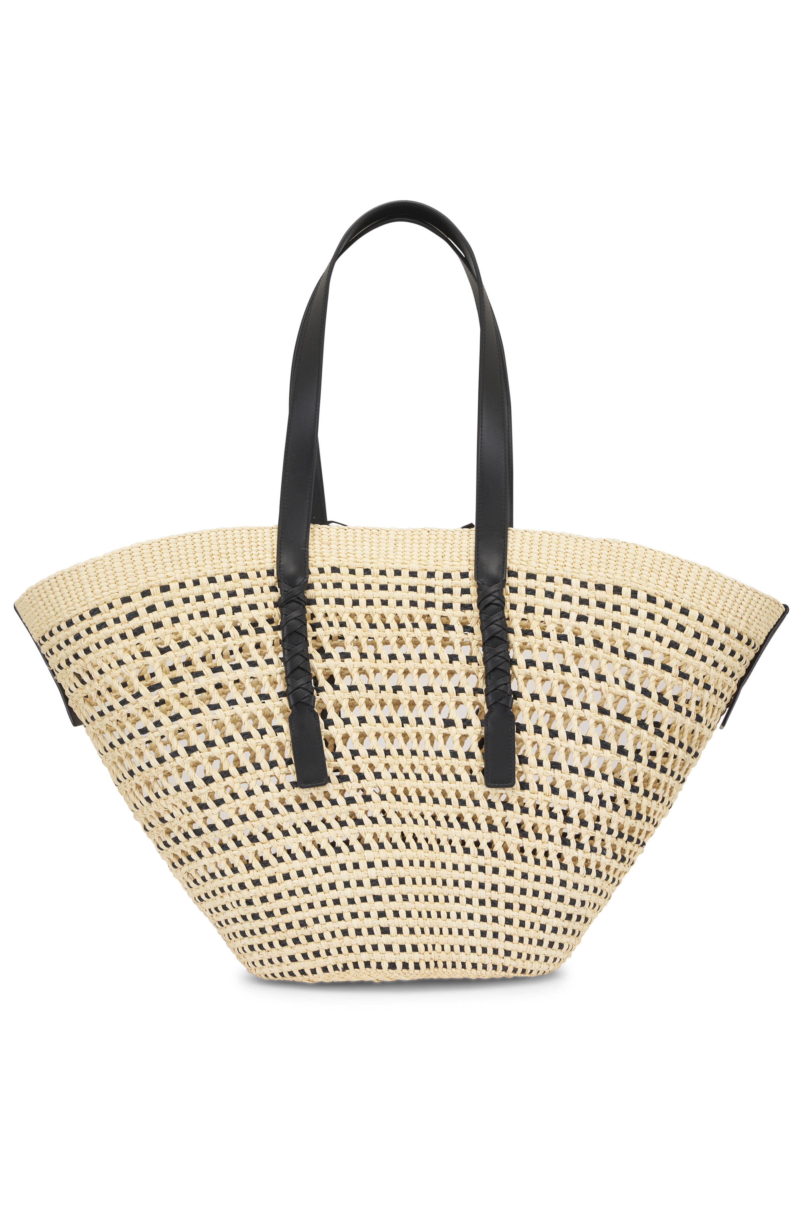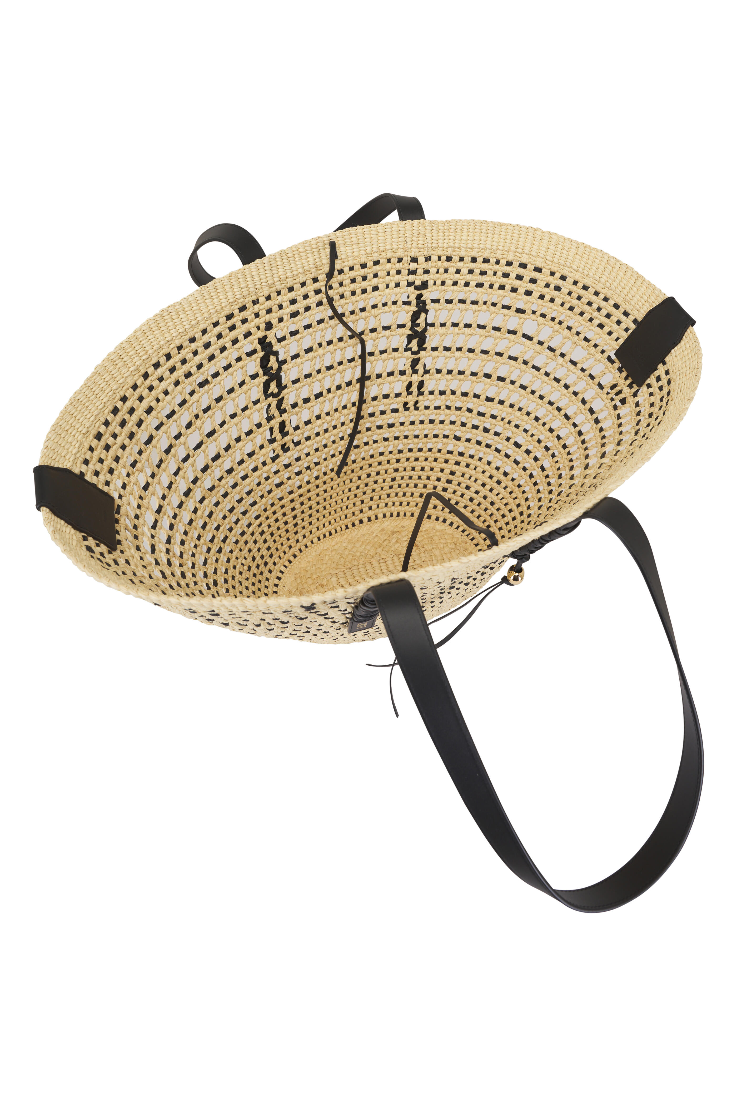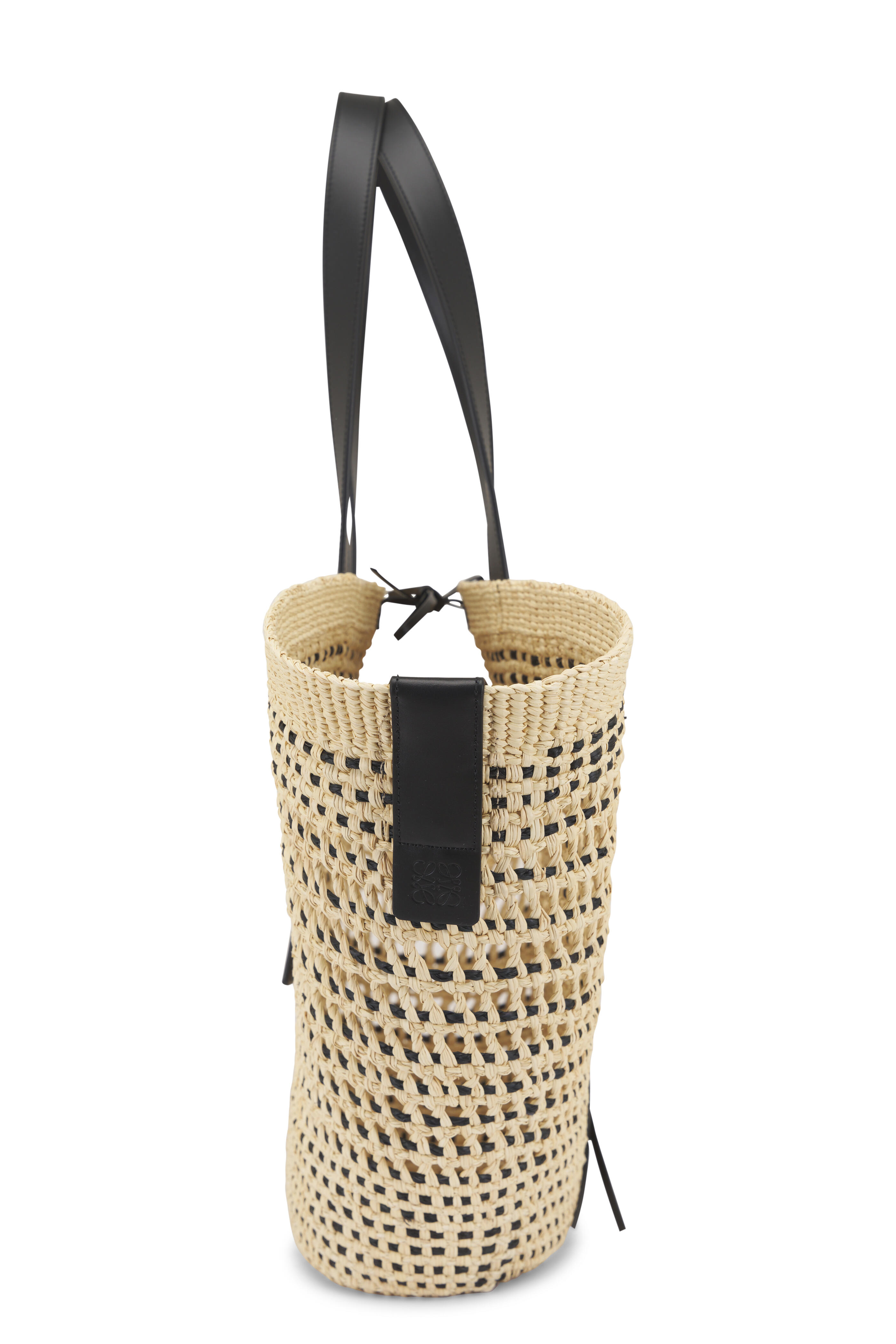 Iraca palm and calfskin leather outer. Unlined. Dual top handles. Calfskin tie closure. Removable Anagram Pebble dice. Gold embossed logo. Made in Spain. Height: 14.6". Width: 24.4". Depth: 9.8". Handle drop: 10.2".
