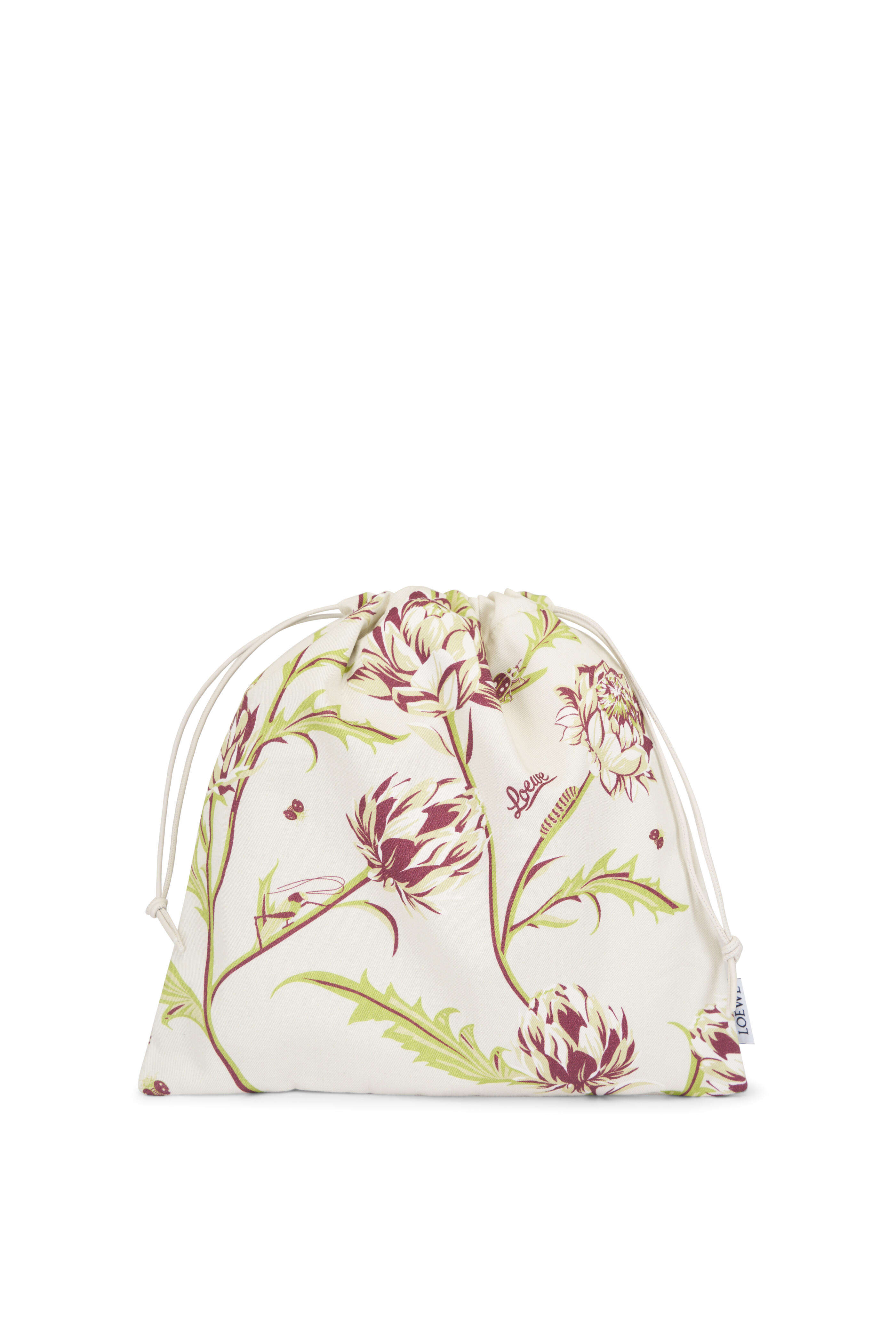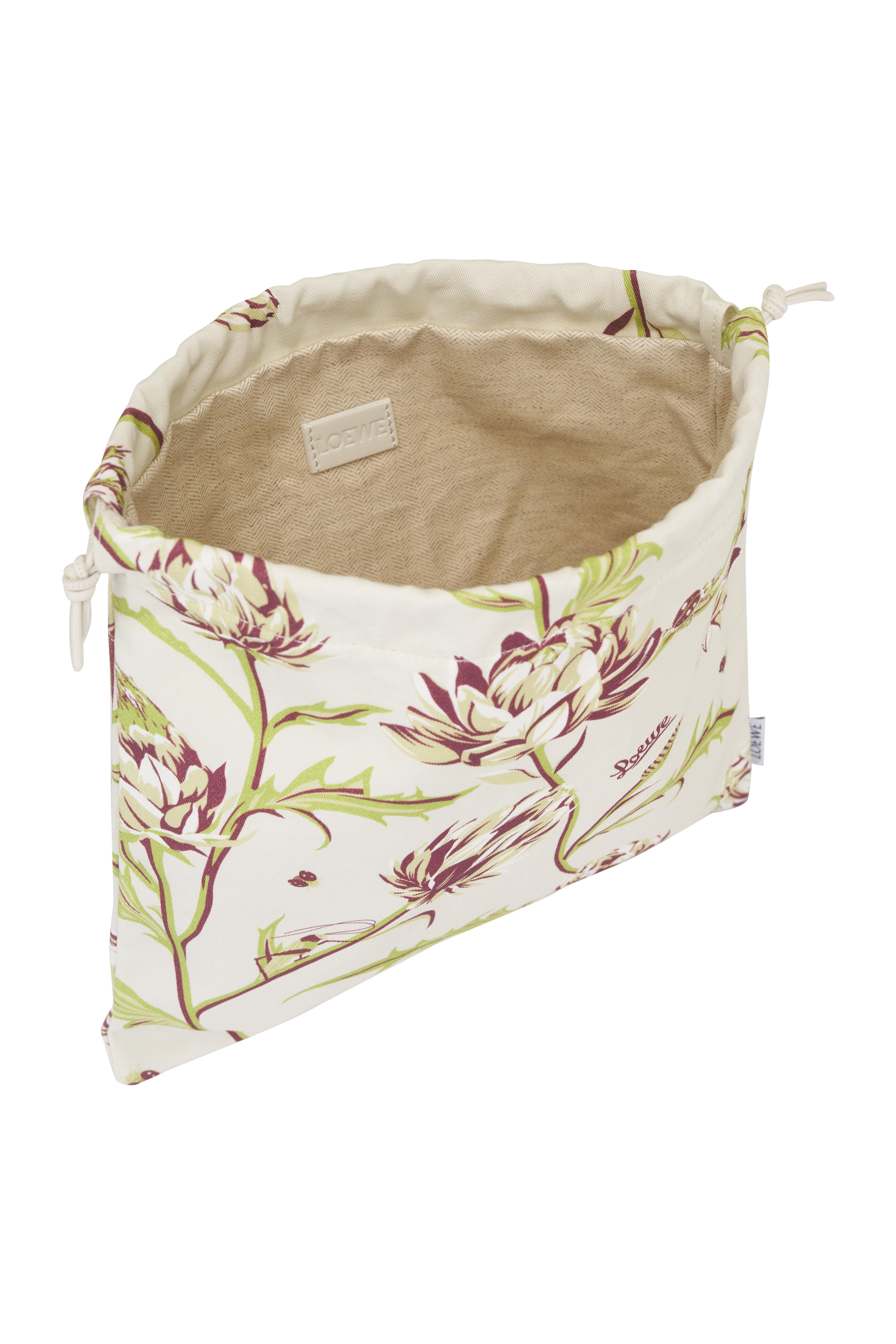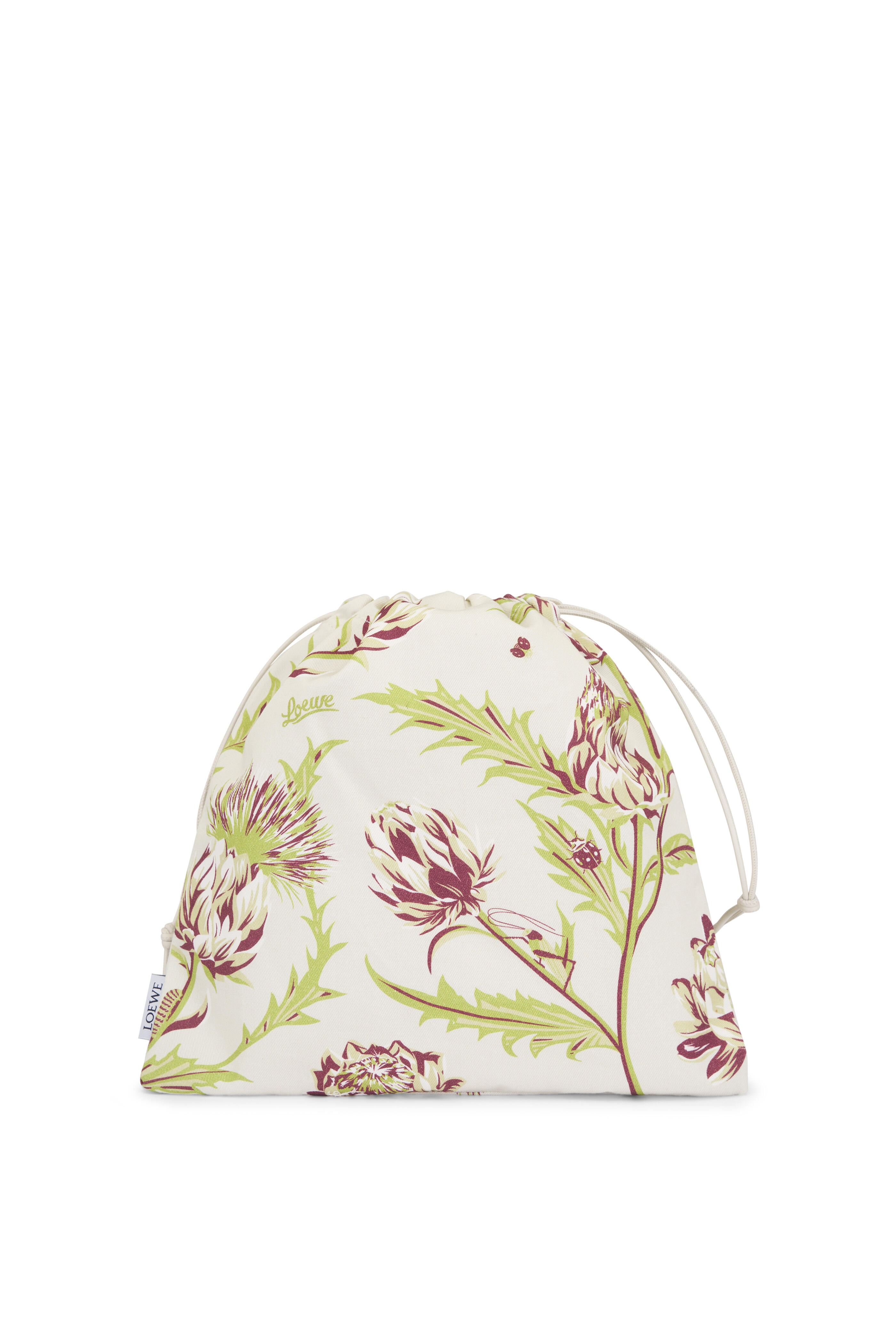 Cotton textile. Calfskin leather drawstring pulls. Made in Spain. Height: 9.8". Width: 10.2". Depth: 1.1".