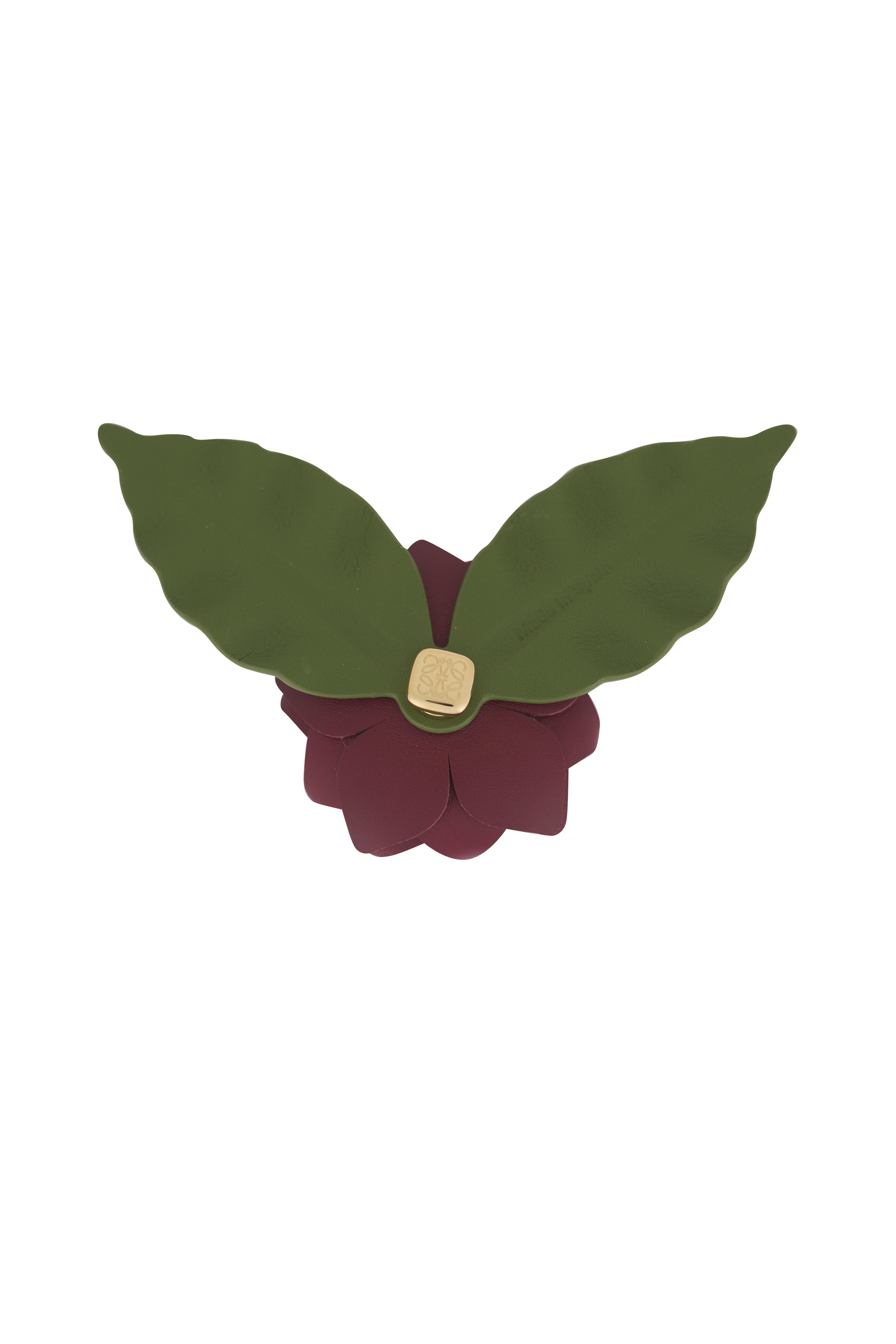 Leather & gold brass. Locking pin back. Made in Spain. Can be attached to bags and straps.