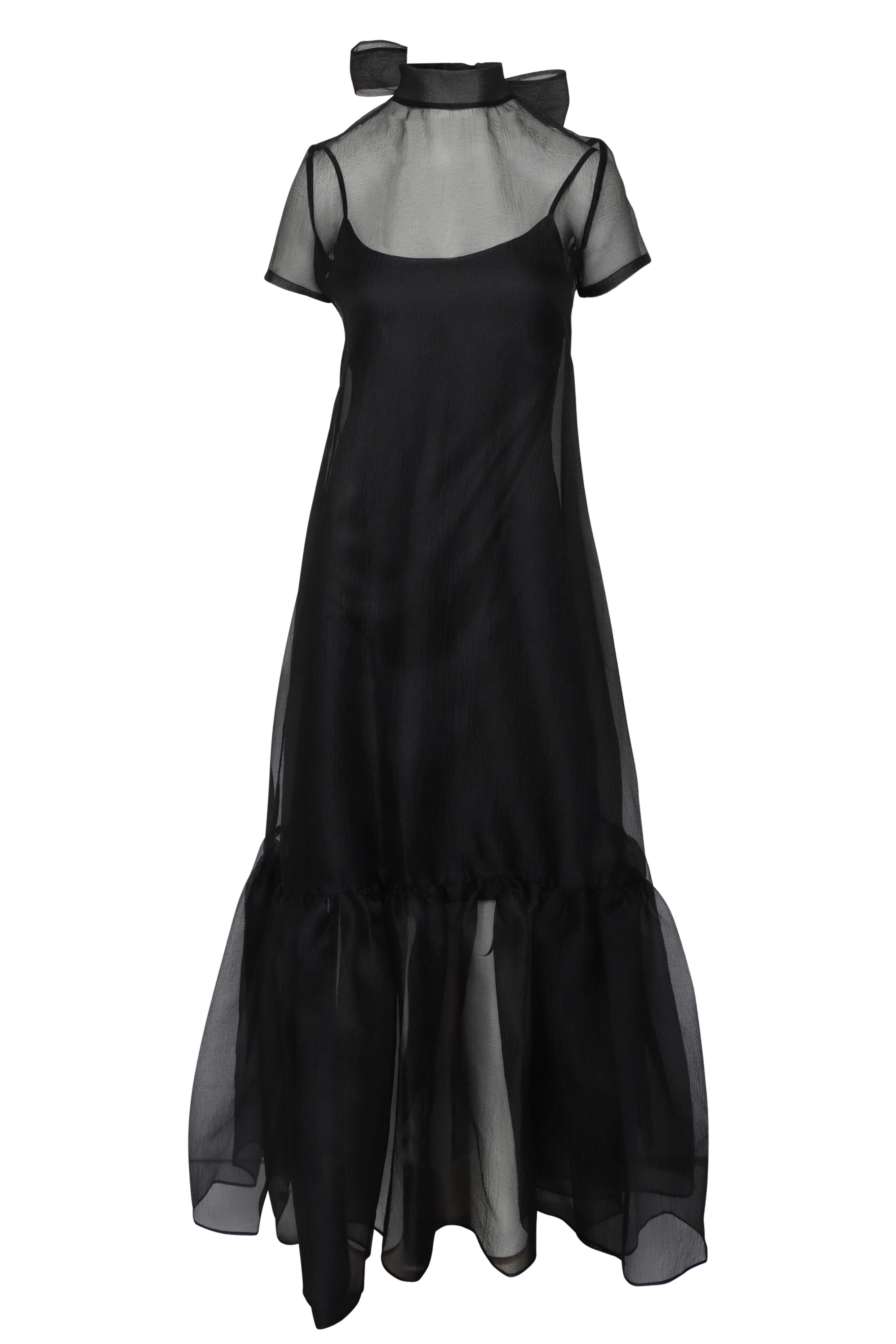 Mockneck; back tie closure. Short sleeves. Open upper back detail. Concealed back zip closure. Columnar silhouette. Flounce hem. Sheer fabrication. Imported. Maxi length. 100% polyester outer, 95% polyester, 5% elastane lining/ slip. Dry clean.