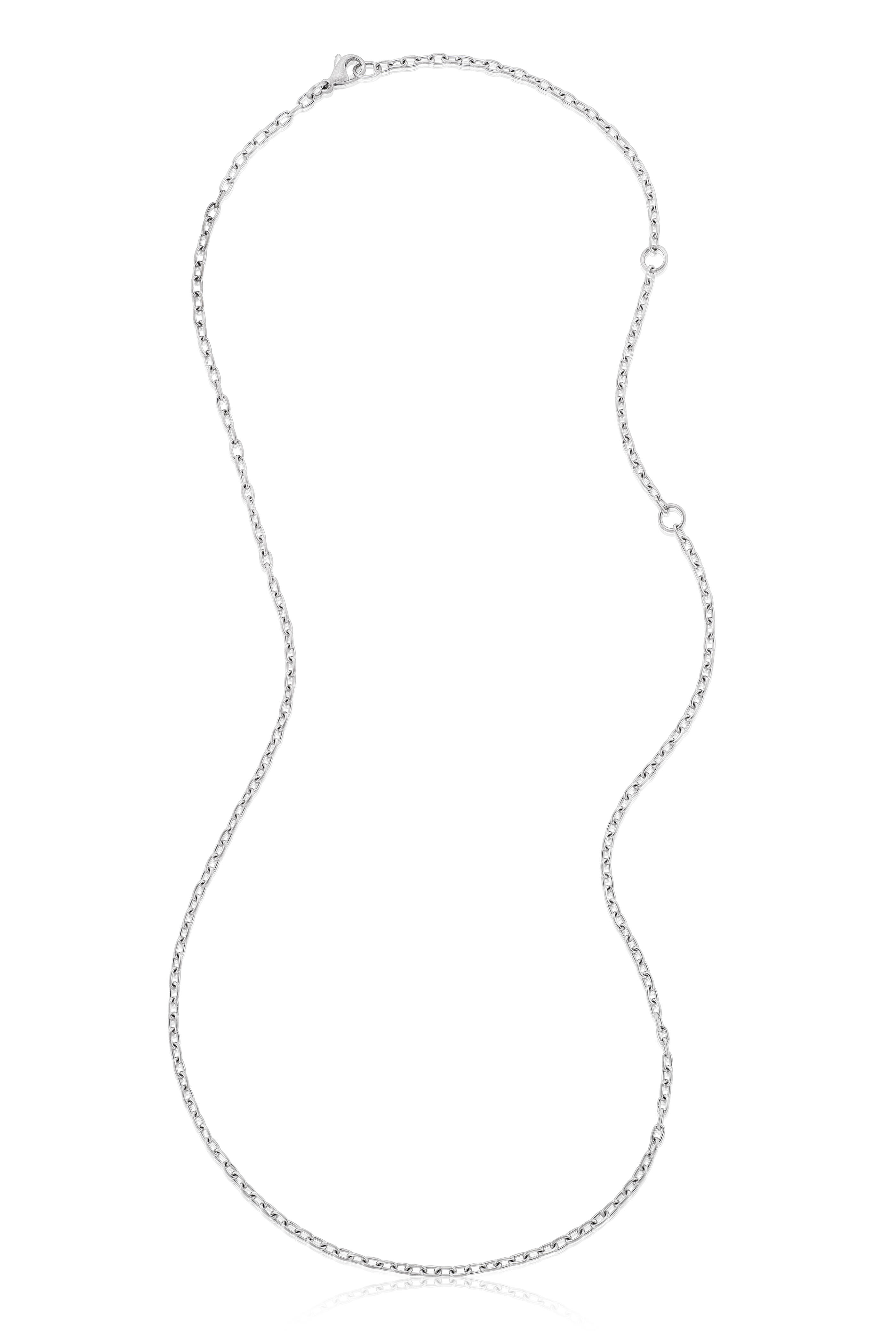 Minimalist yet refined, this handmade chain in 18-karat white gold is beautifully finished with a matte satin finish. At 21-inches with adjustable rings at 16 & 18 inches, it is designed to perfectly complement the Bezel 6-carat size mosaic diamond pendant or pendants of your choice, offering versatility for both day and evening wear. A timeless foundation piece.