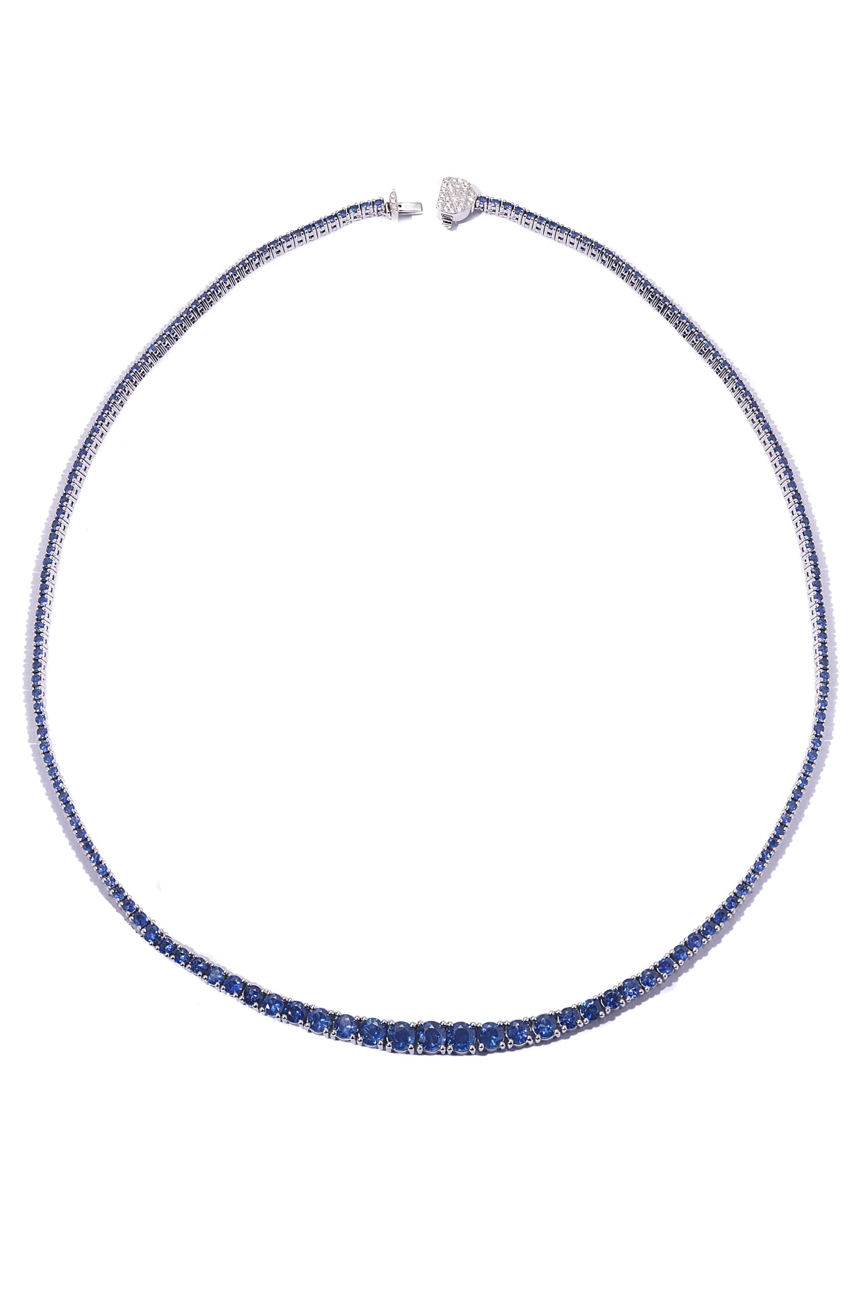 This Riviera necklace features 7.98 carats of vivid blue sapphires that taper in size for a flattering curve. Set in grey and white rhodium-plated 18-karat white gold, the necklace is secured with a custom N-shaped clasp adorned with pavé white diamonds. At 16 inches, it sits gracefully on the collarbone—versatile, vibrant, and eternally classic.