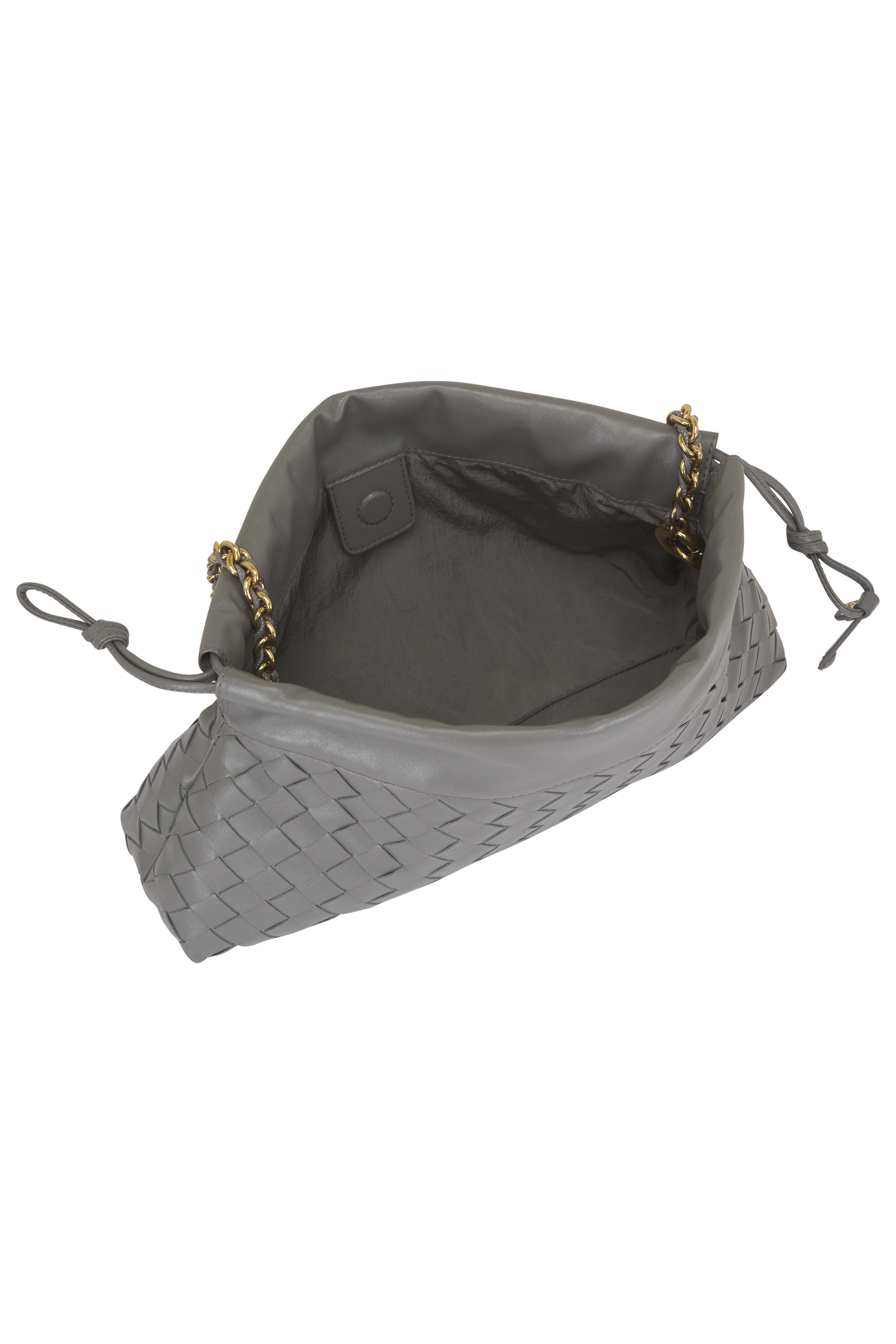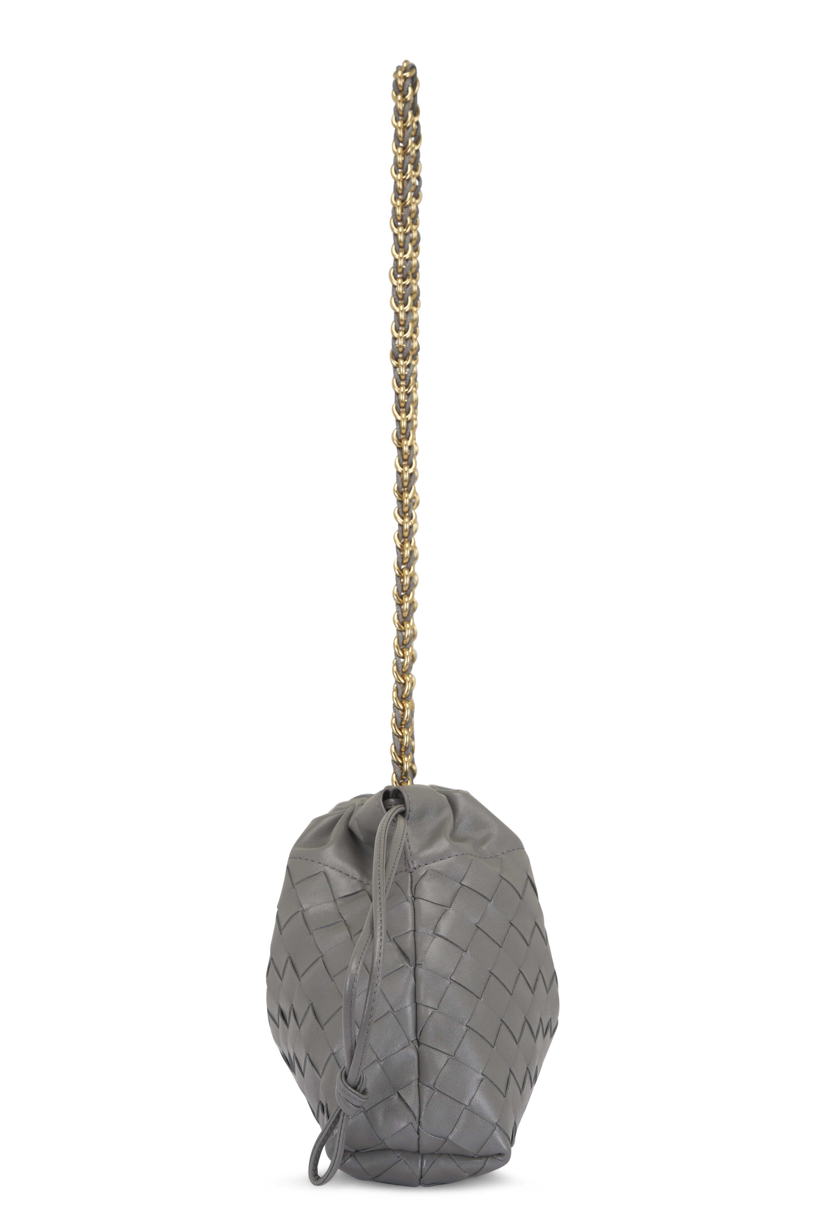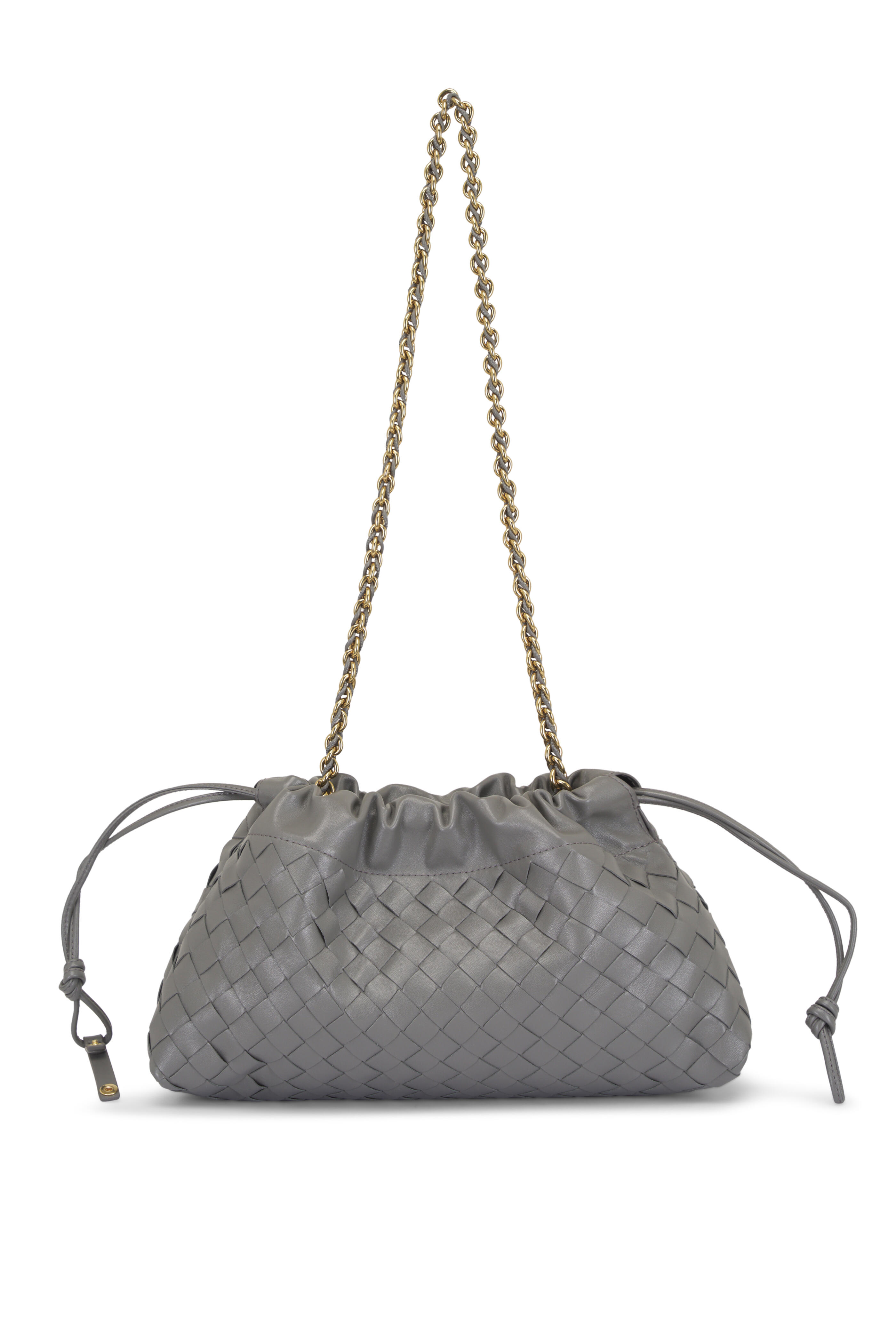 Intrecciato calfskin leather. Leather braided metal chain. Leather loop attachment. Drawstring closure. Single compartment. Nylon lining. Brass-finish hardware. Made in Italy. Height: 19 cm | 7.5". Width: 33 cm | 12.9". Depth: 8 cm | 3.2". Strap drop: 42 cm | 16.5". Fits iPhone 17 Pro Max, a credit card case, airpods and keys.