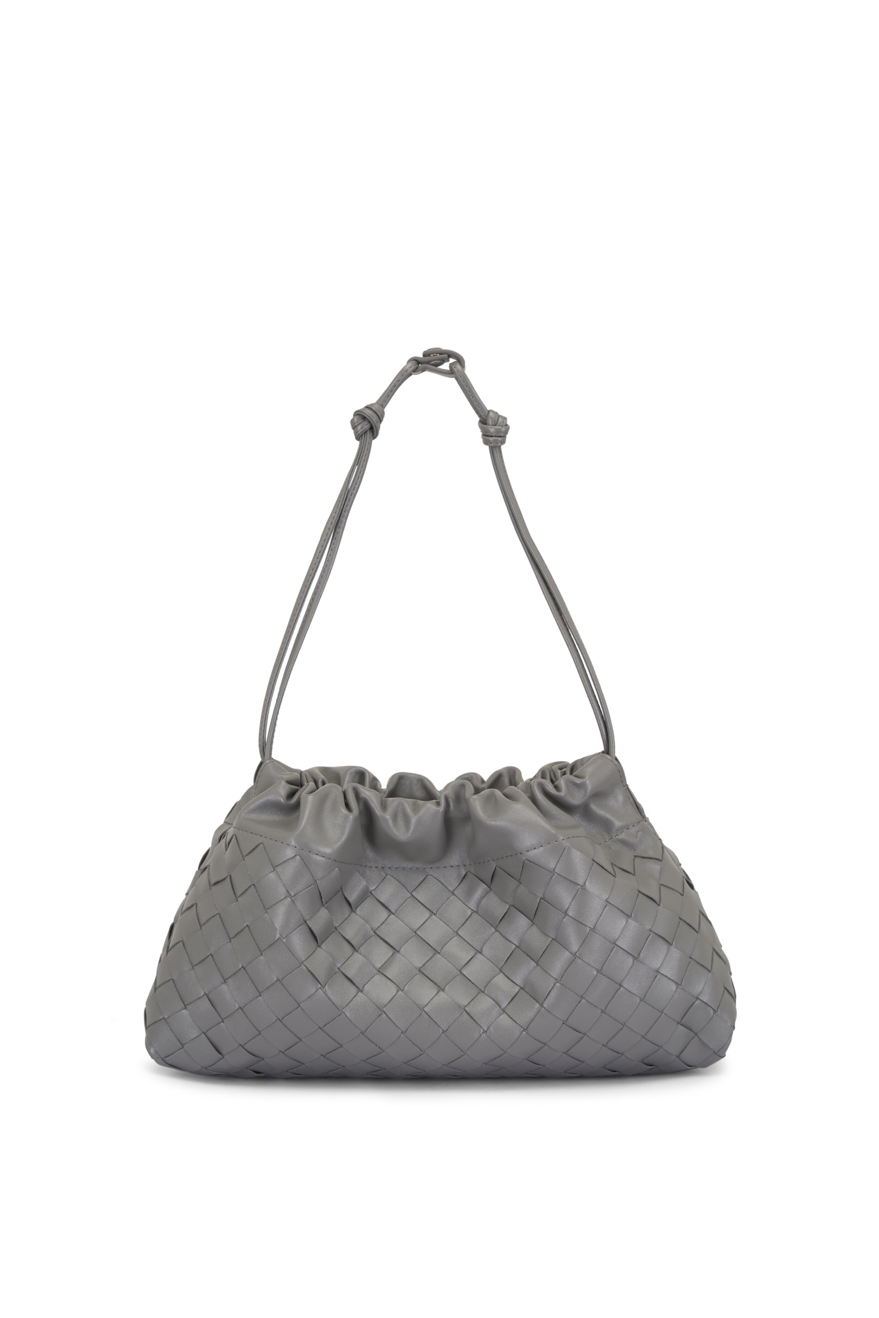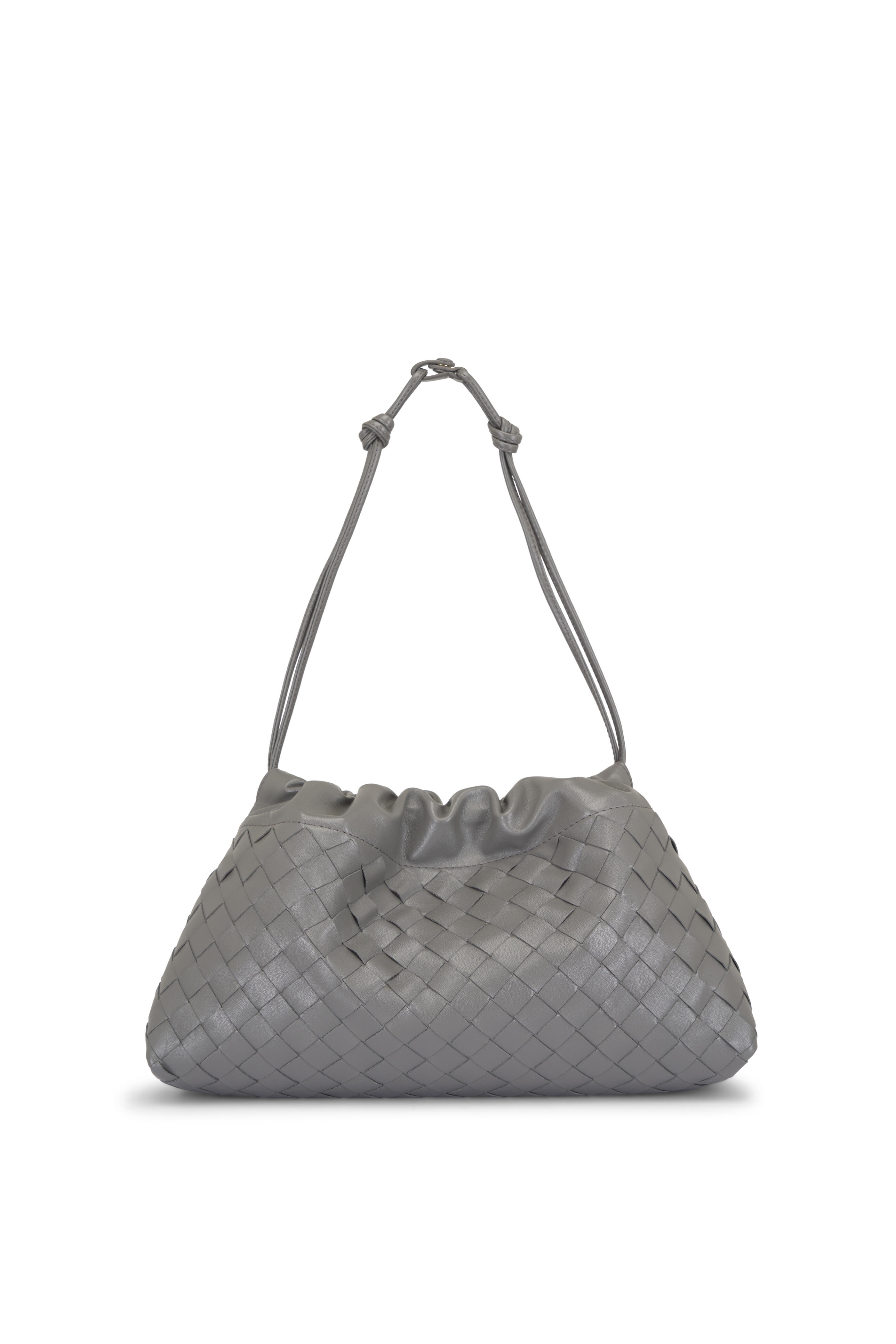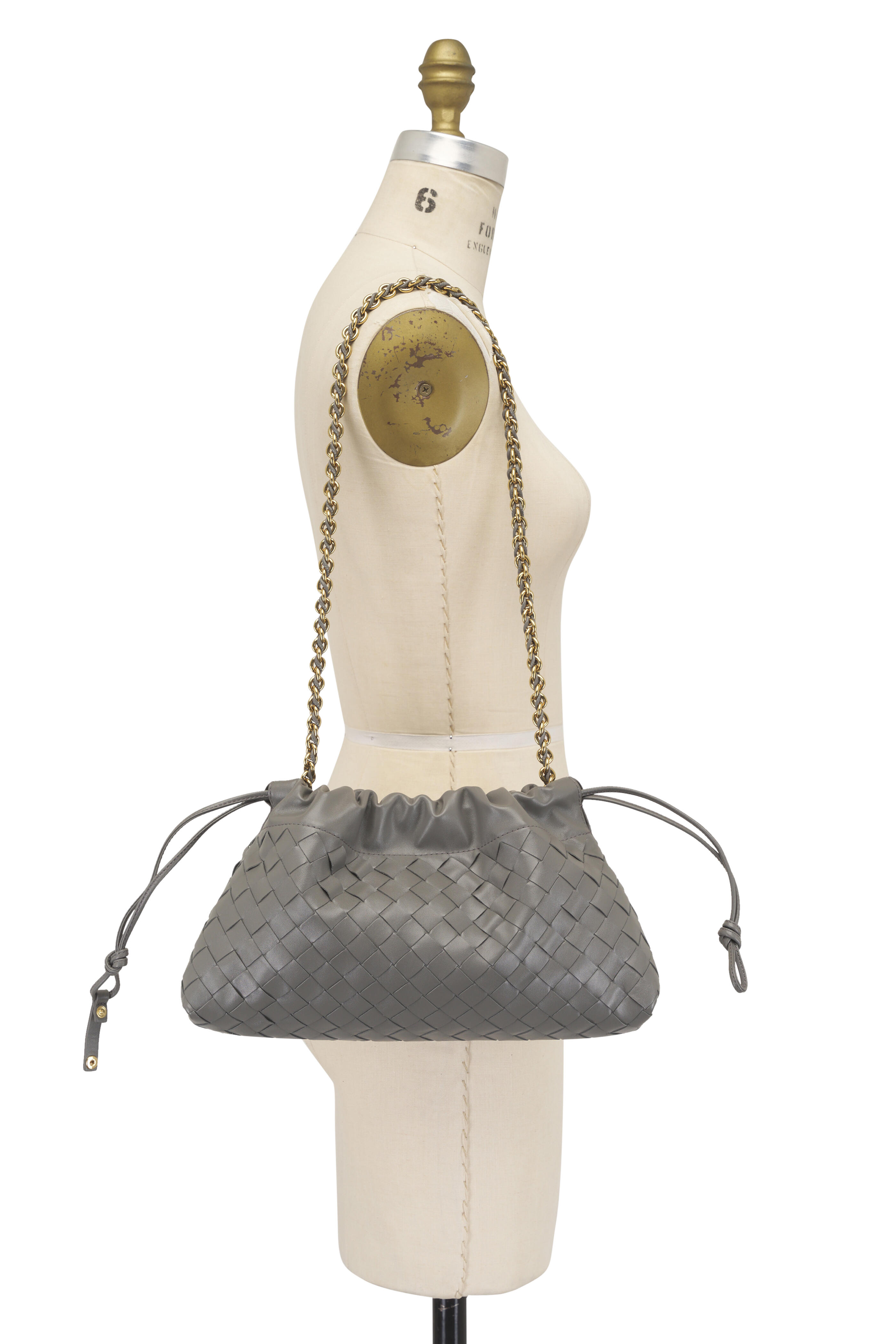 Intrecciato calfskin leather. Leather braided metal chain. Leather loop attachment. Drawstring closure. Single compartment. Nylon lining. Brass-finish hardware. Made in Italy. Height: 19 cm | 7.5". Width: 33 cm | 12.9". Depth: 8 cm | 3.2". Strap drop: 42 cm | 16.5". Fits iPhone 17 Pro Max, a credit card case, airpods and keys.