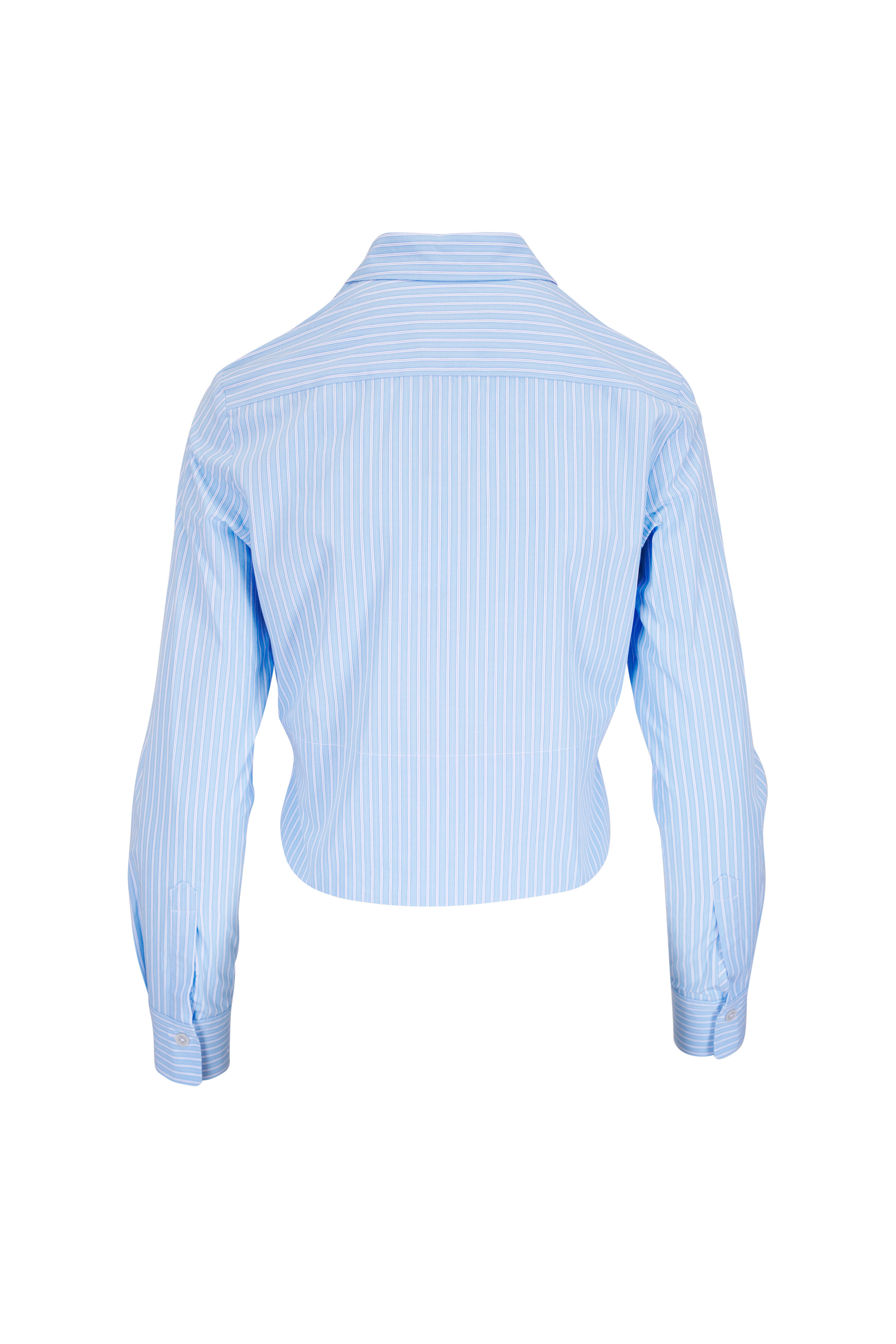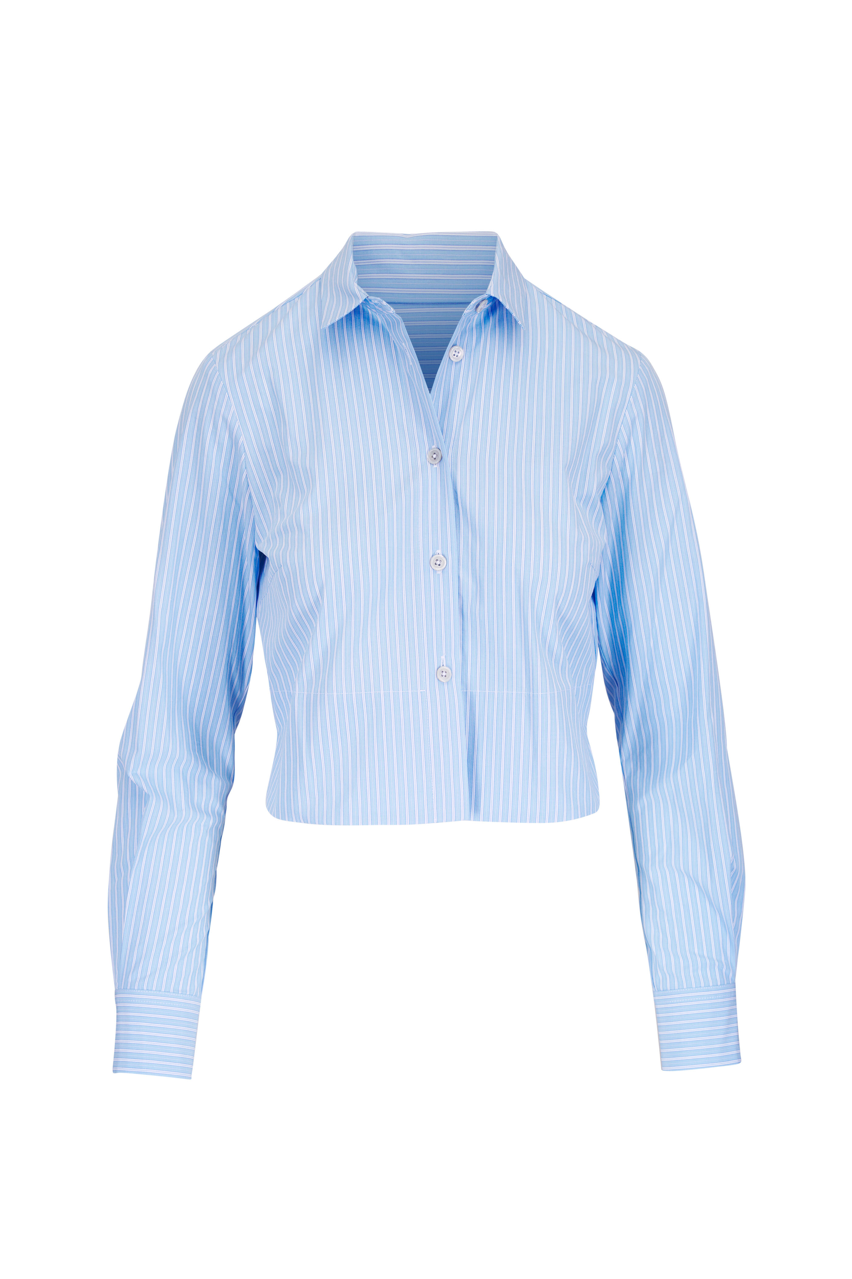Spread collar. Front button placket. Single button mitered cuffs. Vented hem. Imported. 18" shoulder to hem. 100% cotton. Dry clean.