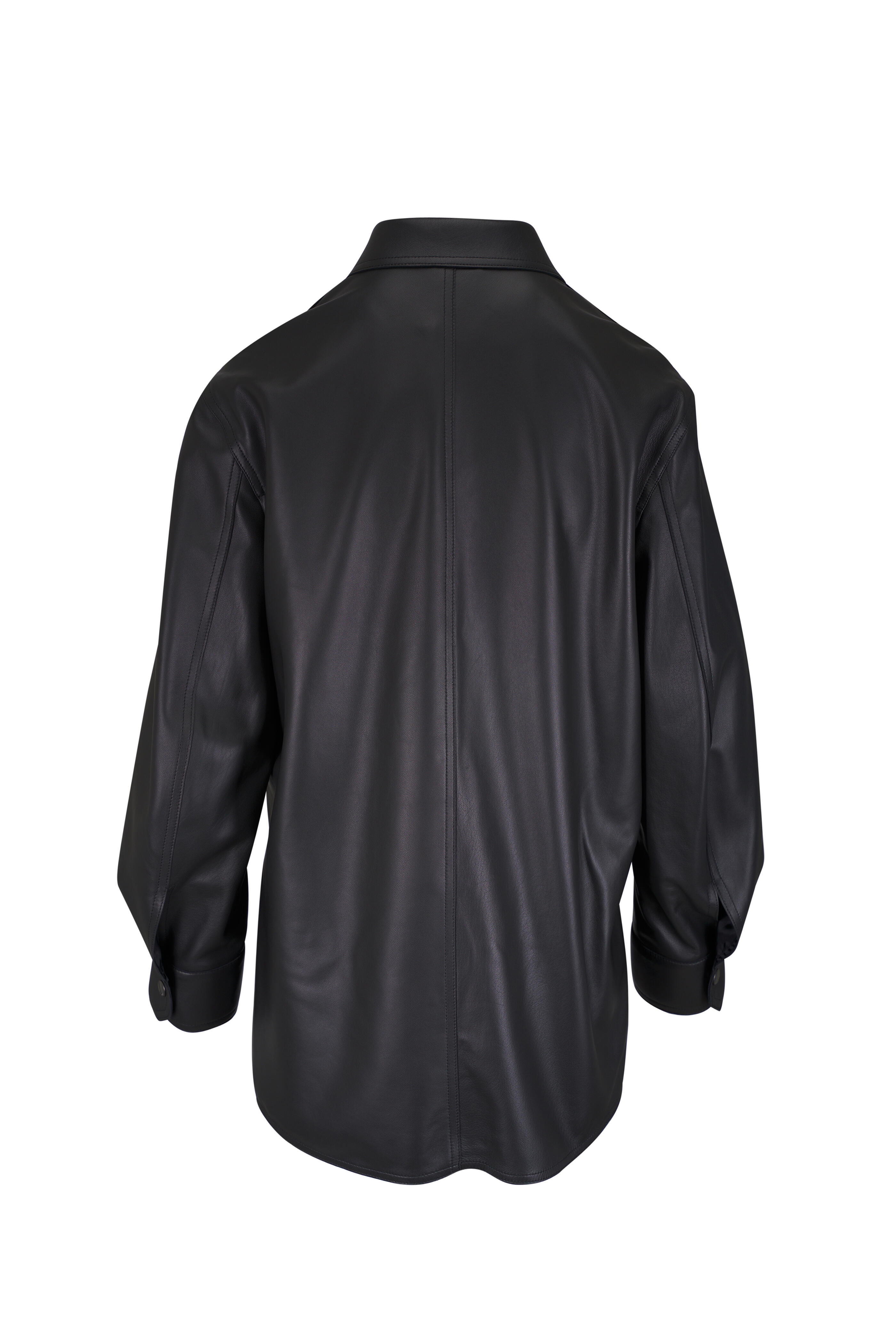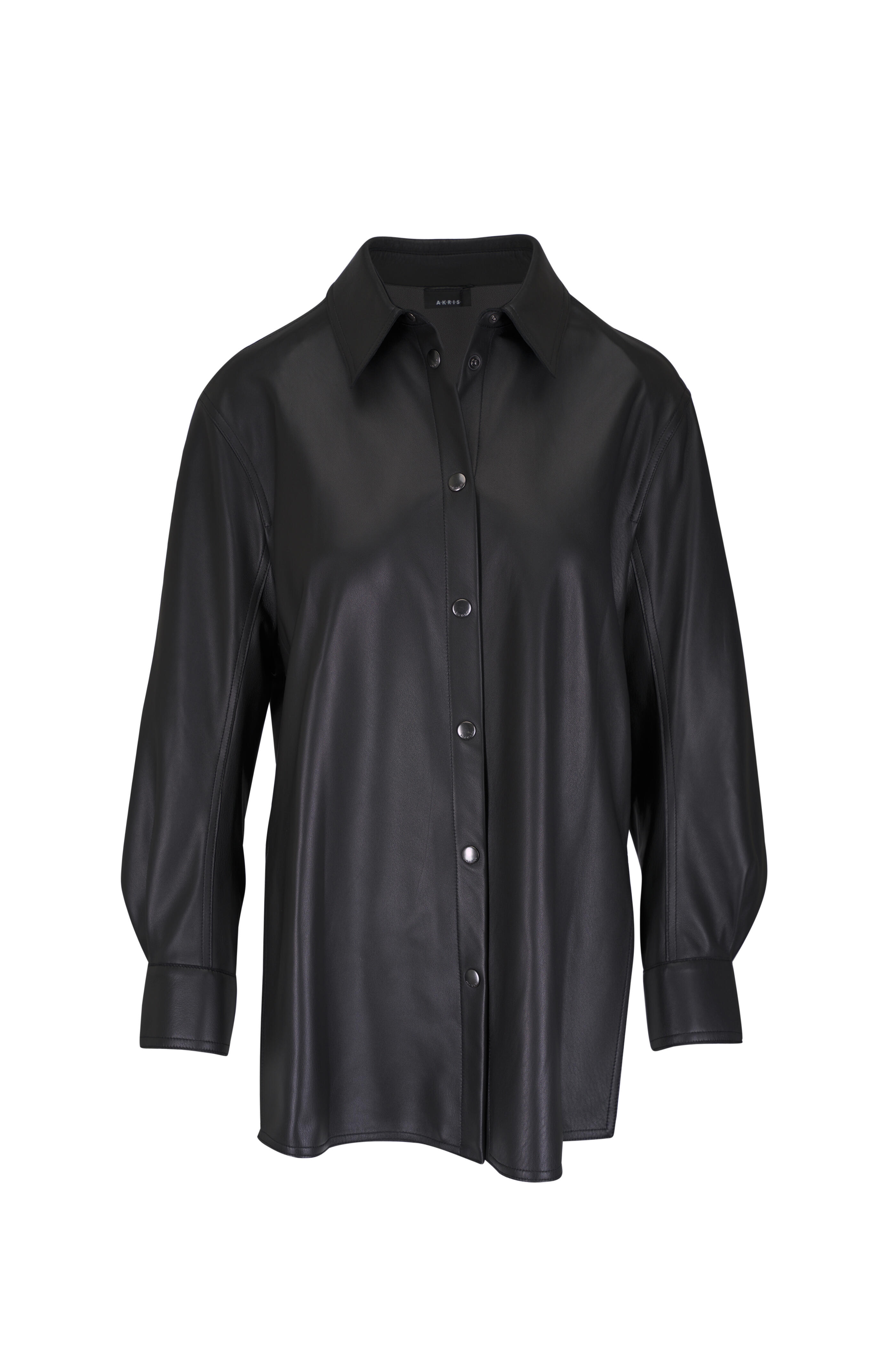 Specialist clean. Point collar. Front snap button placket. Single snap button mitered cuffs. Vented hem. Imported. Approx. 29" shoulder to hem (measurements taken from size 4). 100% nappa lambskin leather.