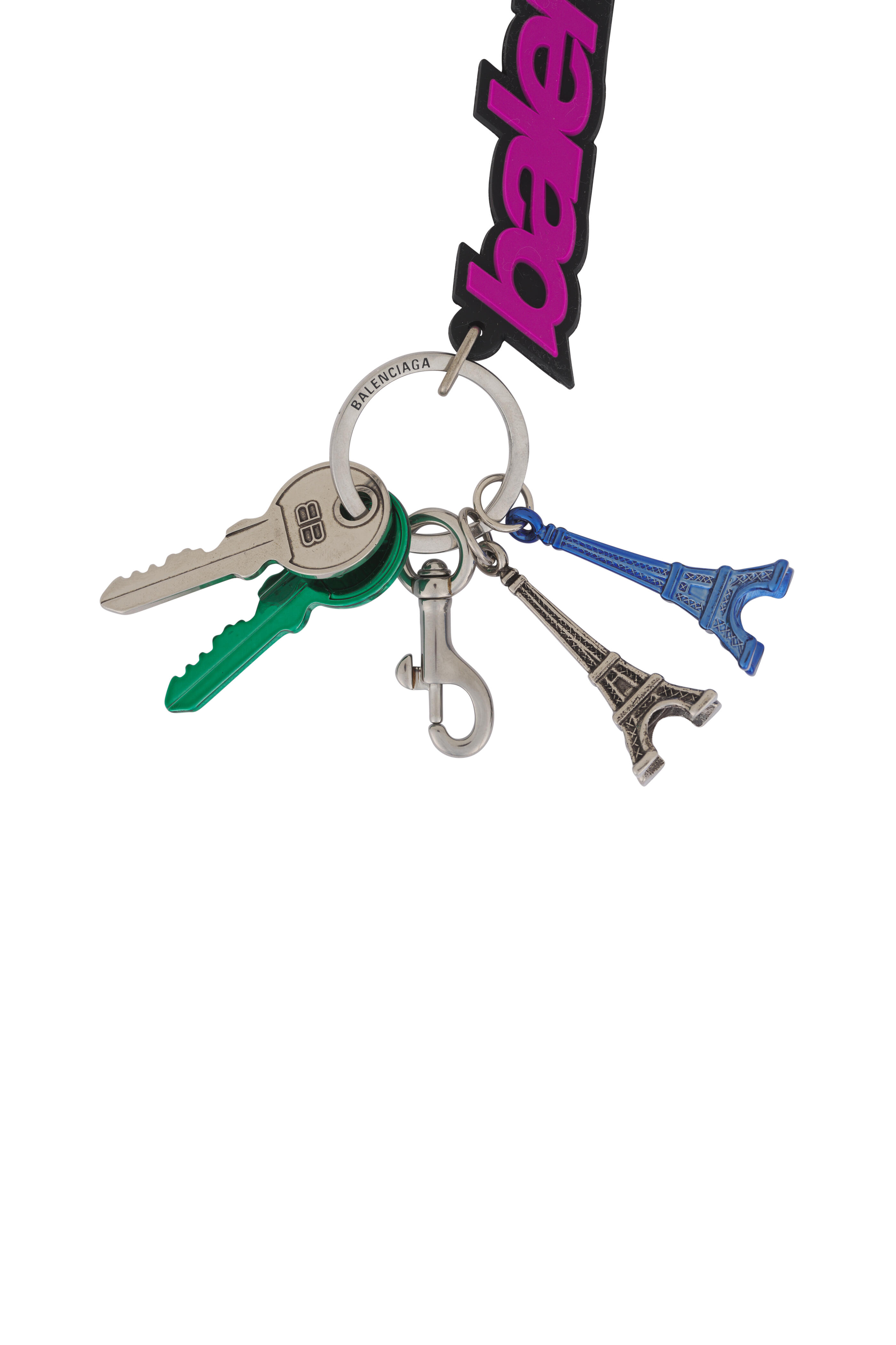TPU. One snapped hook. Aged-silver hardware. Engraved logos. Can be attached to the bag or be used as a Keychain. Made in Italy. Length: 9.4". Height: 1.6". Width: 0.6".