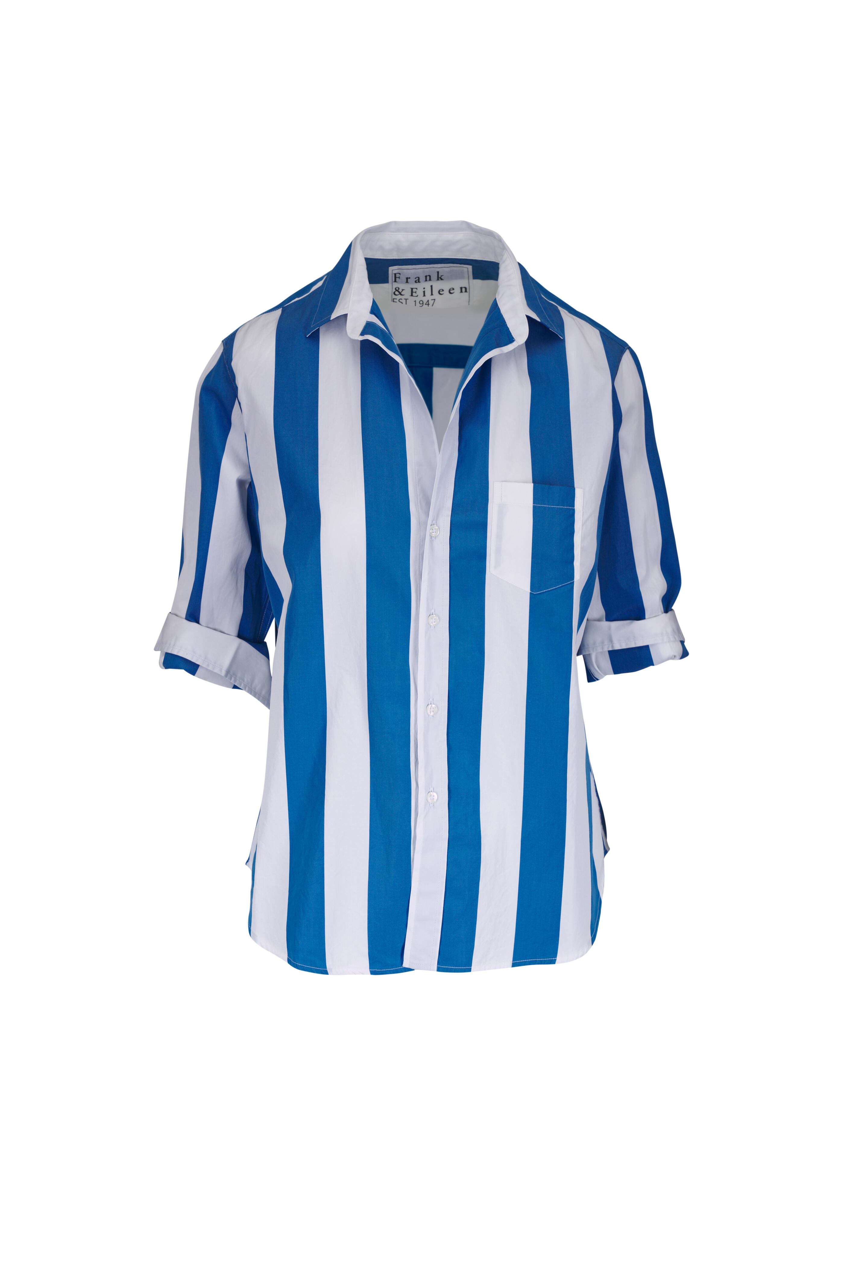 Spread collar. Front button placket. Single chest patch pocket. Single-button barrel cuffs. Rounded high-low hem. Fabric from Italy. Approx. 25" shoulder to hem (measurements from size XS). 100% cotton. Machine wash.