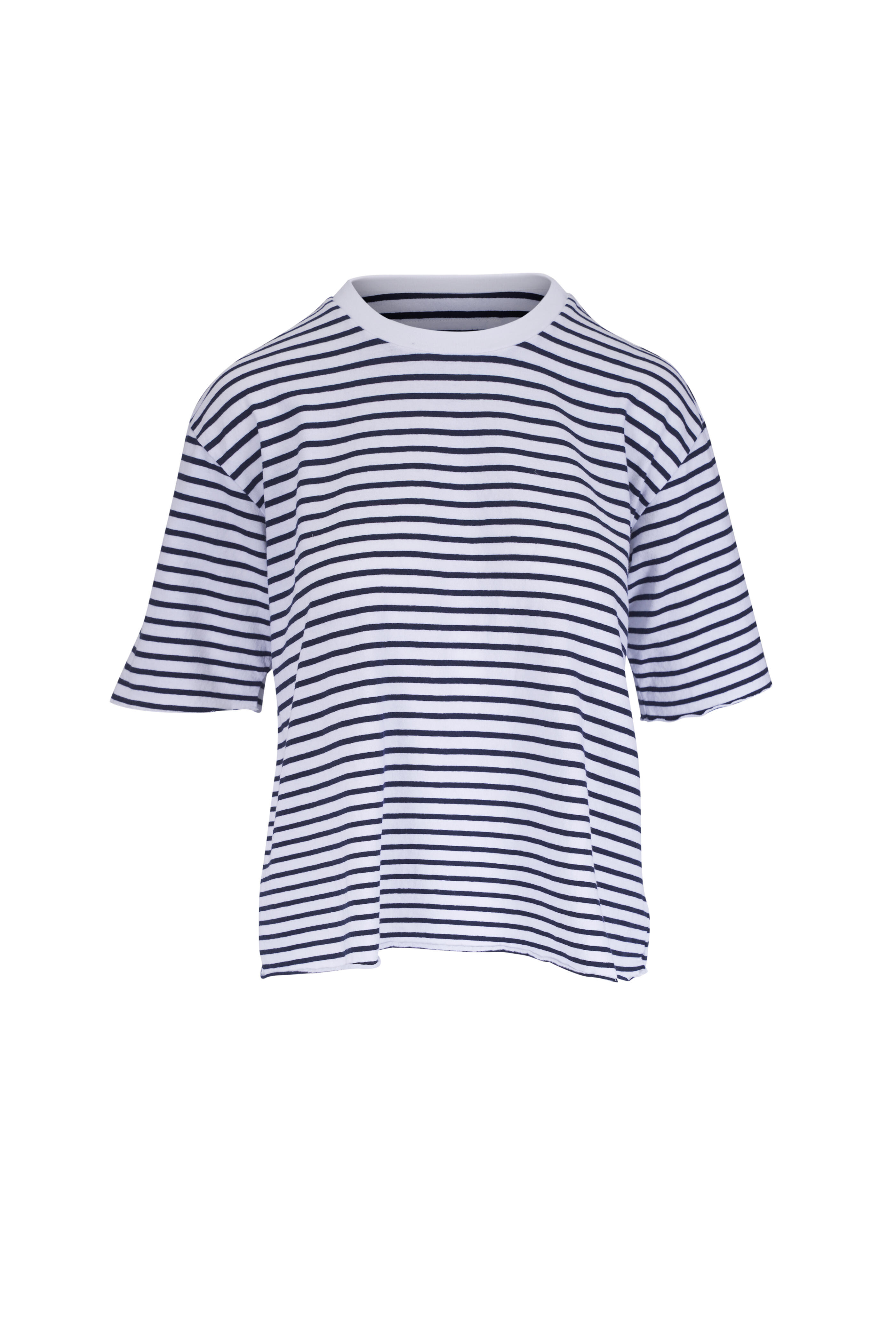 Ribbed crew neck. Short sleeves. Cropped hand-cut raw hem and edges. Made in USA. 100% cotton. Machine wash.
