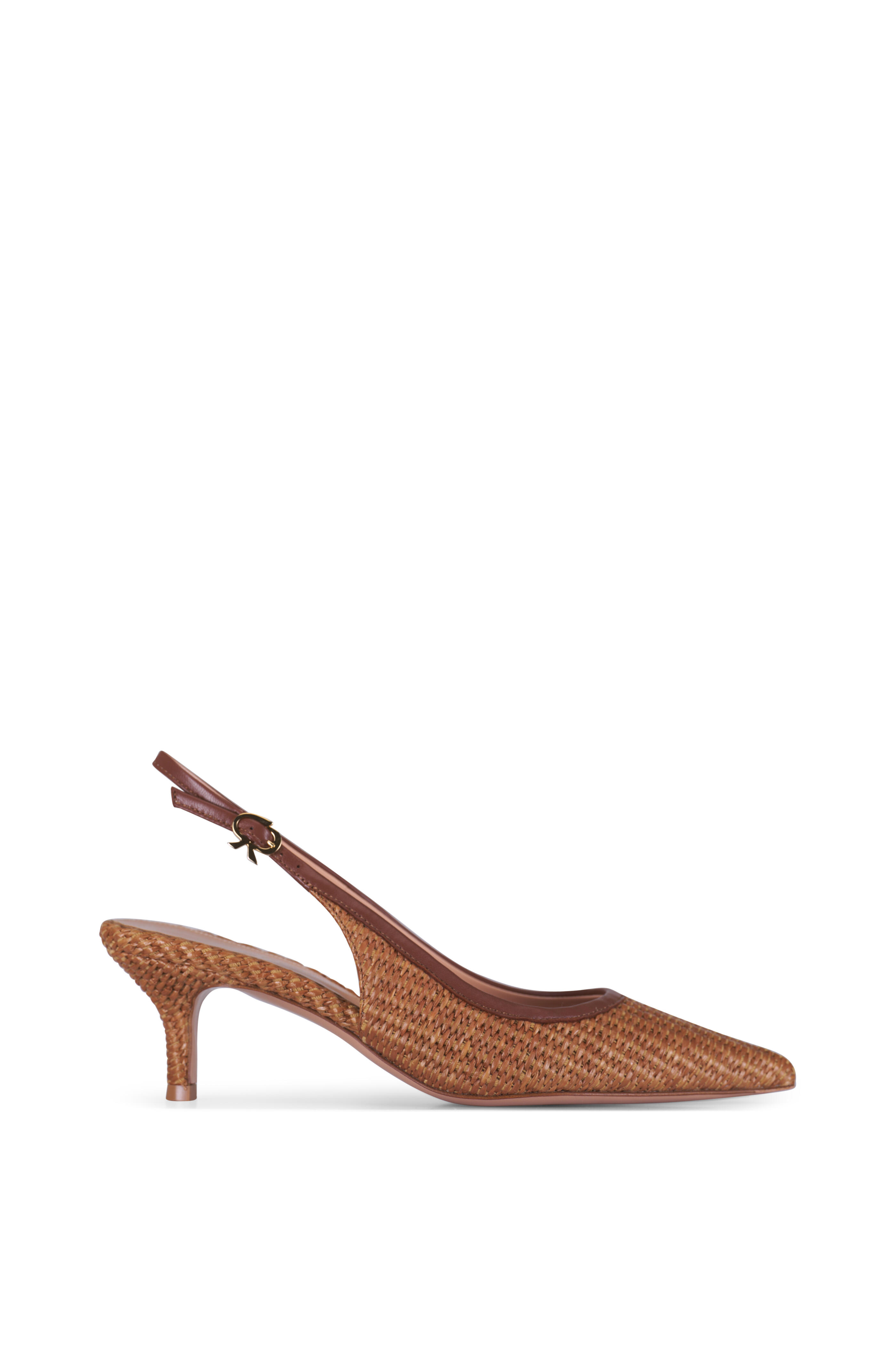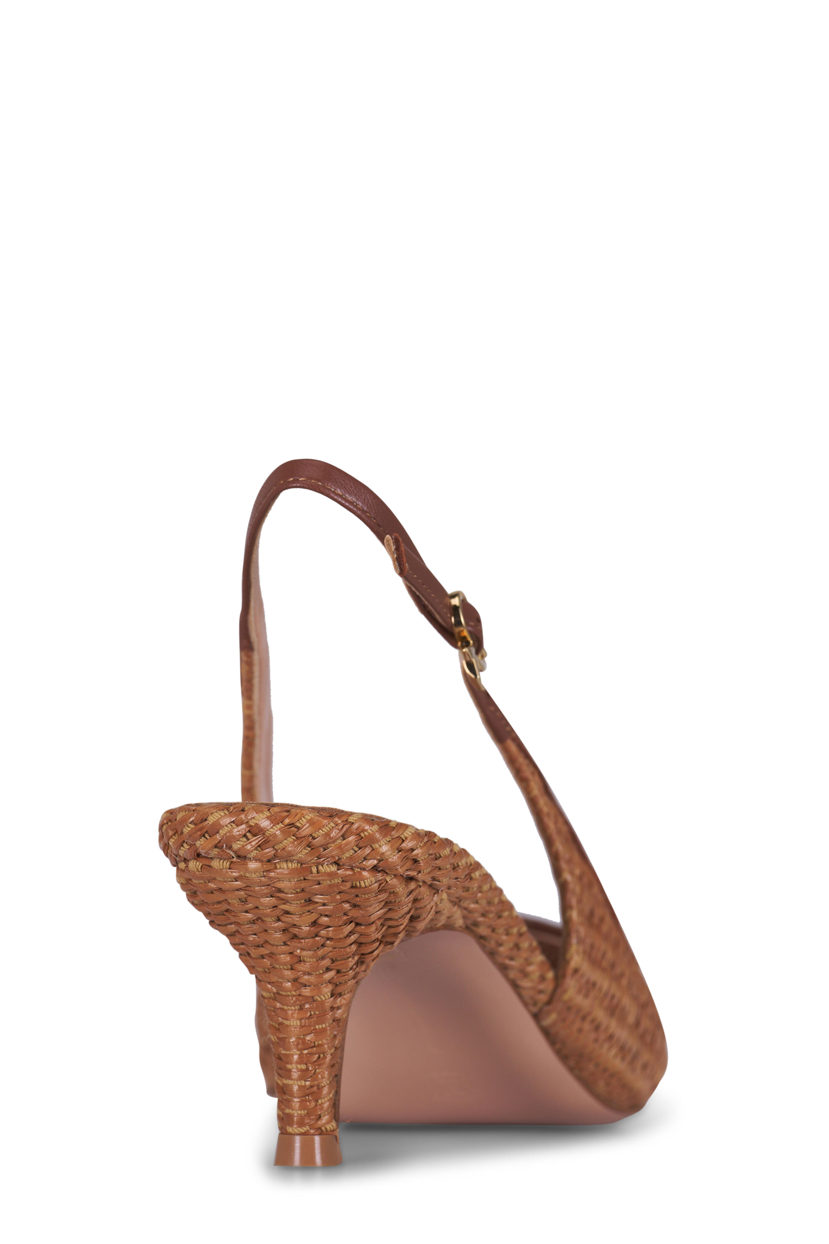 Woven raffia fabric and leather upper. Pointed toe. Adjustable buckle at ankle. Stiletto heel. Leather lining and insole. Leather sole. Made in Italy. Heel measurement: 55mm.