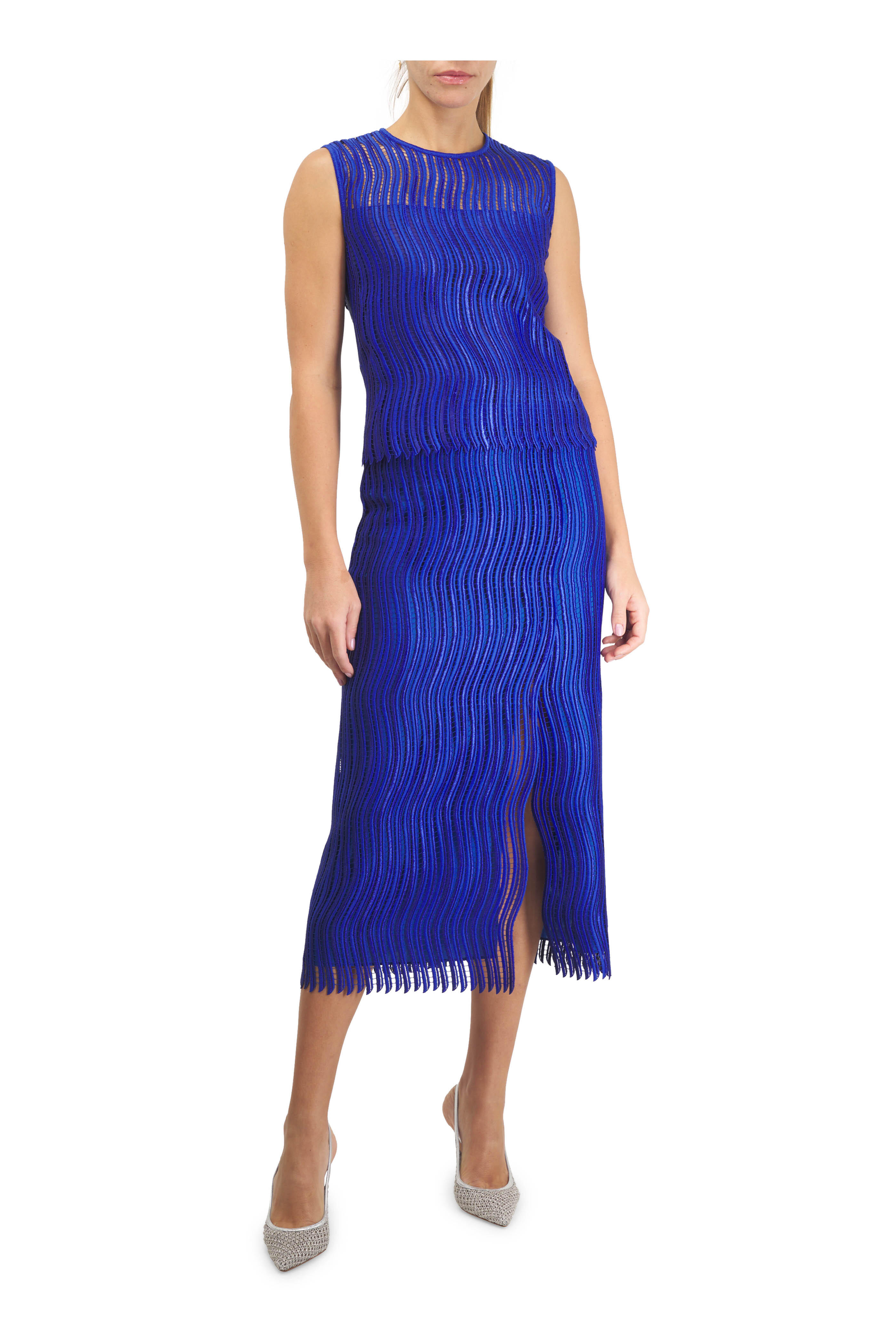Metallic leather and mesh upper. Pointed toe. Slingback; adjustable signature ribbon buckle closure. Self-covered heel. Leather insole; unlined. Leather sole. Made in Italy. Heel measurement: 95mm.