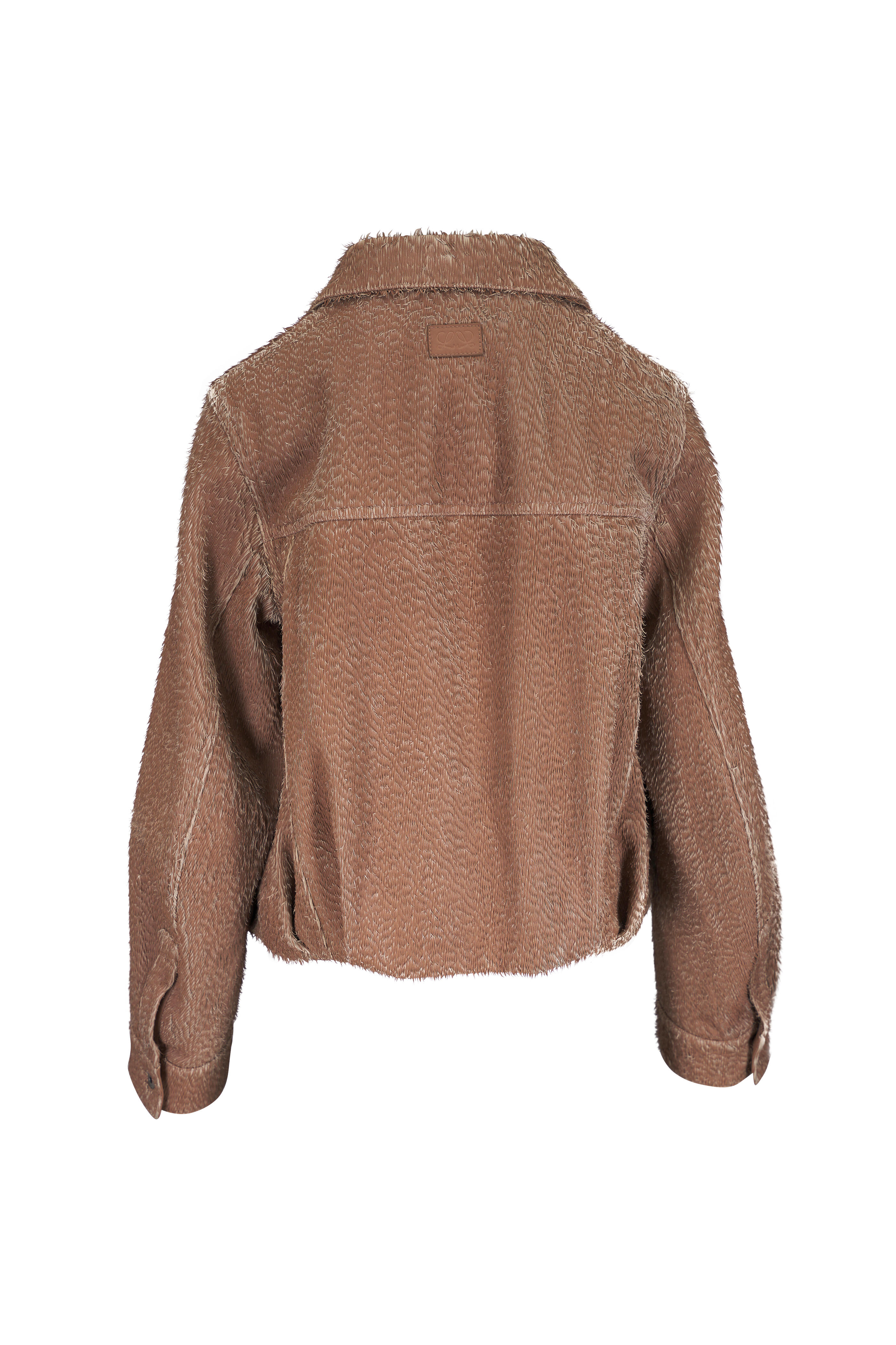 Laser cut, fringed leather; lined. Specialist clean. Spread collar. Front snap button placket. Chest patch pockets. Side slip pockets. Single button square cuffs. Pleated hem. Made in Italy. Balloon silhouette.