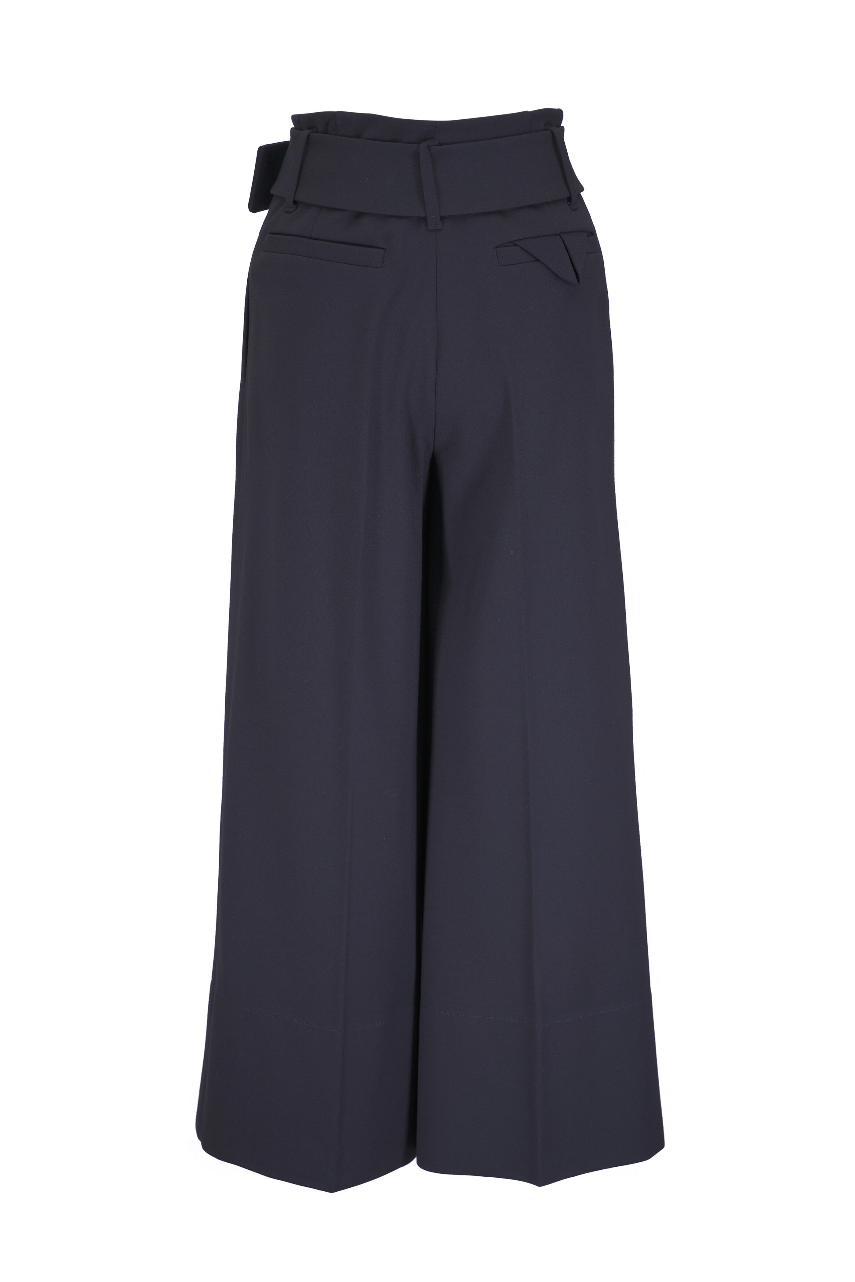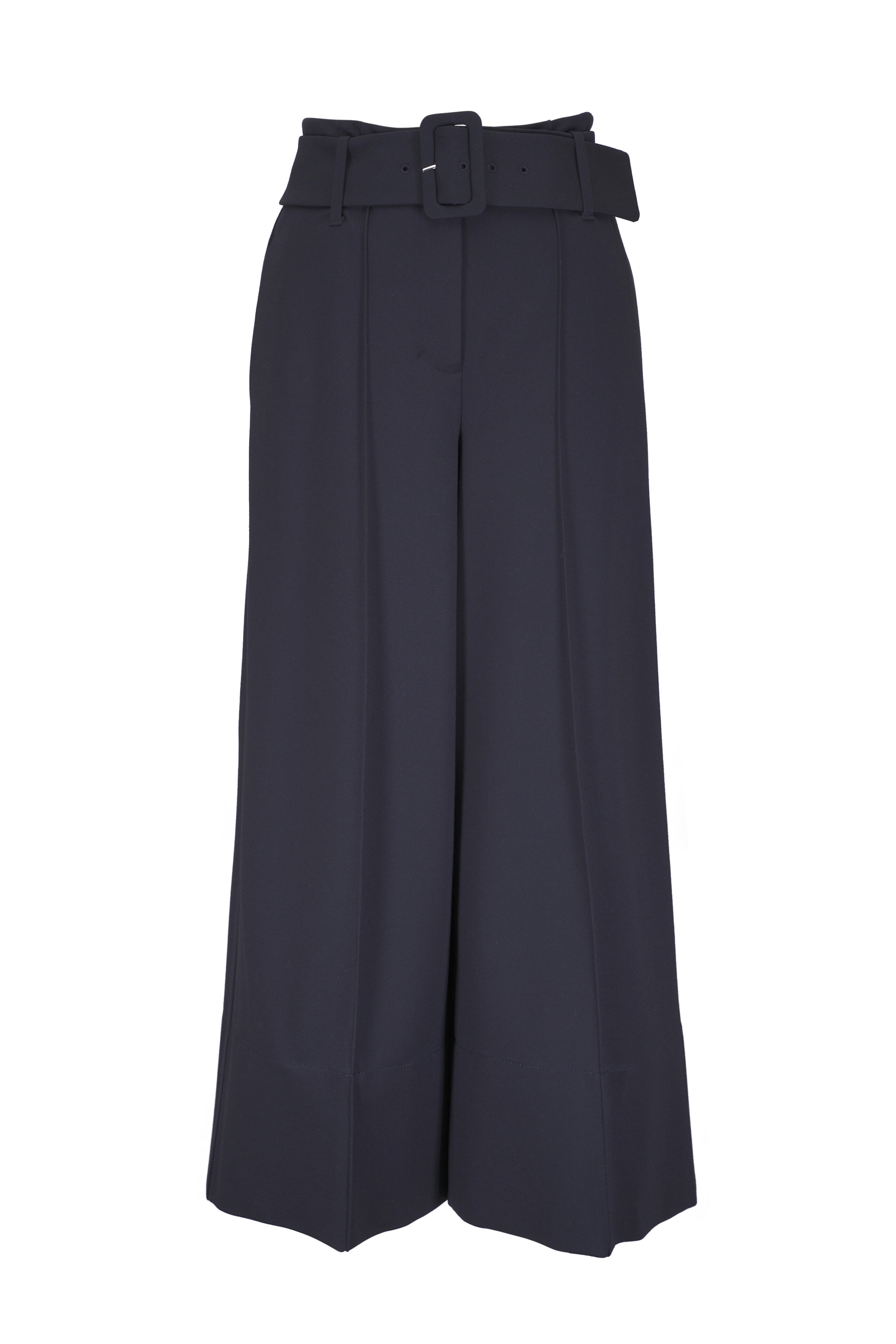 Belt loops. Self belt with covered buckle. Zip fly; hook & eye closure. Side slip pockets; back welt pockets. Imported. 27" inseam. Wide leg. Cropped. 67% viscose, 28% polyamide, 5% elastane. Hand wash.