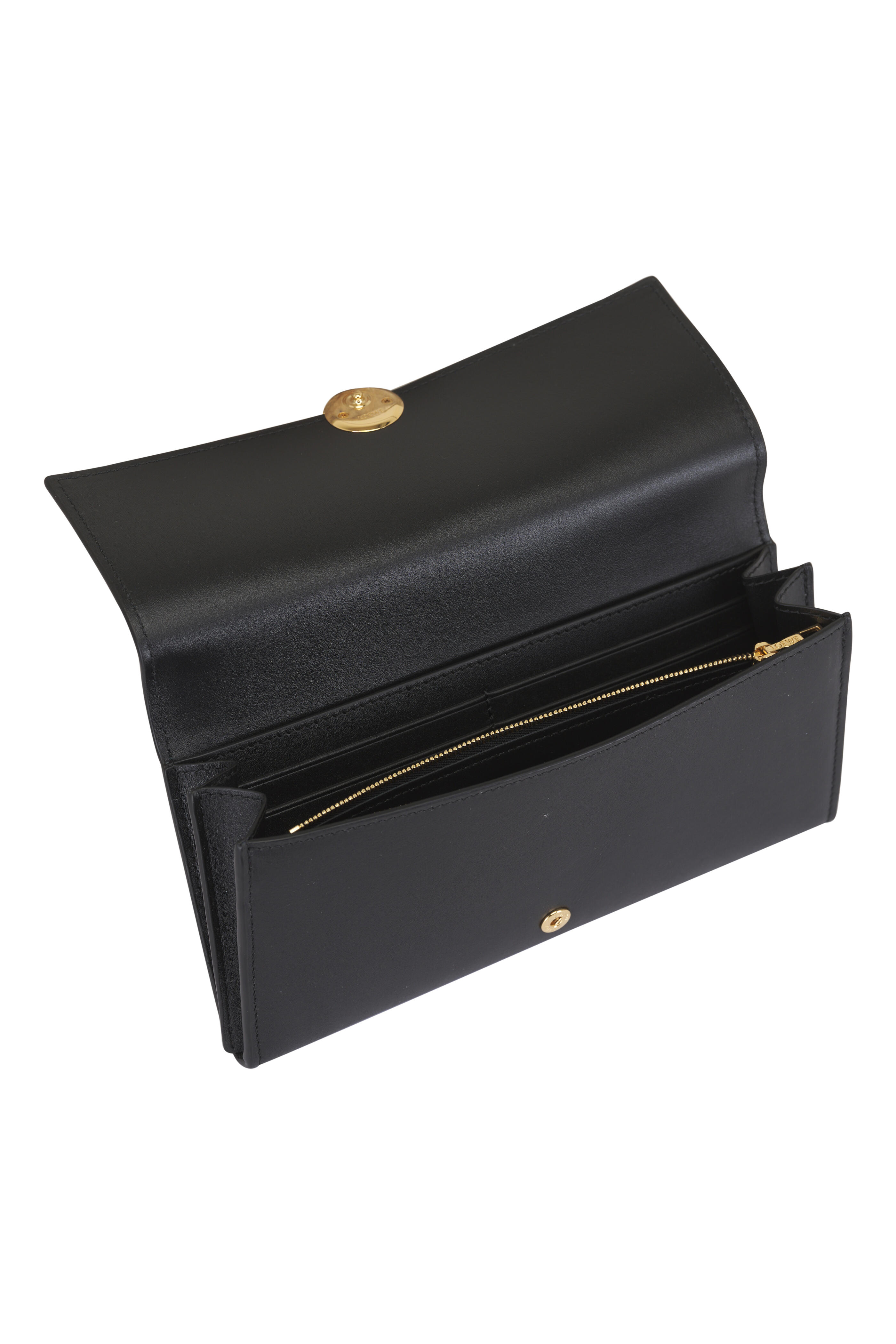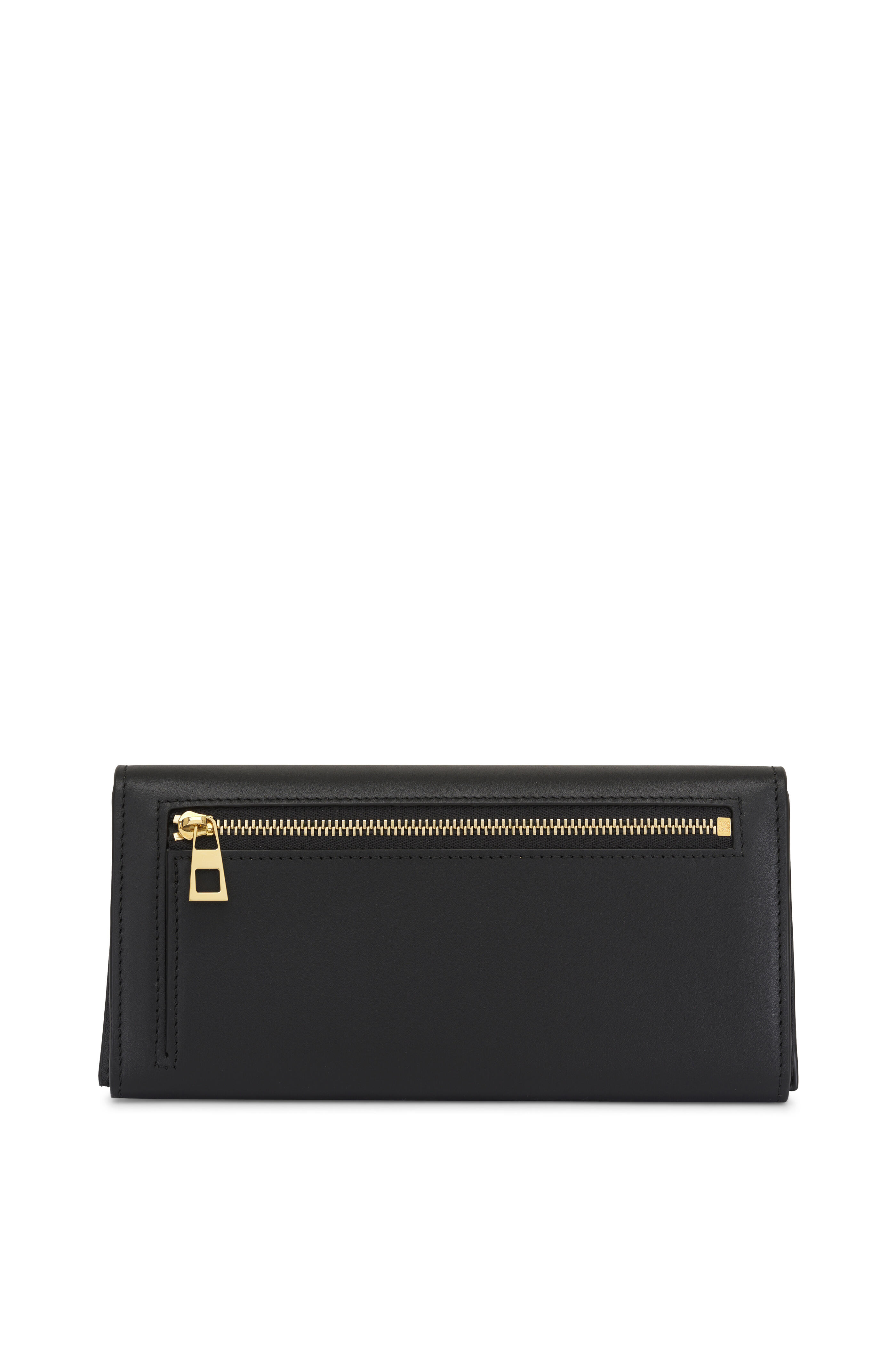 Shiny nappa calfskin leather. Snap button closure. One external zipped pocket; ten card slots; two large note pockets. One zipped coin compartment. Calfskin lining. Engraved Anagram. Made in Spain. Height: 3.9". Width: 7.9". Depth: 1".