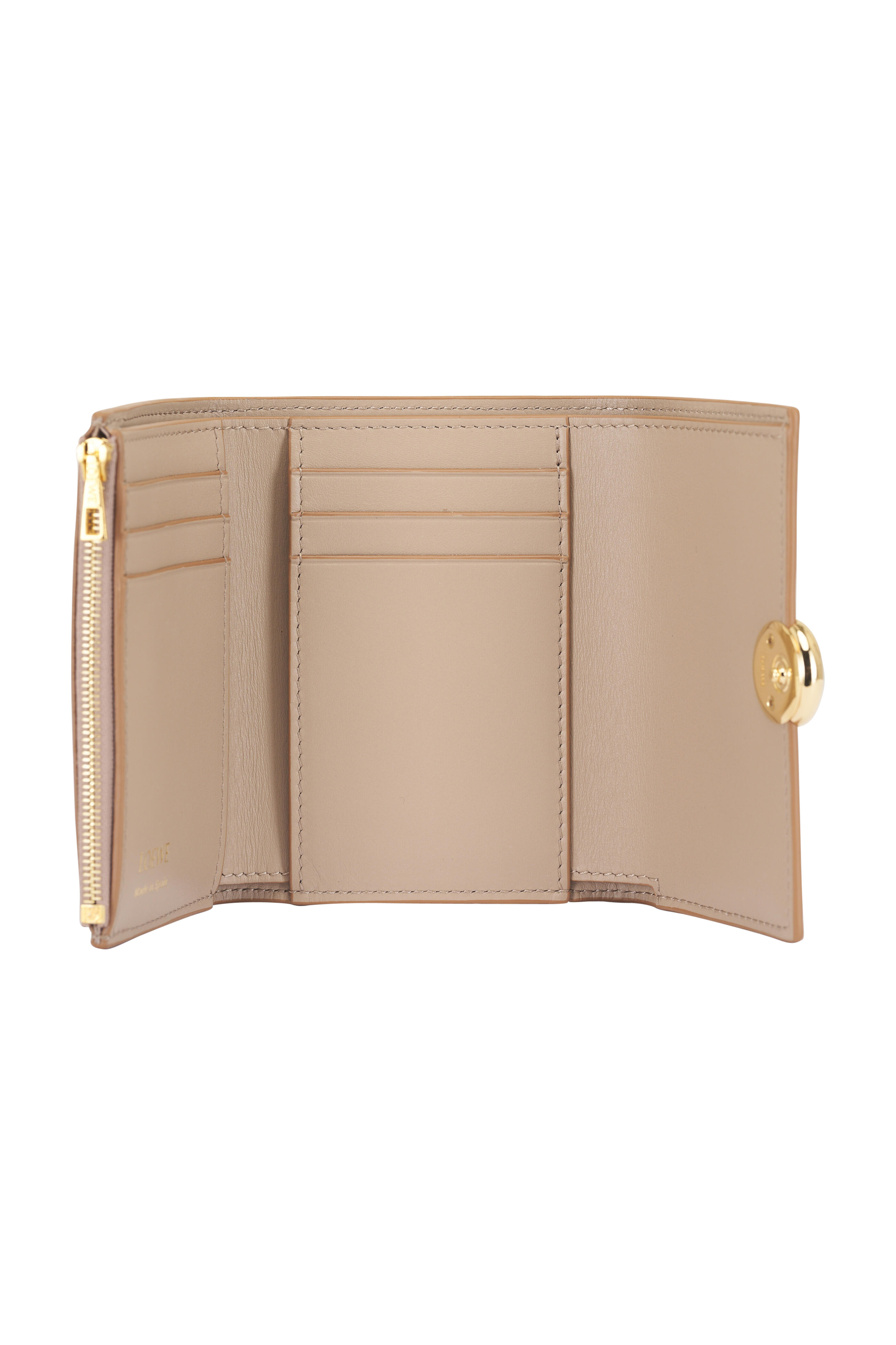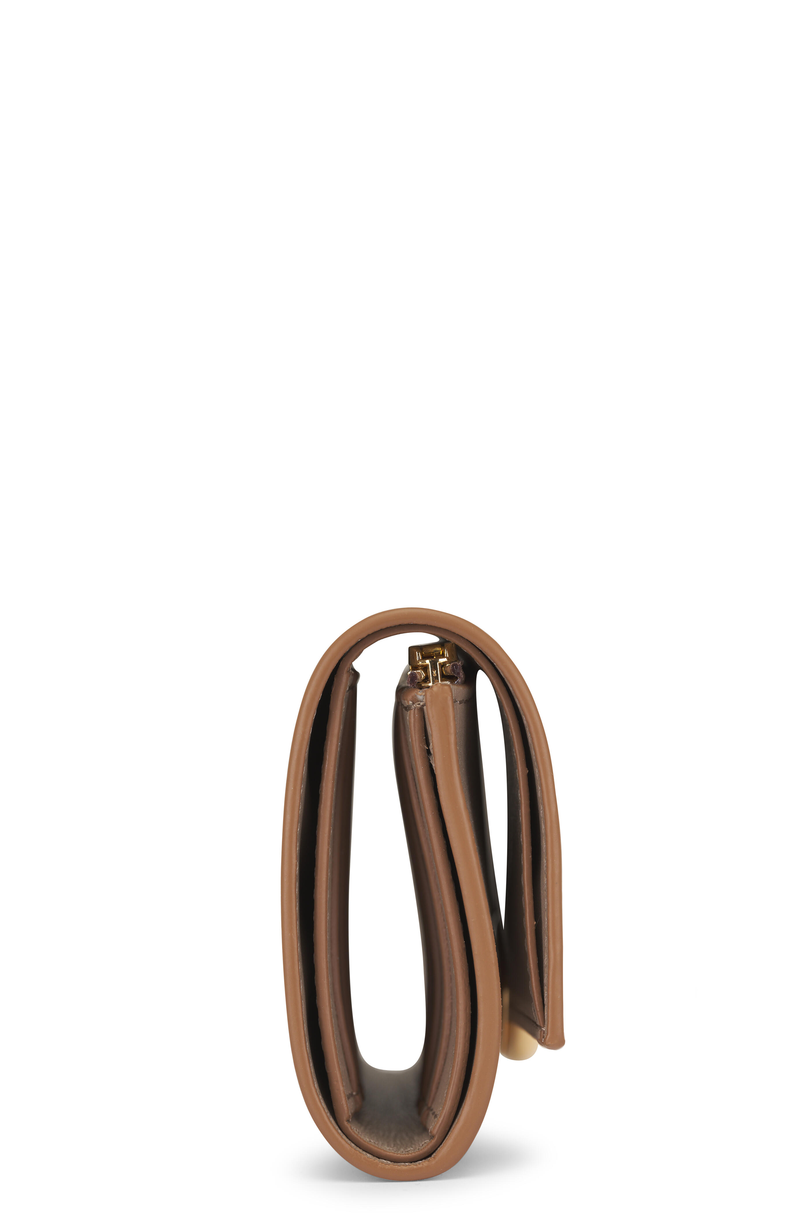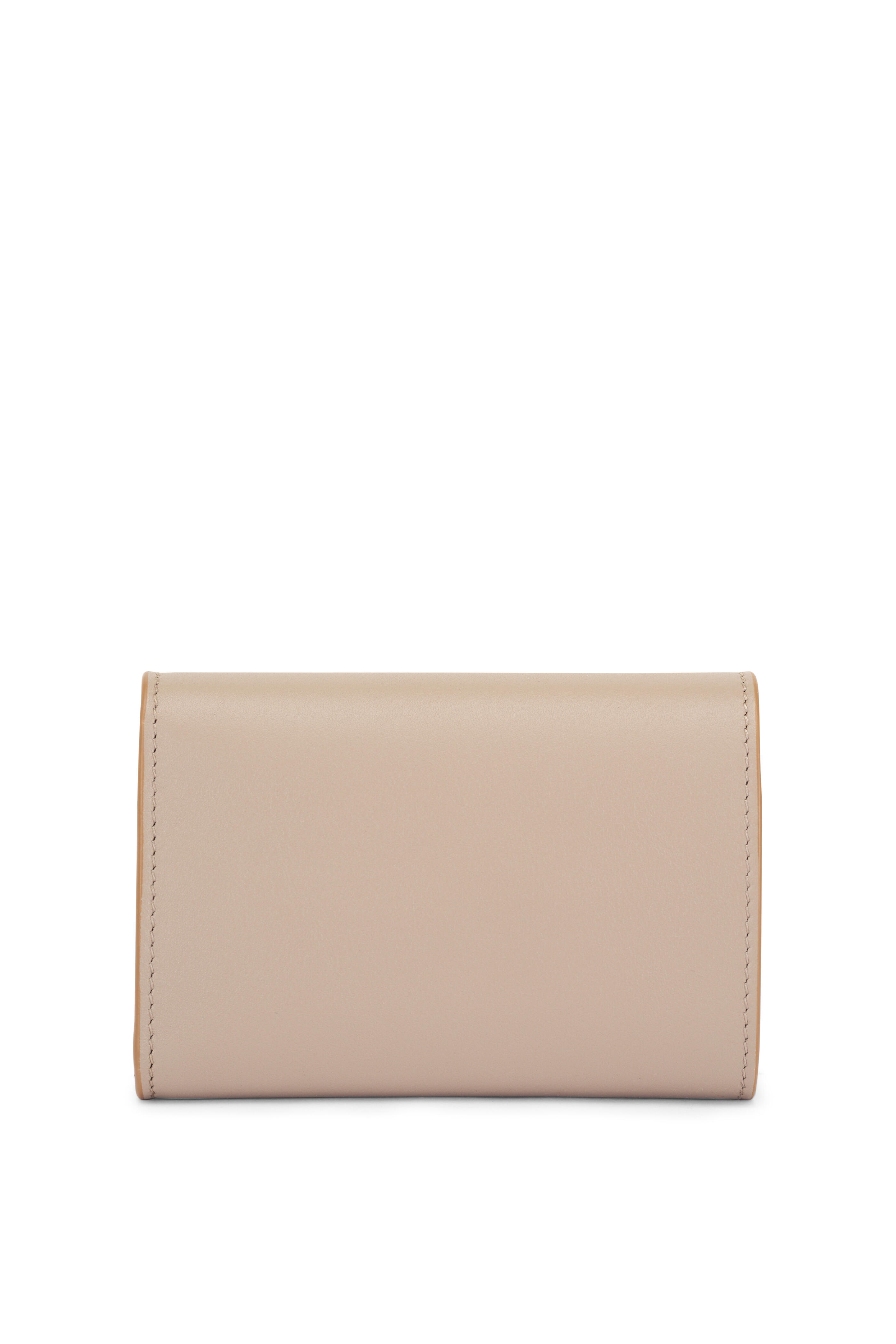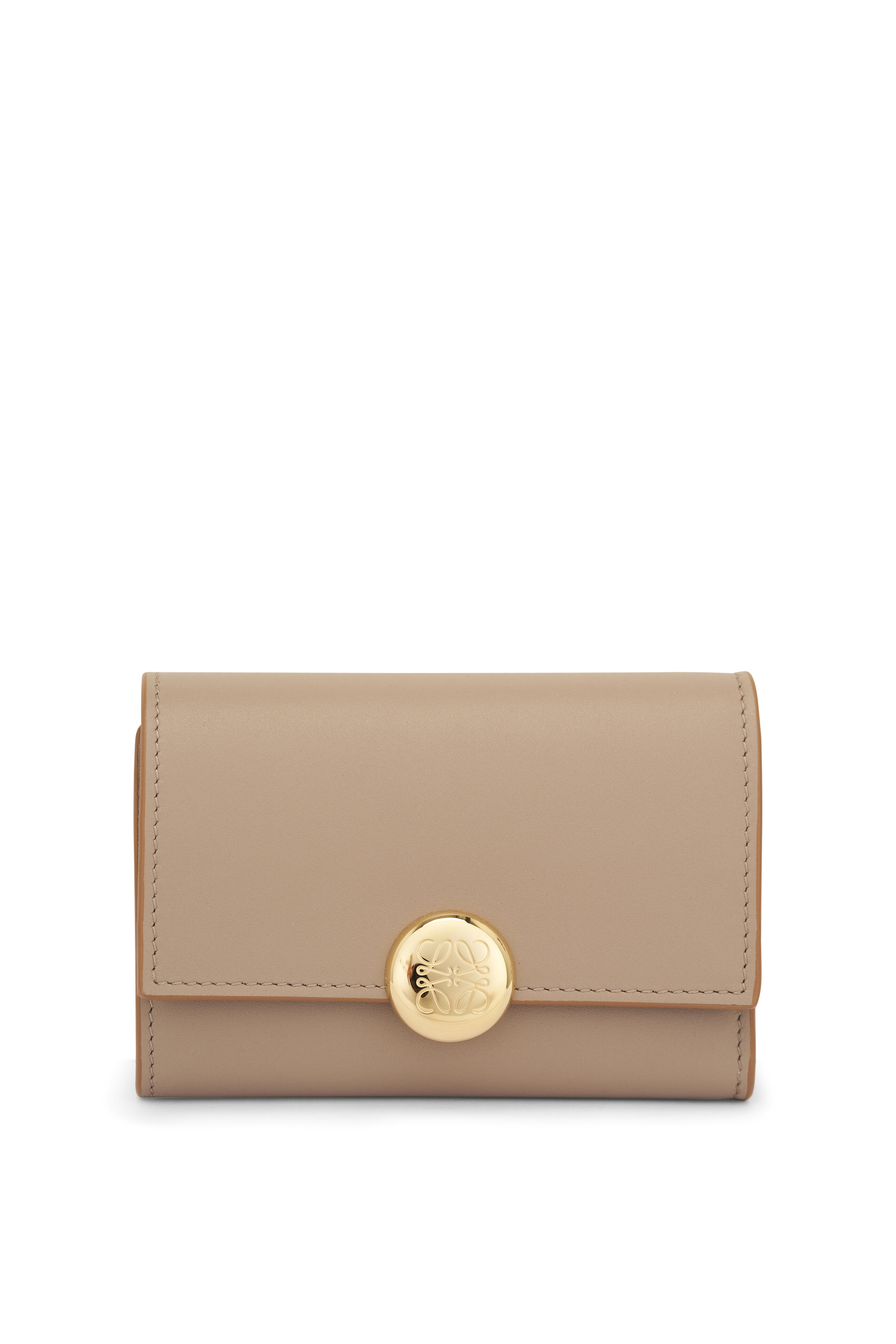 Shiny nappa calfskin leather. Snap button closure. Six card slots; two small pockets; one large pocket. One zipped coin compartment. Calfskin lining. Gold embossed logo; engraved Anagram. Made in Spain. Height: 3.2". Width: 4.6". Depth: 1.2".