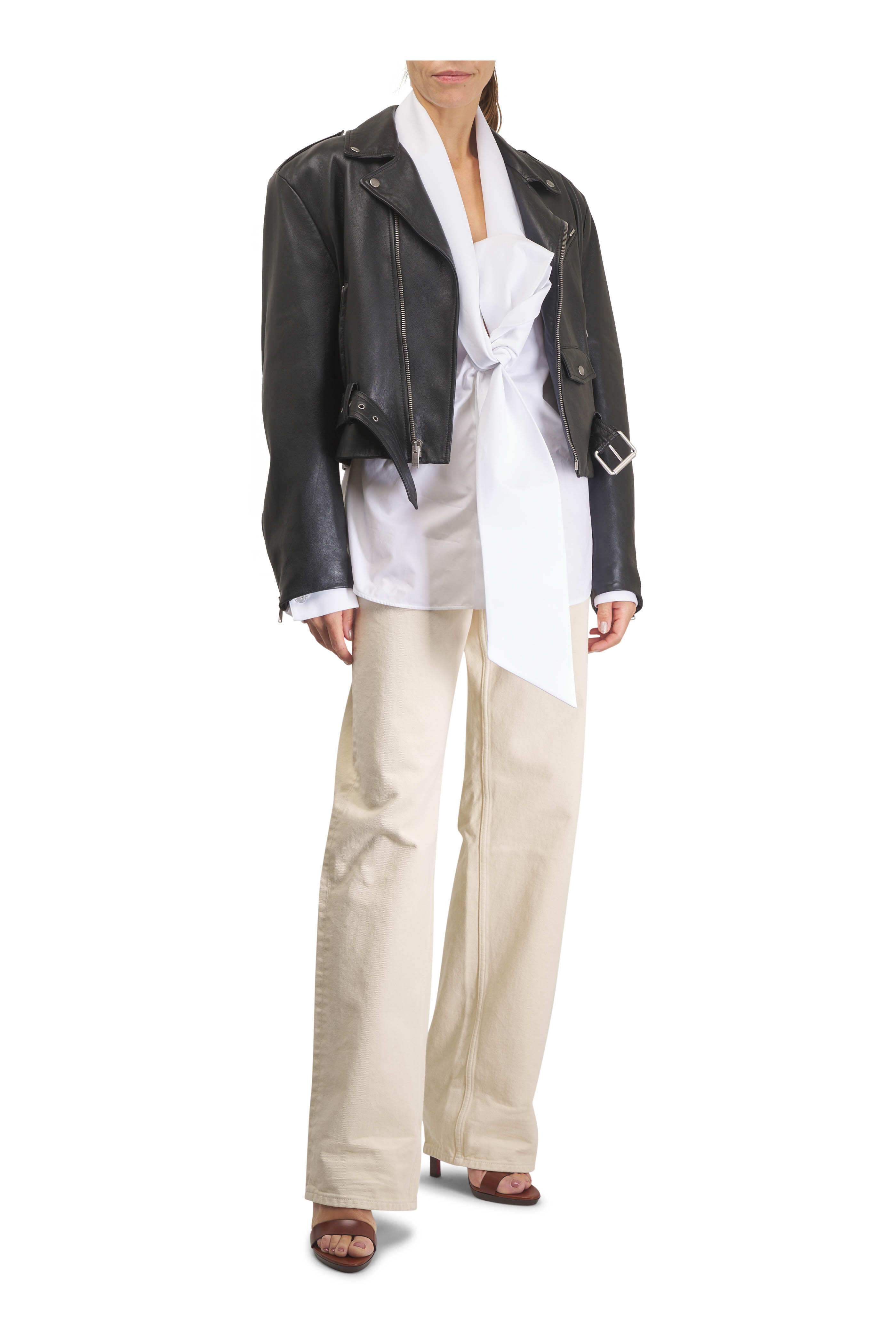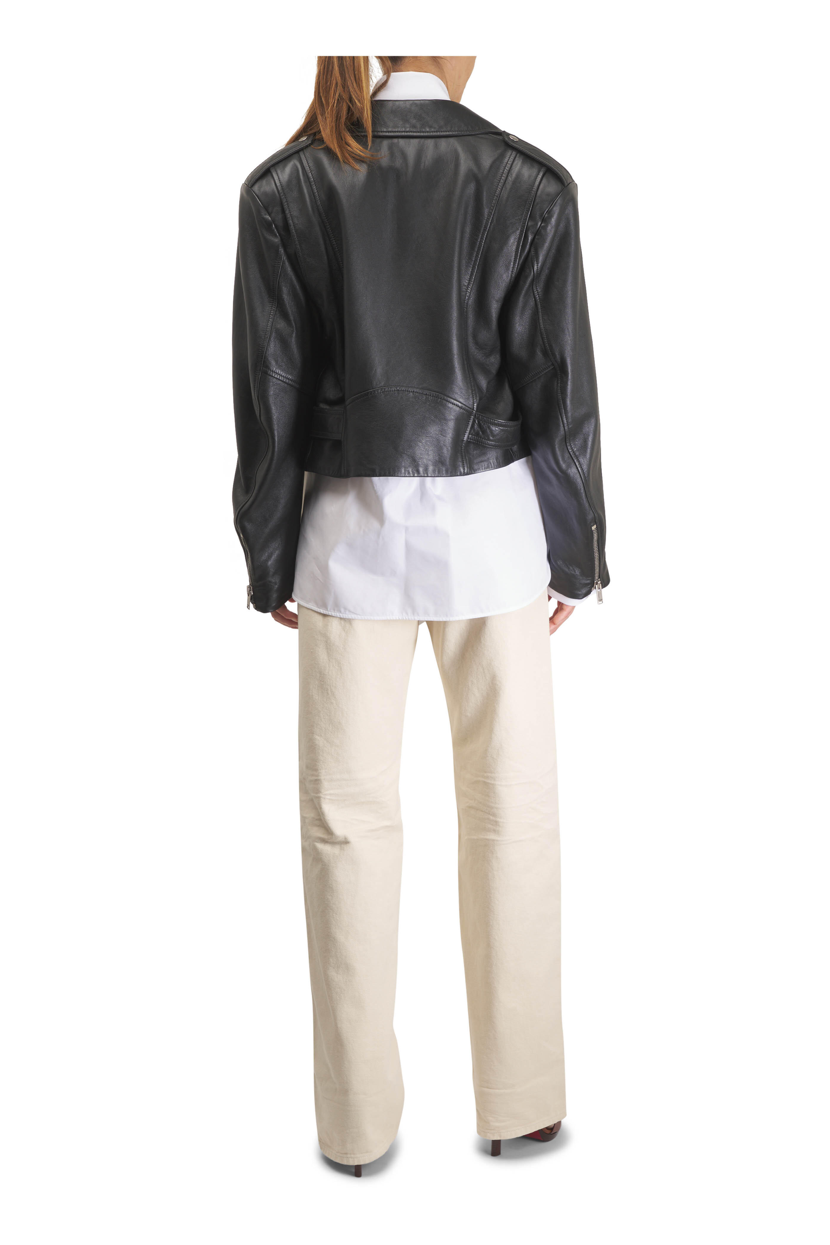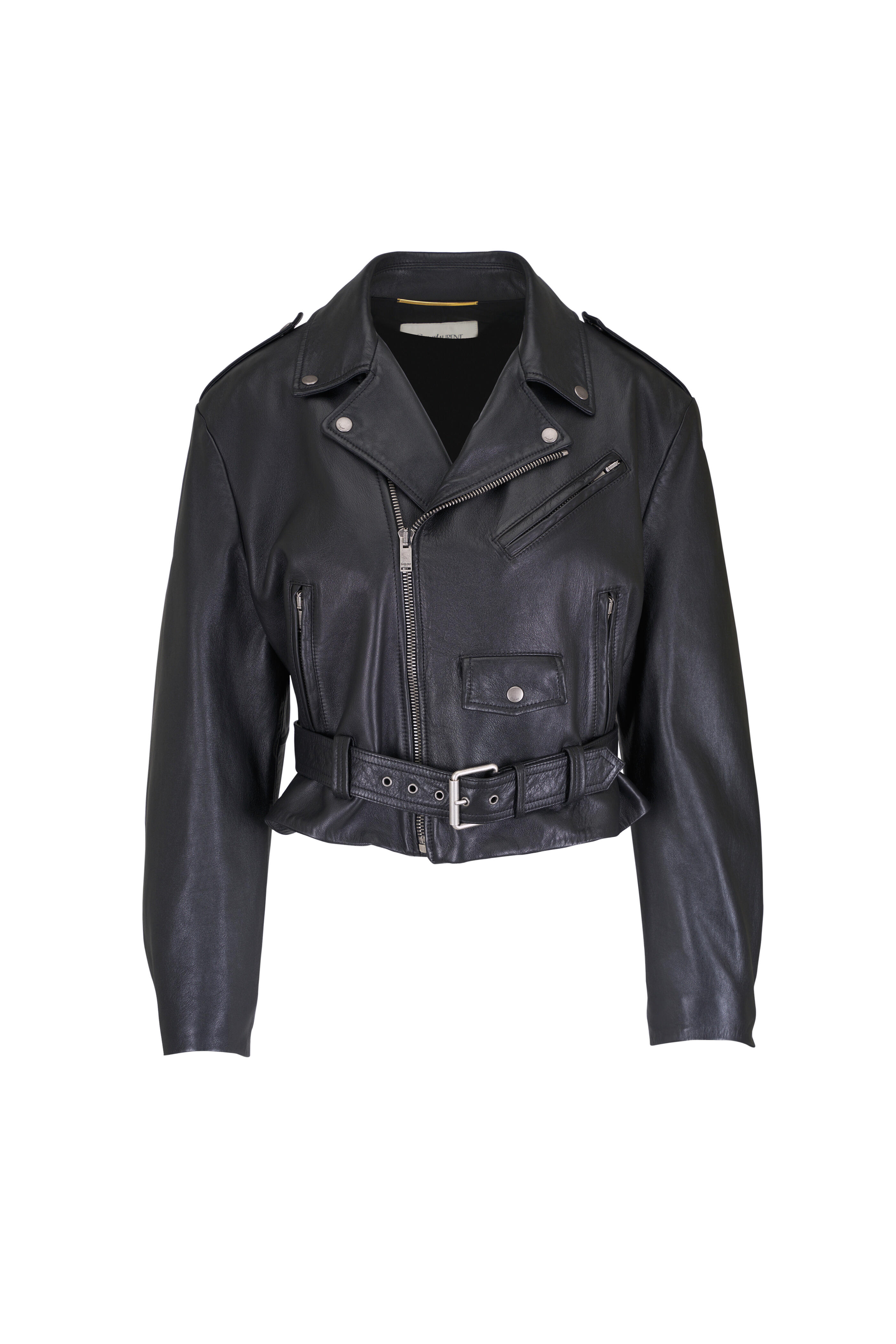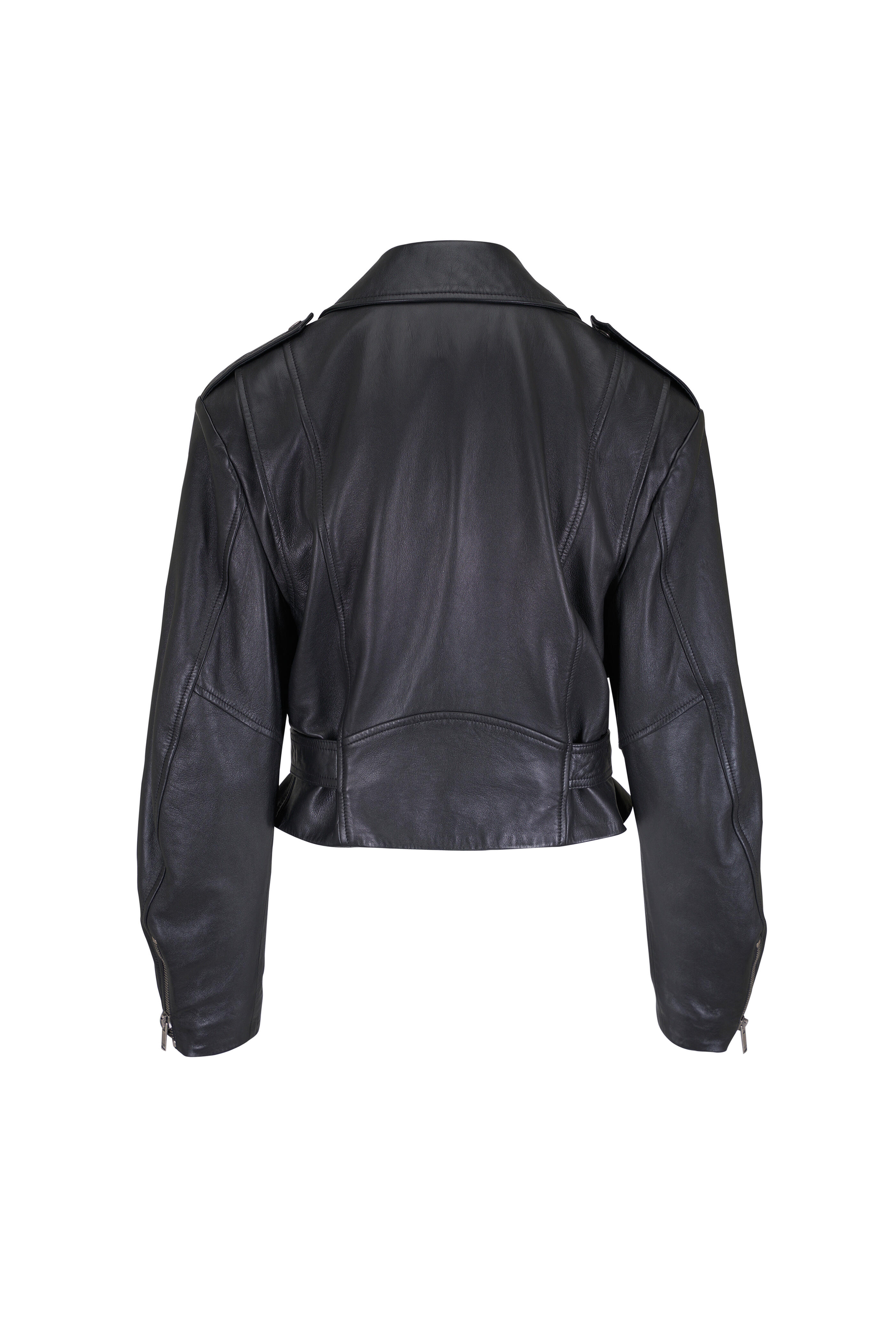 Specialist clean. Notched lapel. Asymmetrical zip placket. Lower zip pockets; ticket pocket with snap button closure; chest zip pocket; Interior pocket. Padded shoulders. Adjustable belt at the hem. Zip cuffs. Made in Italy. 100% lambskin leather; lined.