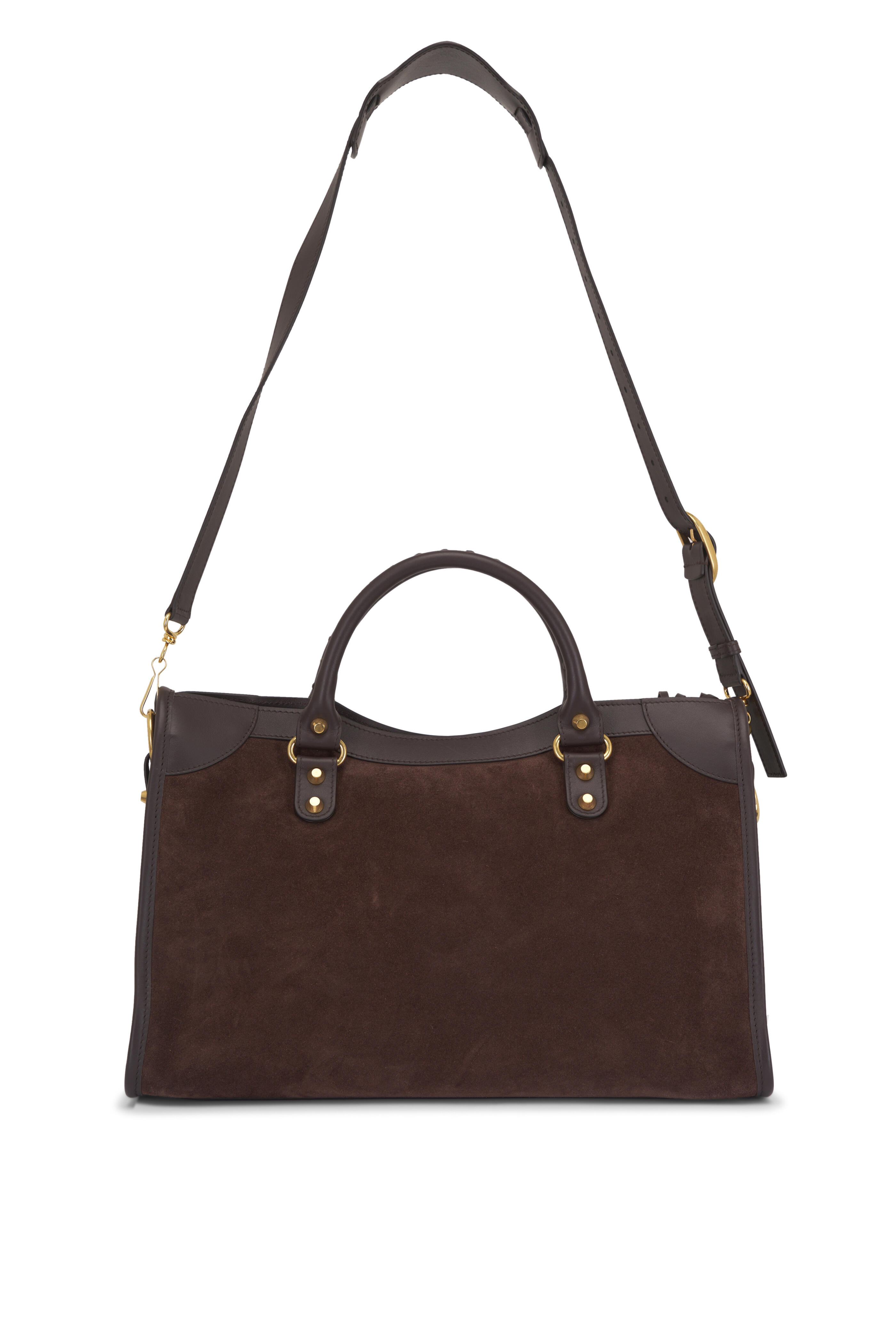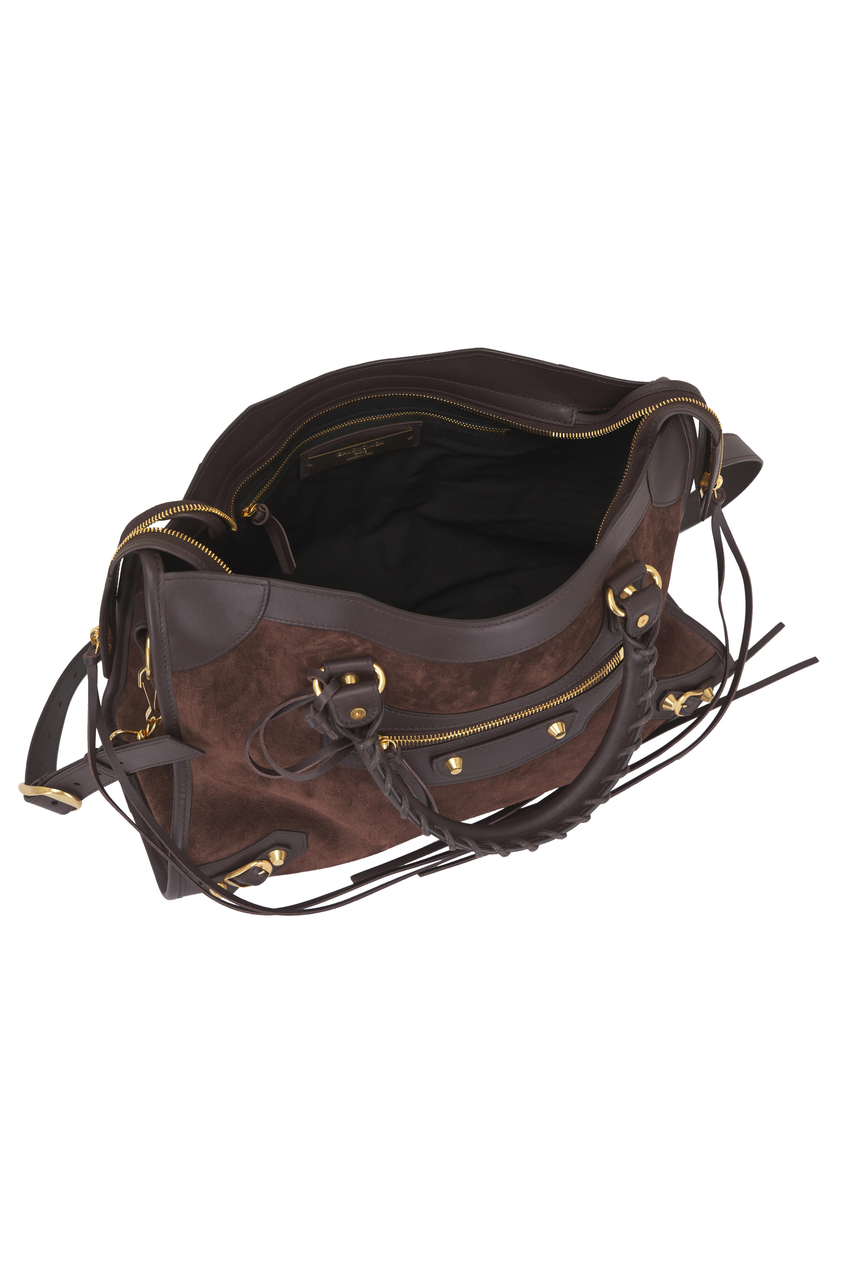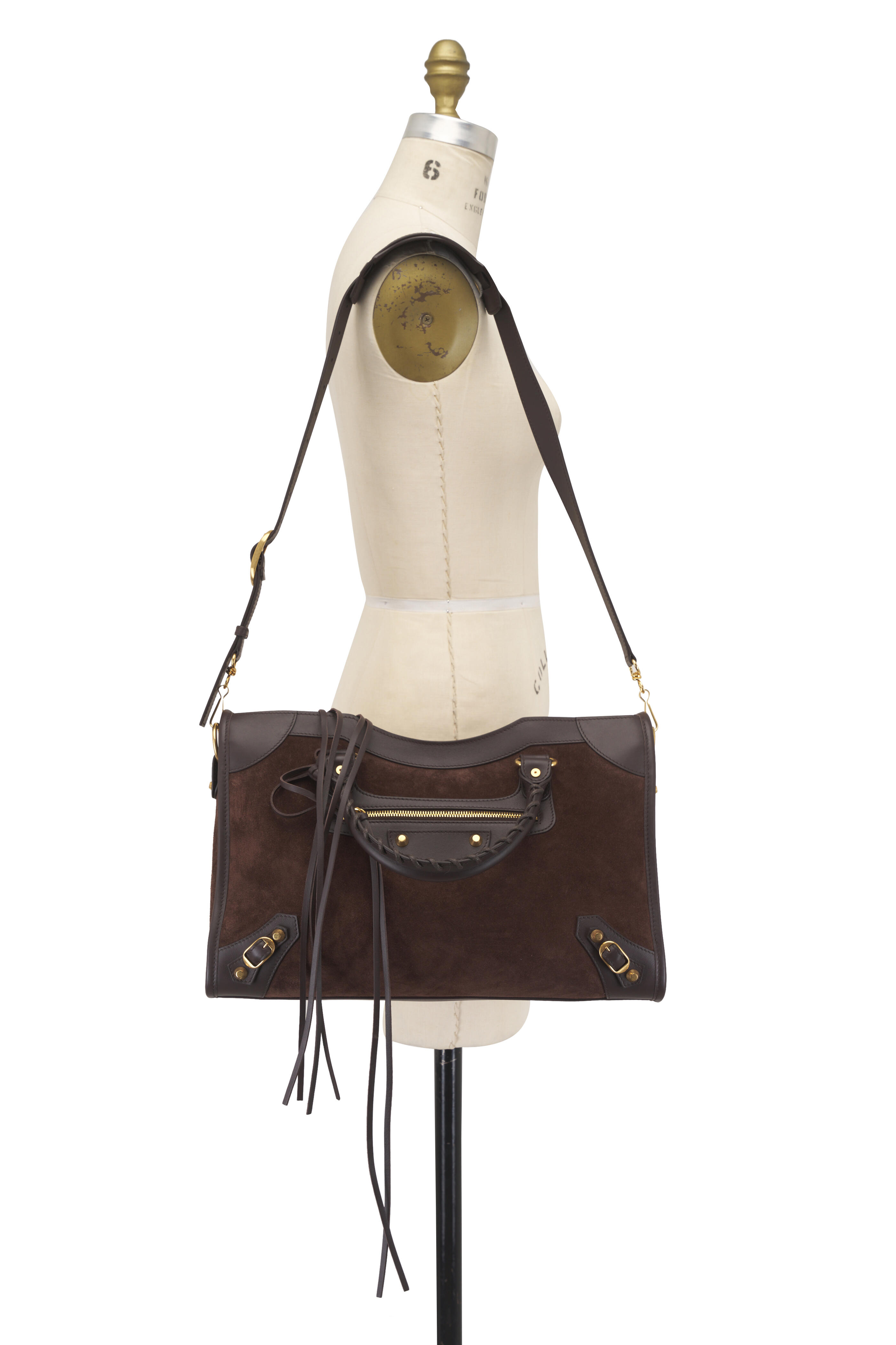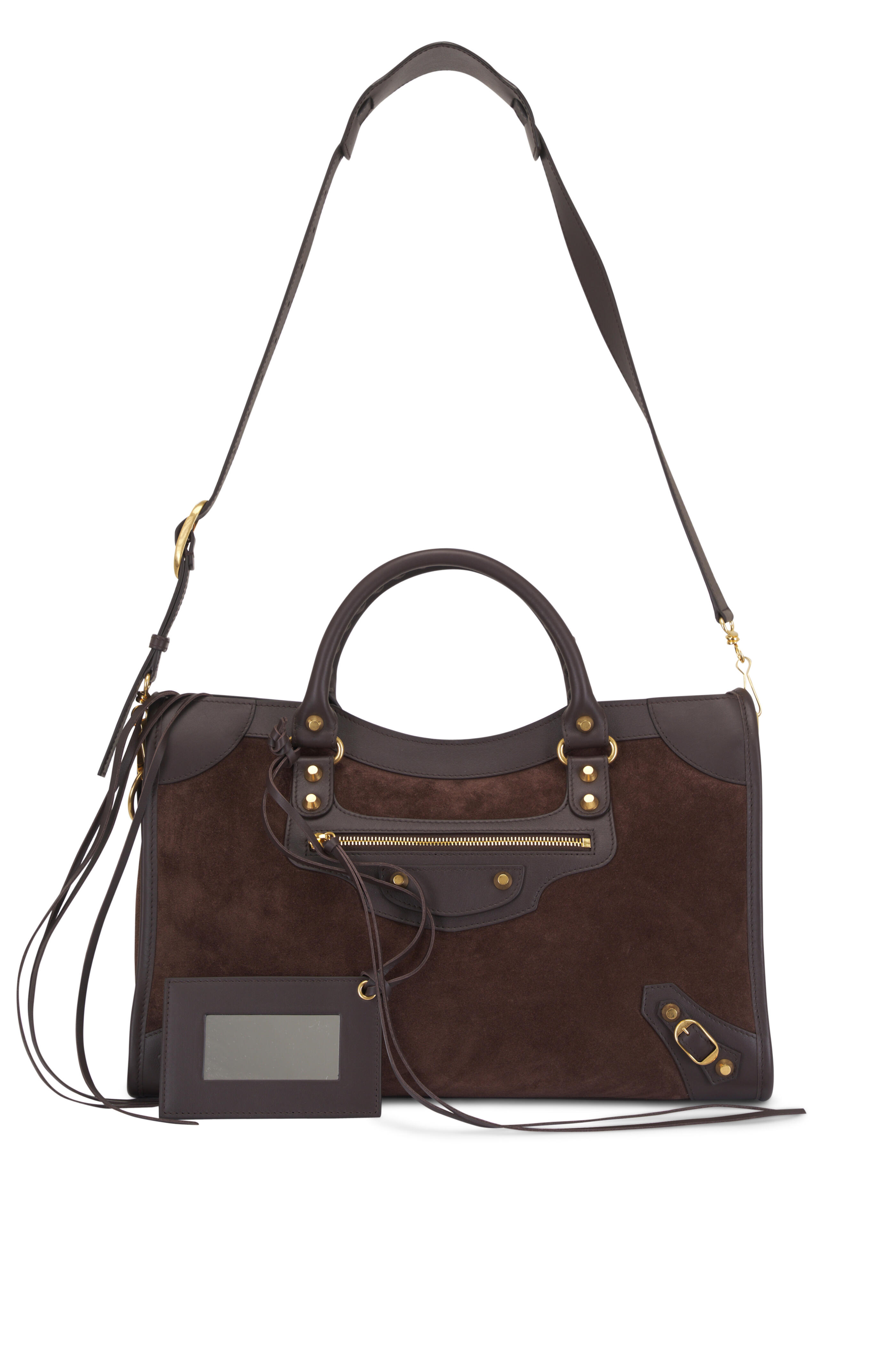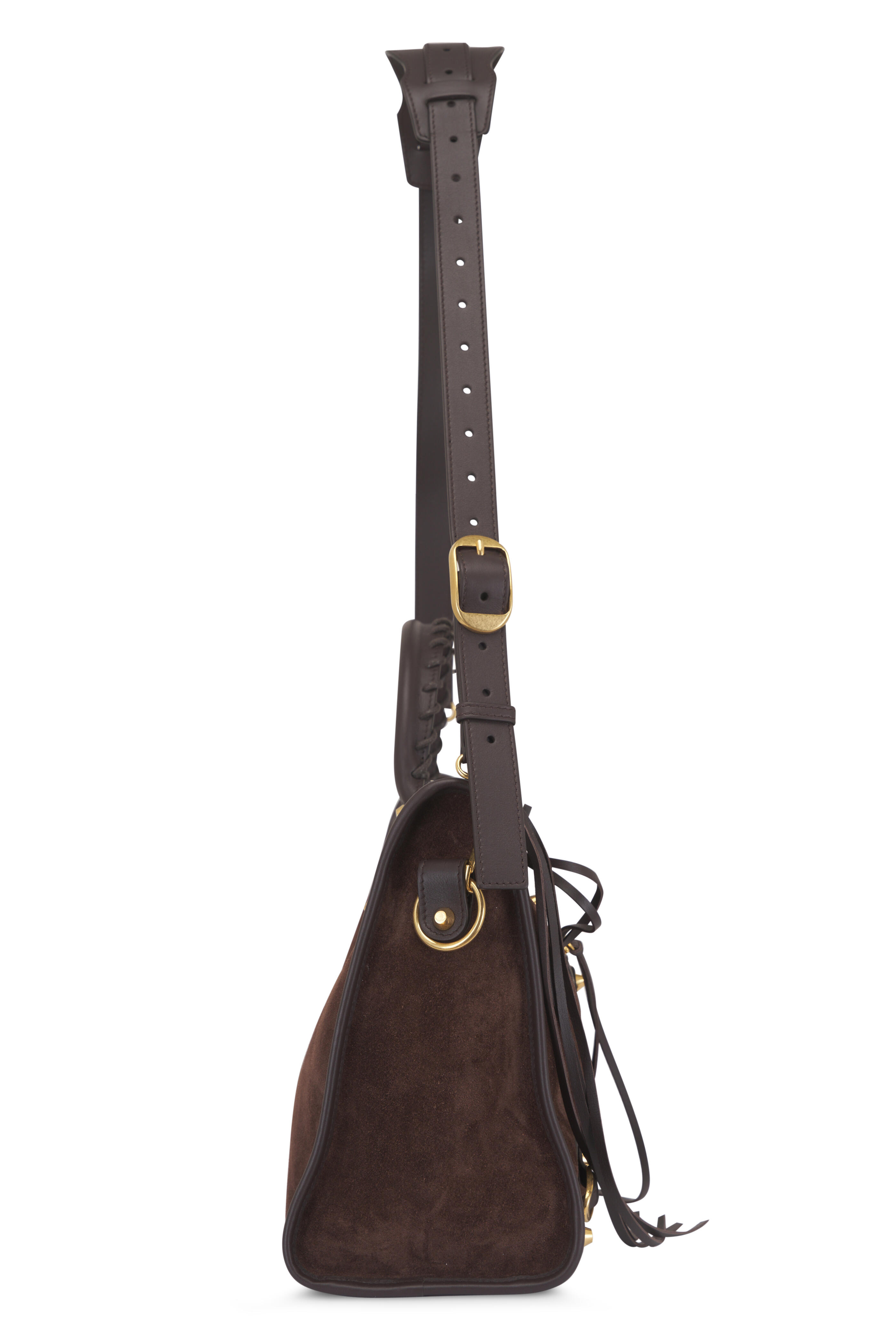 Suede calfskin and smooth calfskin. Dual top handles with braided wax cord. Removable and adjustable strap with shoulder pad. Double-sided zip with long tails and knotted leather puller. Front zipped pocket with knotted leather puller, singe inner zipped pocket. Removable mirror. Cotton canvas lining. Aged-gold hardware. Made in Italy. Length: 38.5 cm | 15.1". Height: 24 cm | 9.4". Width: 15 cm | 5.9". Handle drop: 15 cm | 5.9". Strap drop: 42 cm | 16.5". Can fit a smartphone, a book, a tablet and a small laptop.