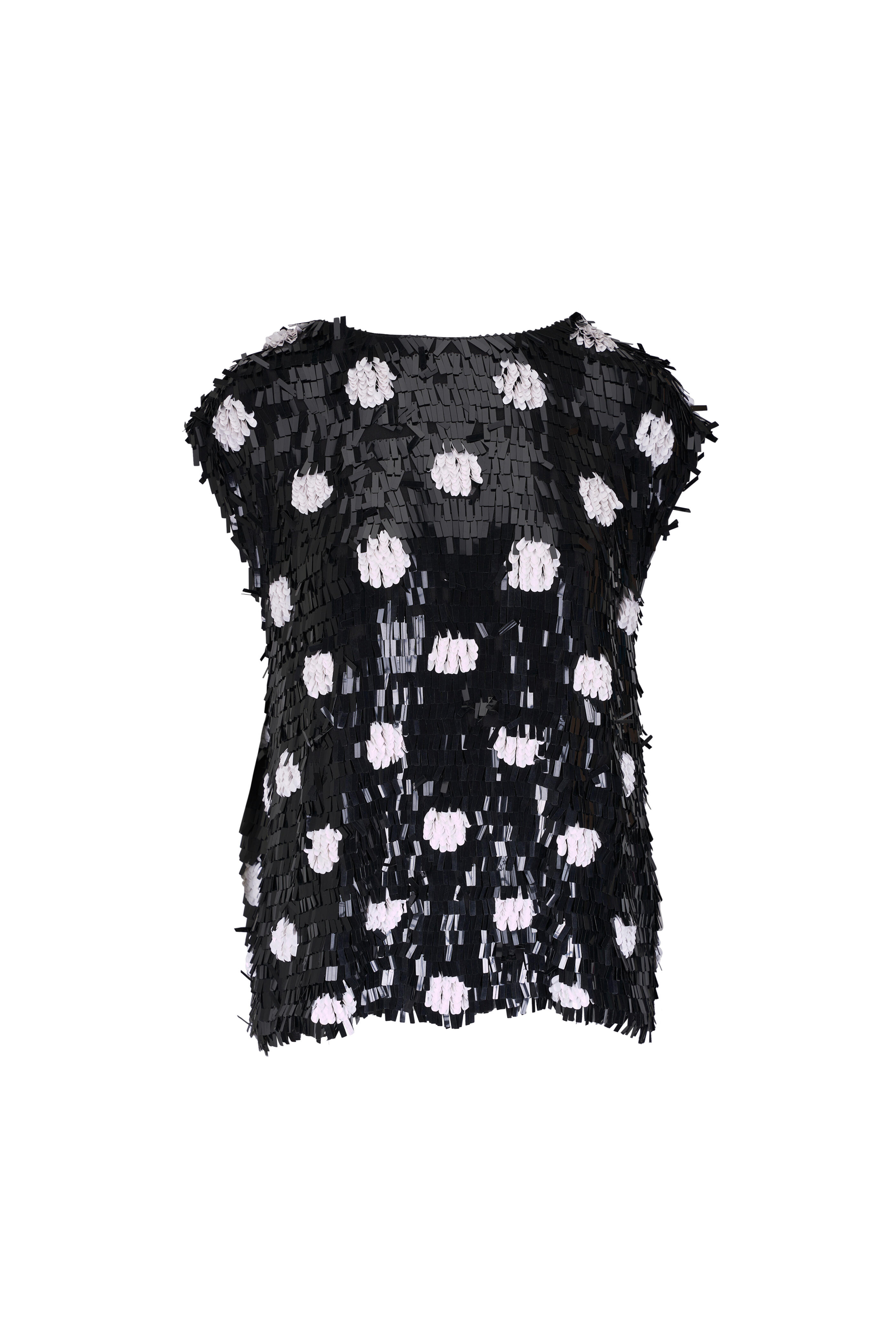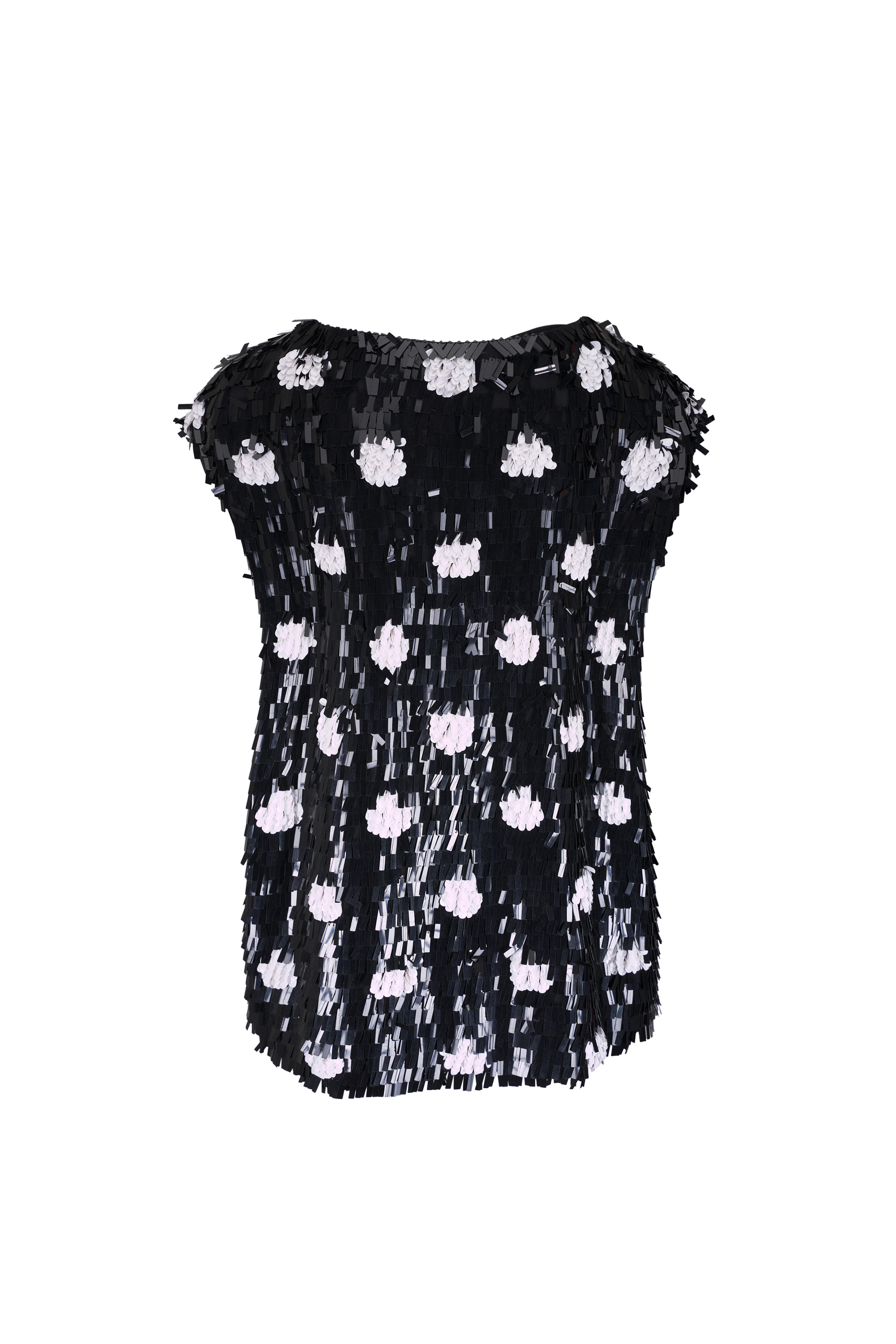 Round neckline. Slip-on style. Paillette detailing. Imported. Approx. 25" shoulder to hem (measurements from size 4). 100% silk; lining: 100% silk. Dry clean.