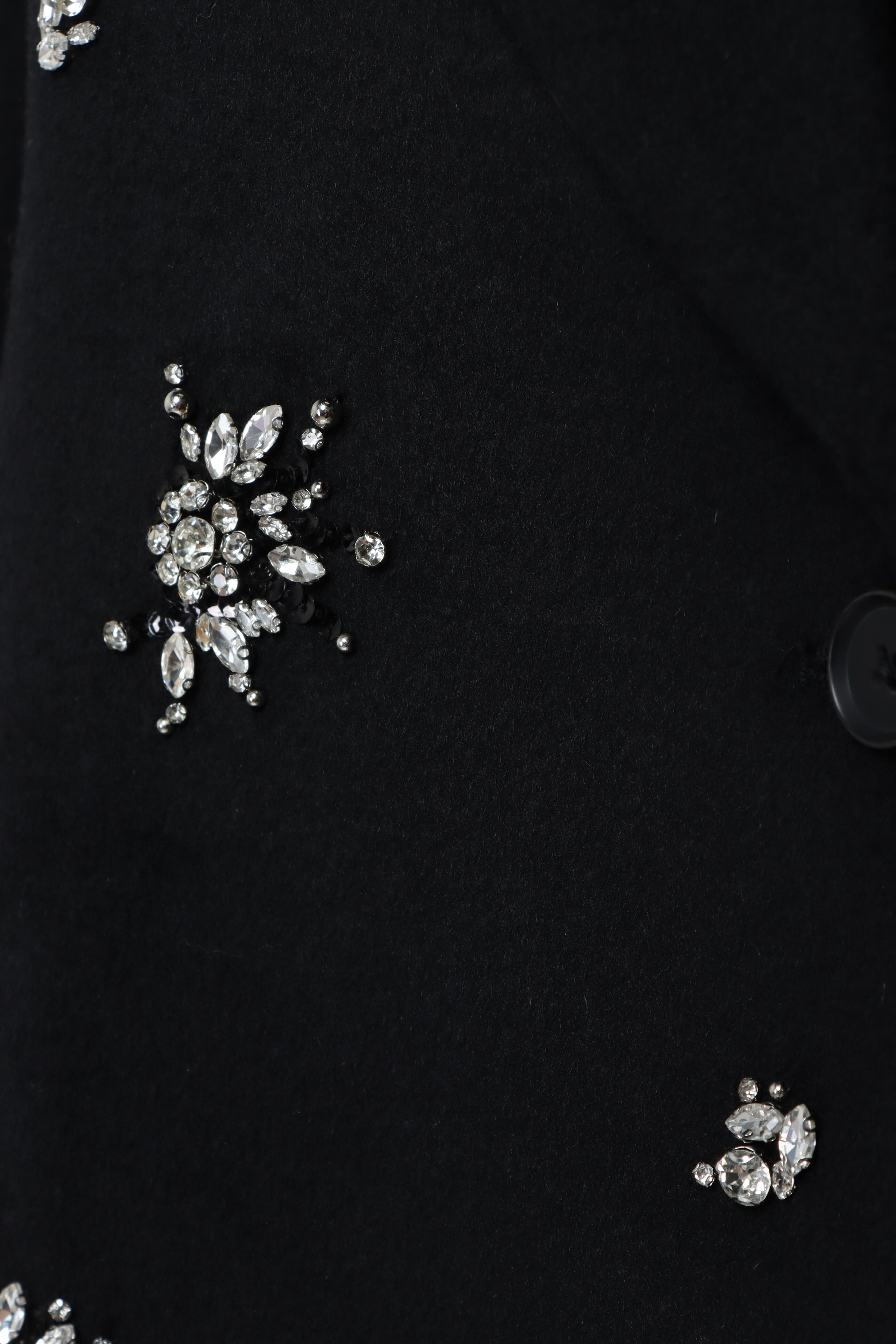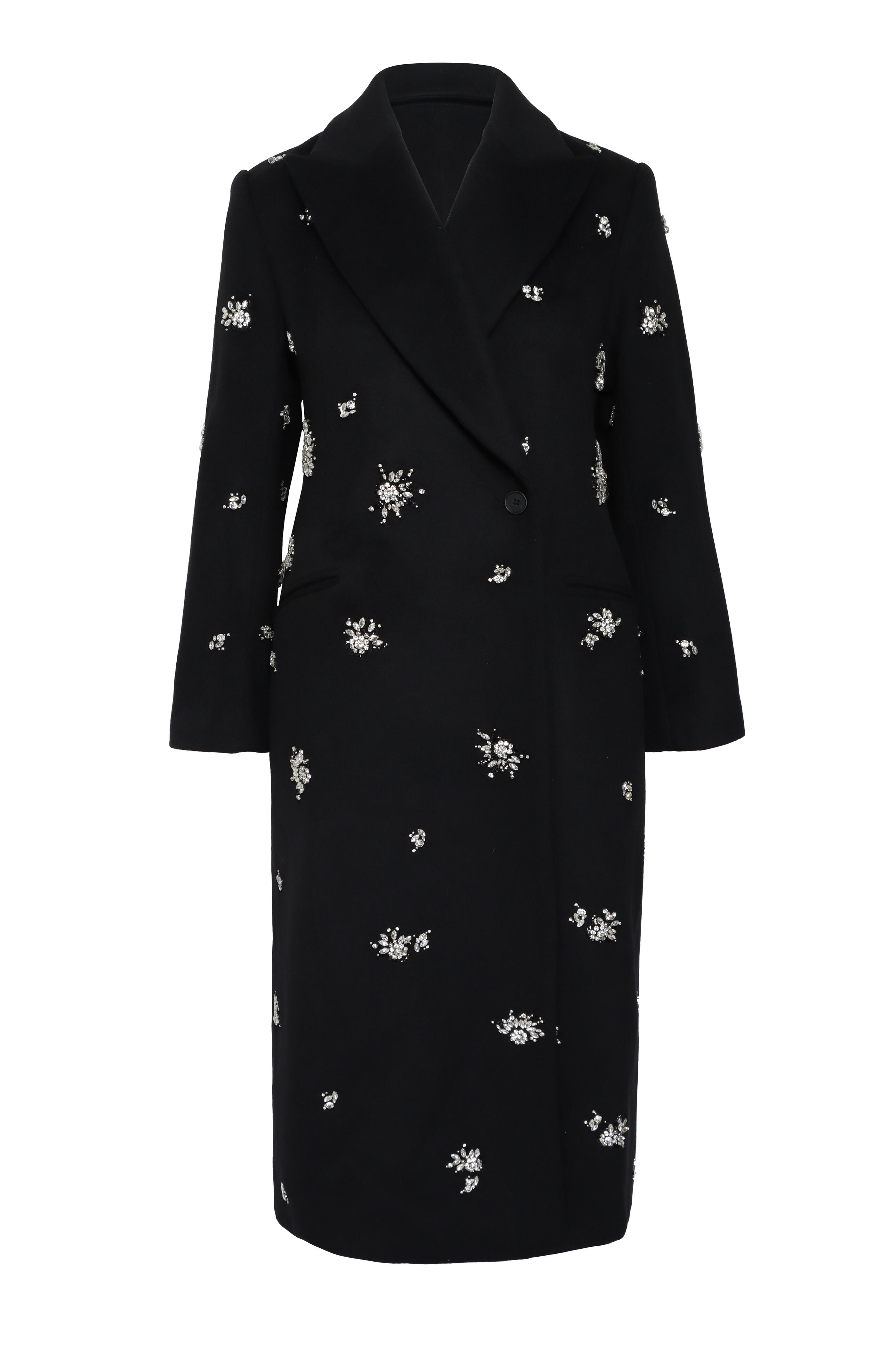 Peak lapel. Long sleeves; button cuffs. Single front button closure. Hip welt pocket. Embellished detail throughout. Imported. Long length. 70% wool, 30% polyester outer, 55% polyester, 45% viscose lining. Dry clean.