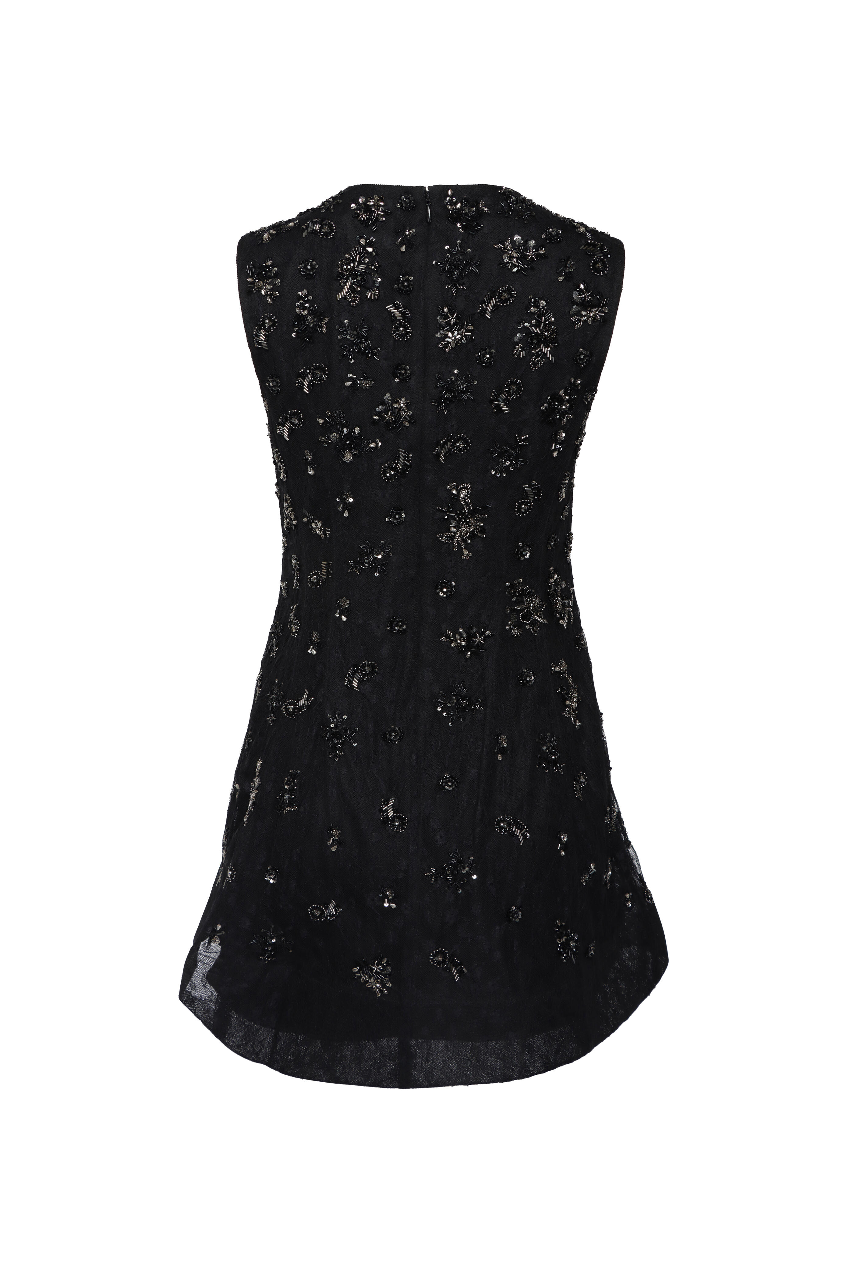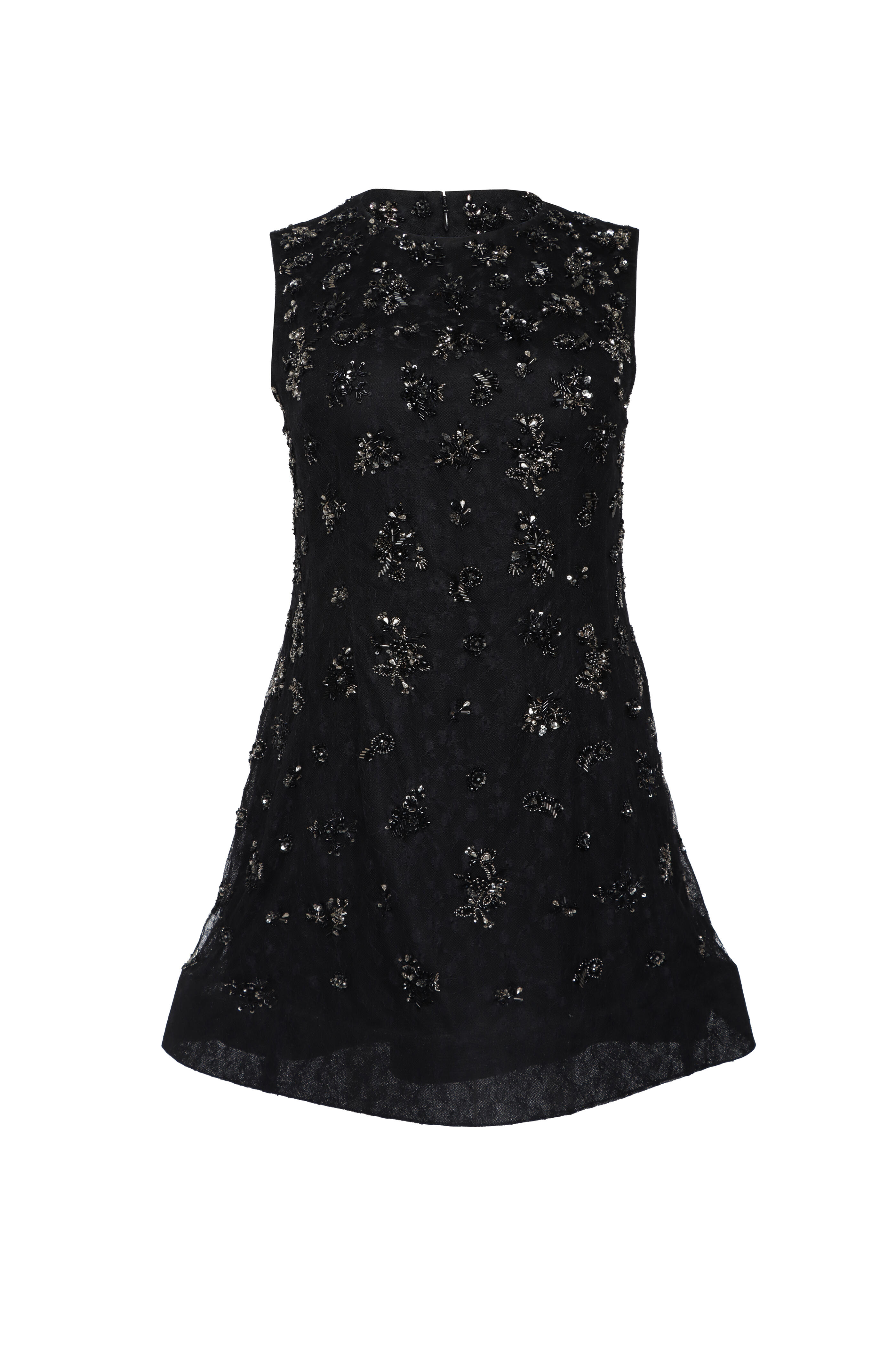 Crewneck. Sleeveless. Concealed back zip closure. Fit and flare silhouette. Embellished detail. Imported. Mini length. 100% polyamide. Dry clean.