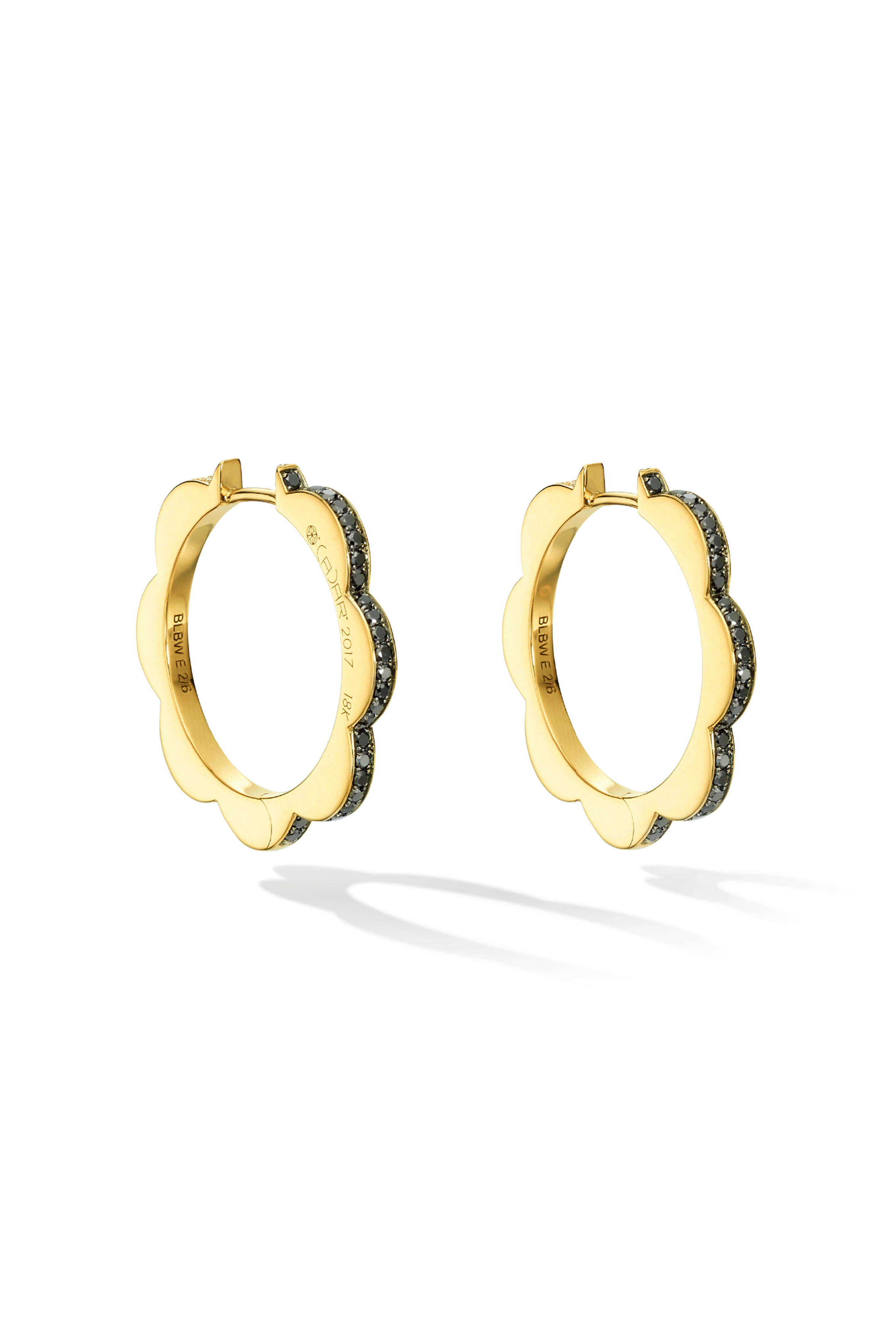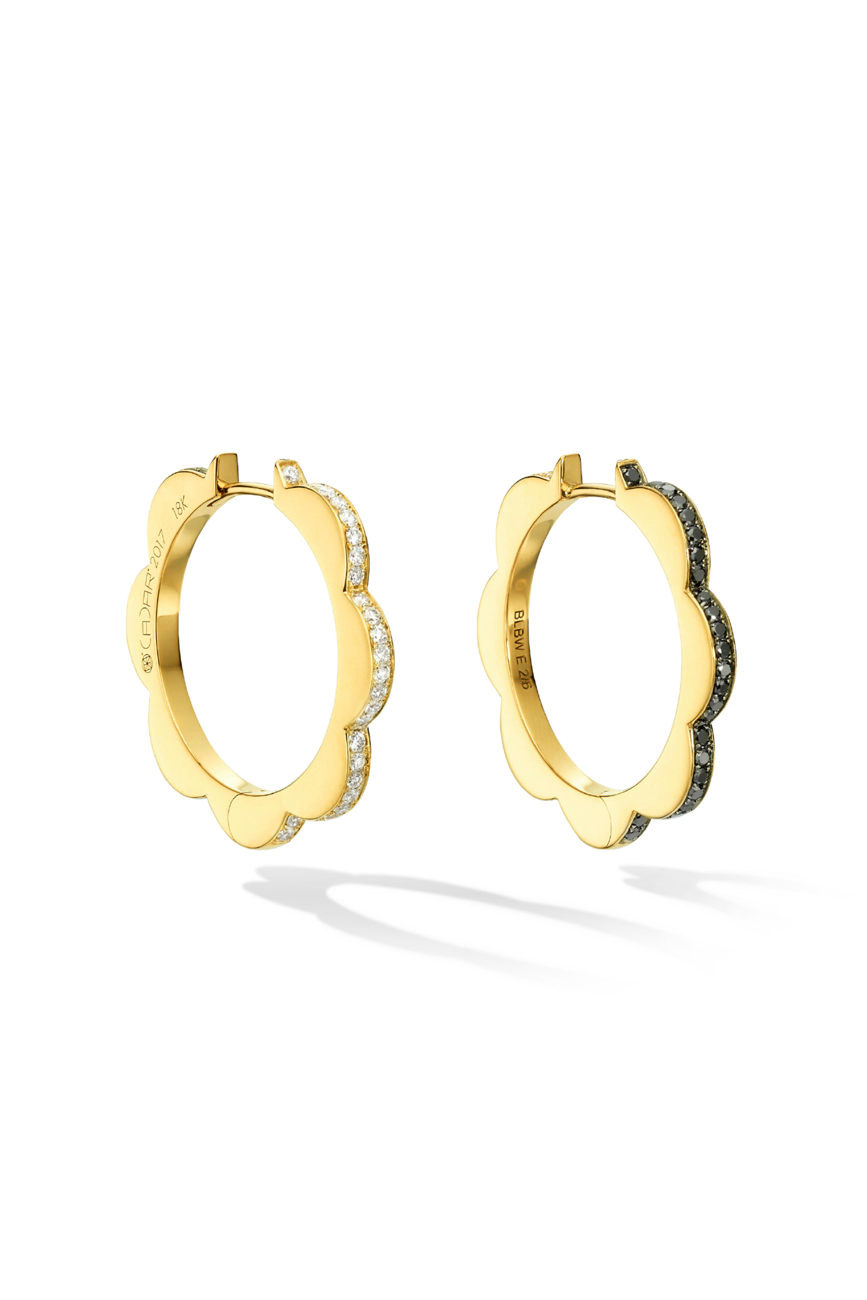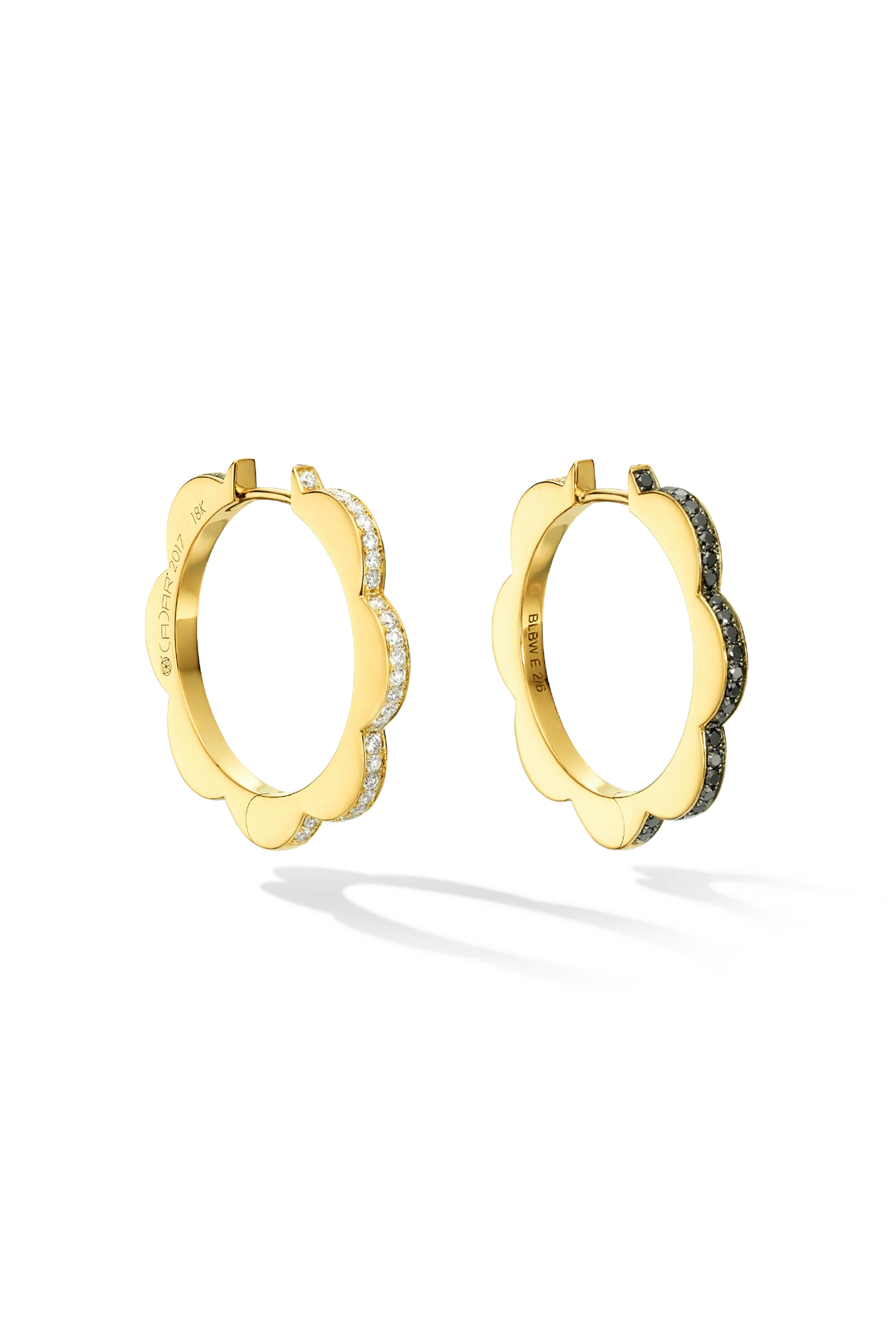 This versatile pair of medium yellow gold hoop earrings feature lustrous white pavè diamonds on one side and shining black pavè diamonds on the other. Feeling playful? Try sporting the black diamonds on one side and white on the other! It's like having three different pairs of hoops in one. Measuring 1 inch long, these floral hoops are light and comfortable for all-day wear and are still stunning for a special occasion. Sensational and sensible, these are bound to be your new favorite pair of hoops.
