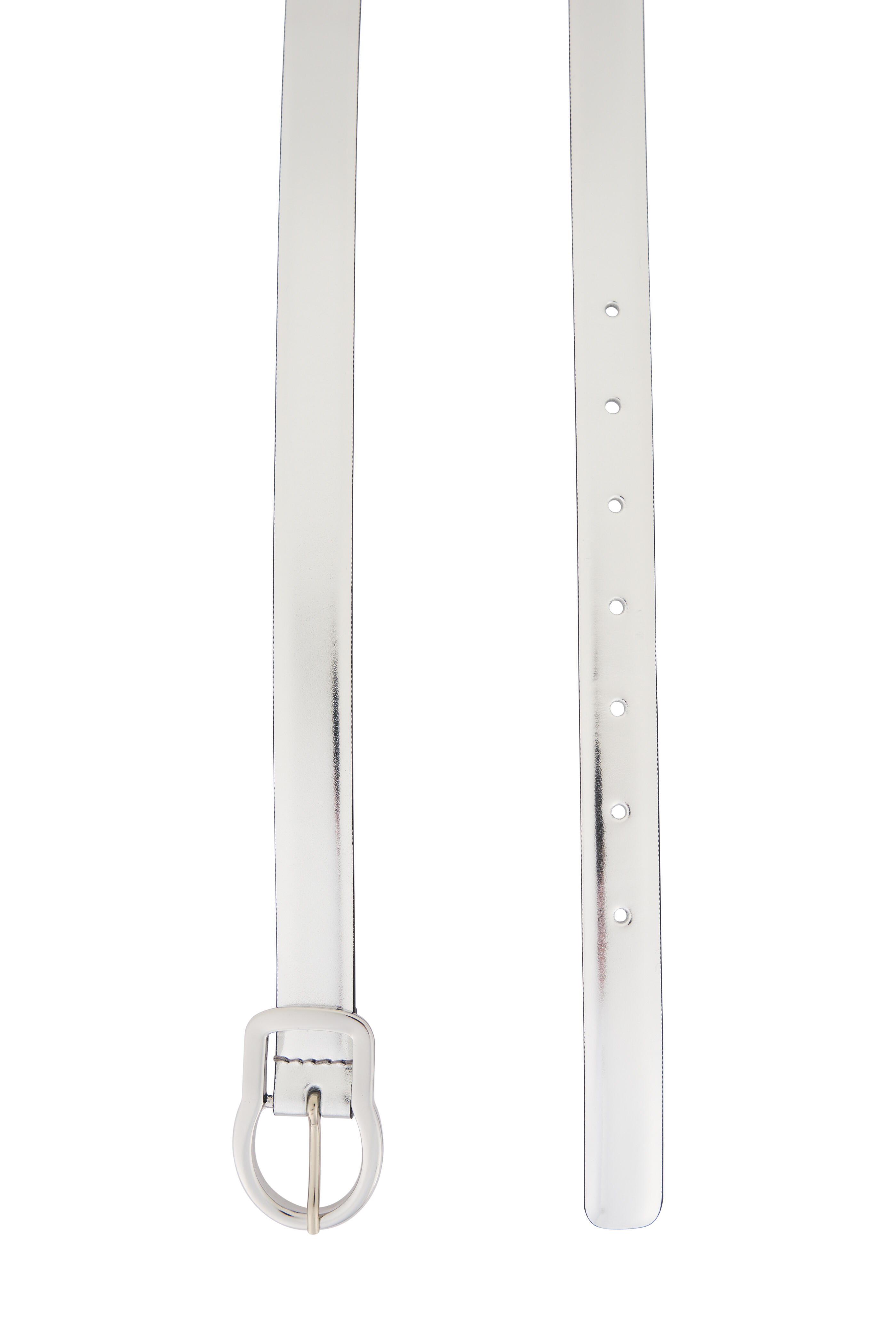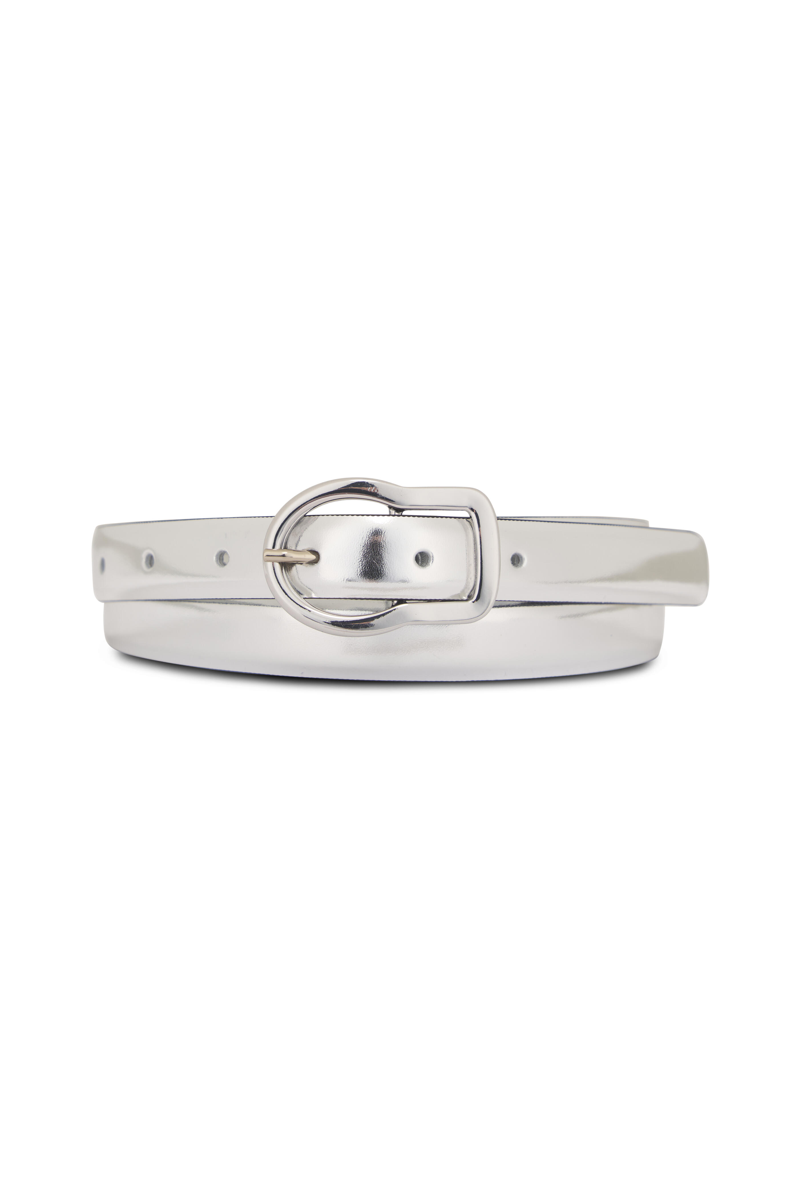 Metallic leather. Silver-toned buckle. Made in Italy. .75" width.
