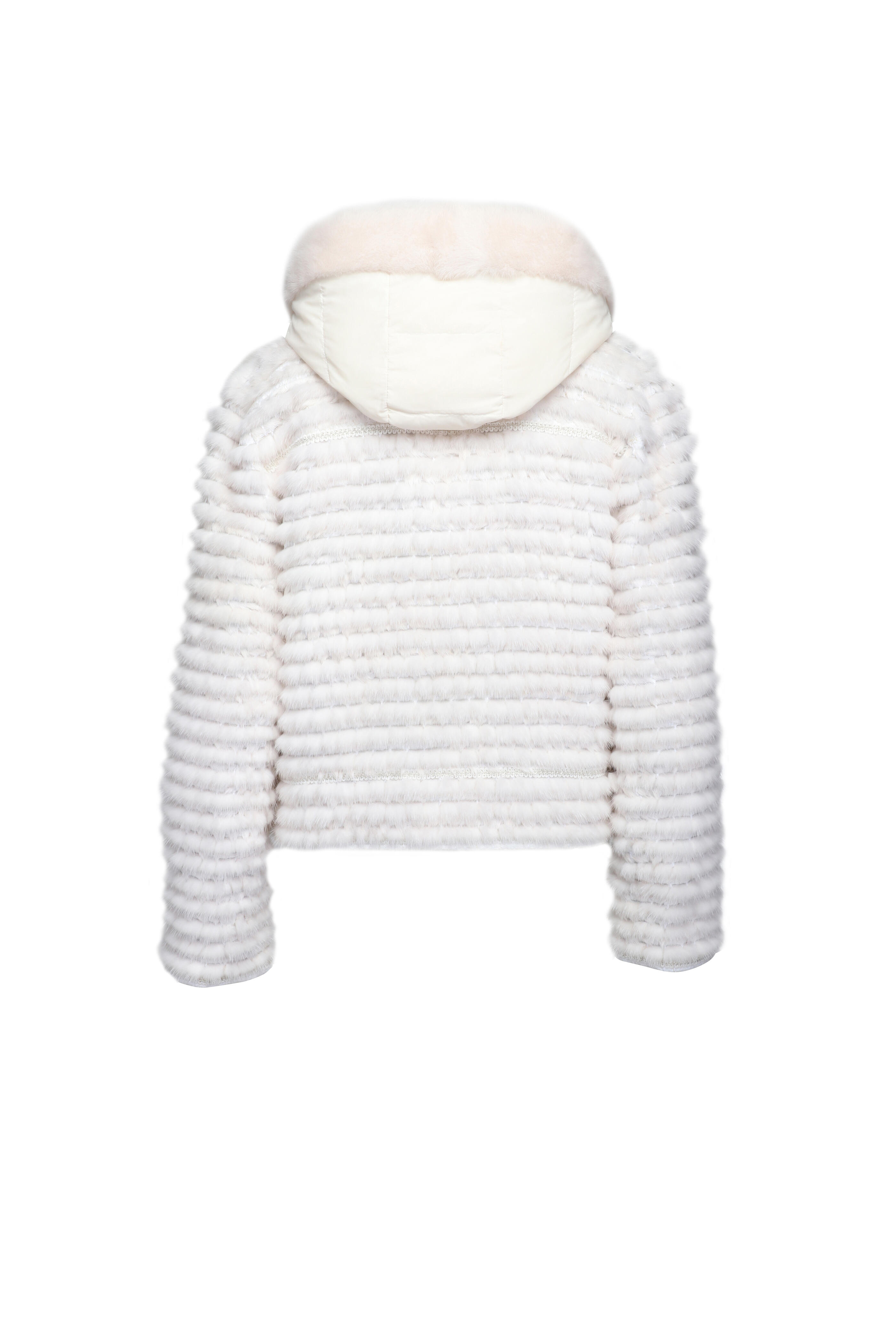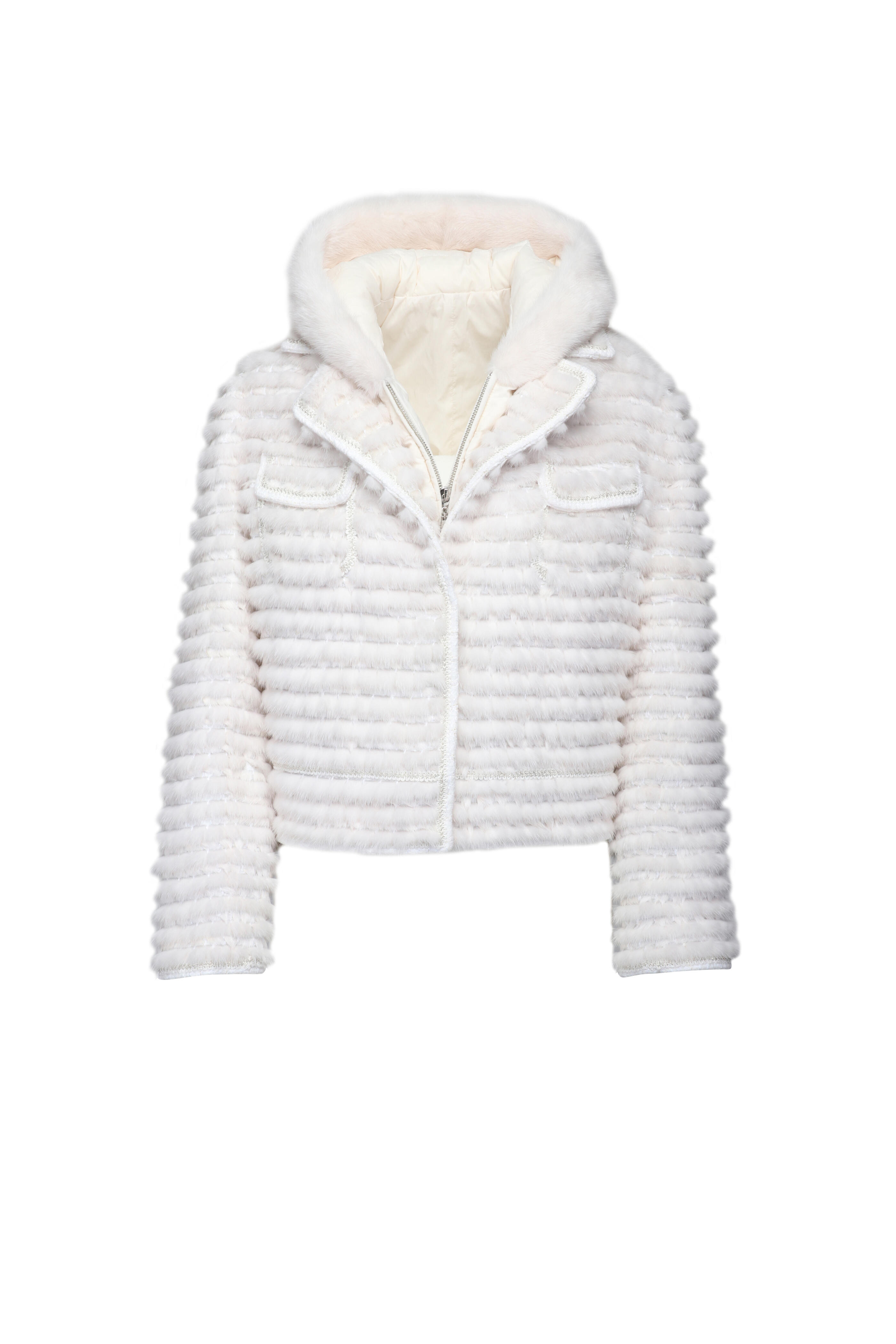Snap button closure. Zip closure. Hood. Lapel collar. Tweed design. Two in one; one vest and one bomber. Side slip pockets. Long sleeves. Made in the USA. Fits true to size. 100% fox fur; 100% tweed. Dry clean only.