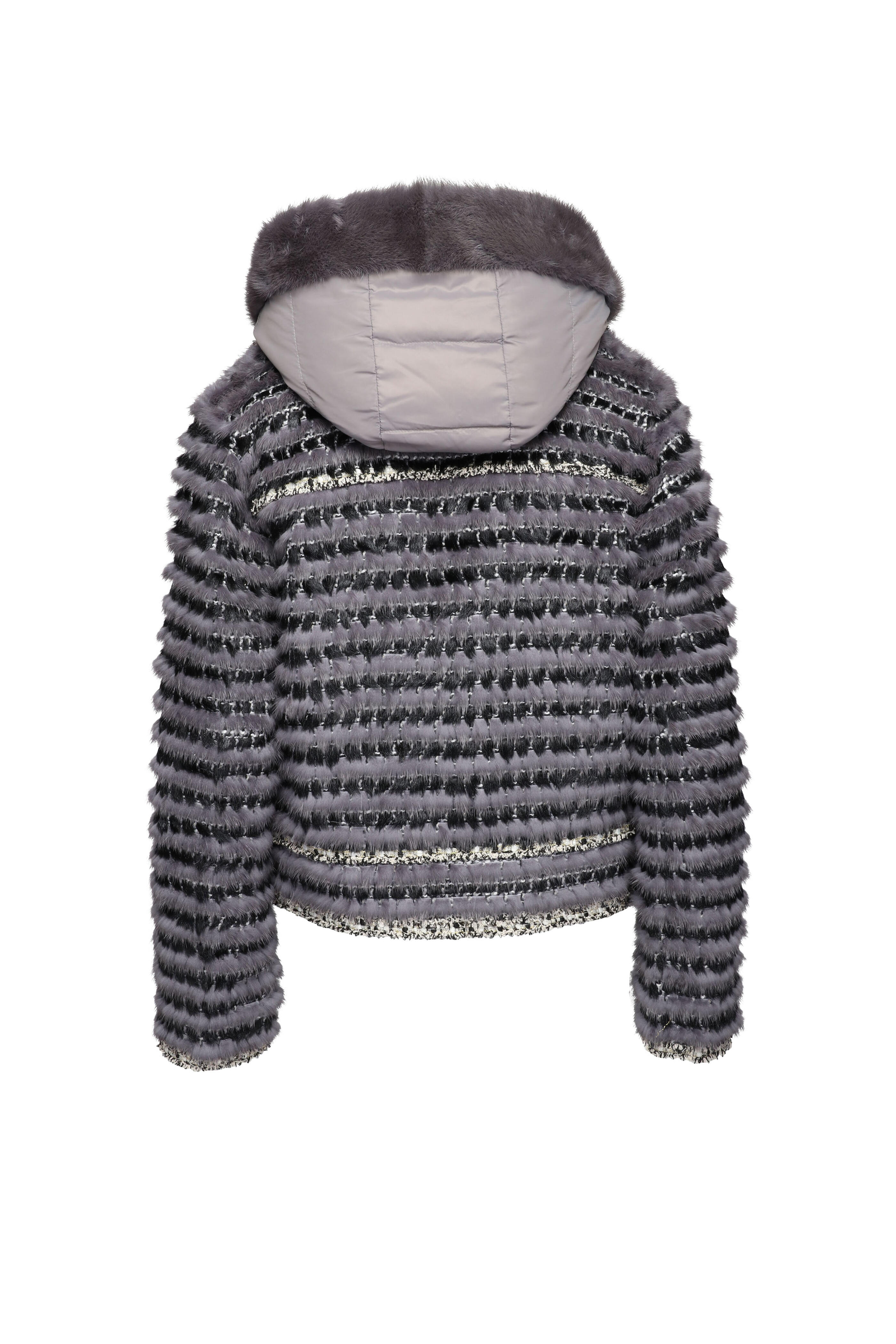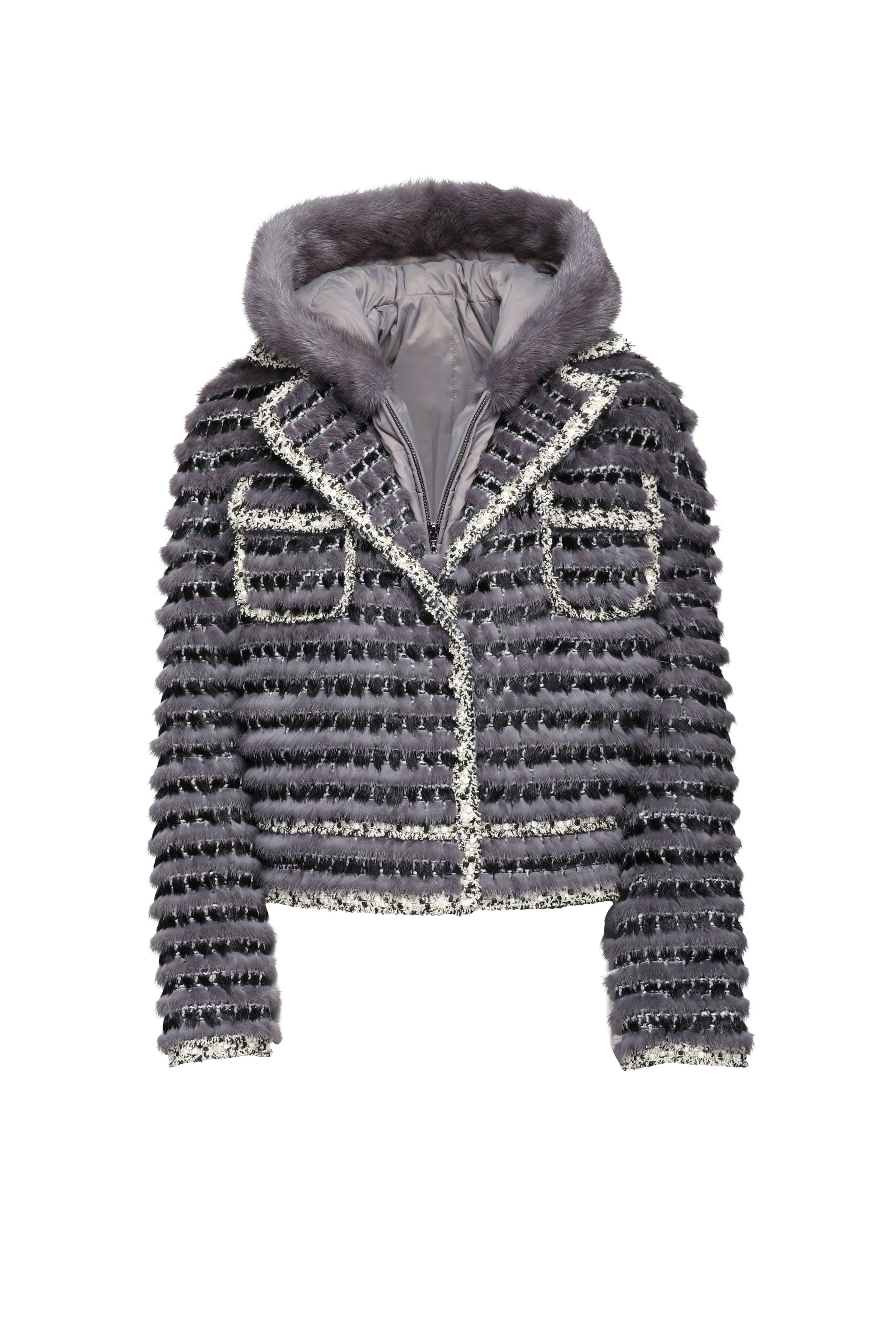 Snap button closure. Zip closure. Hood. Lapel collar. Tweed design. Two in one; one vest and one bomber. Side slip pockets. Long sleeves. Made in the USA. Fits true to size. 100% fox fur; 100% tweed. Dry clean only.