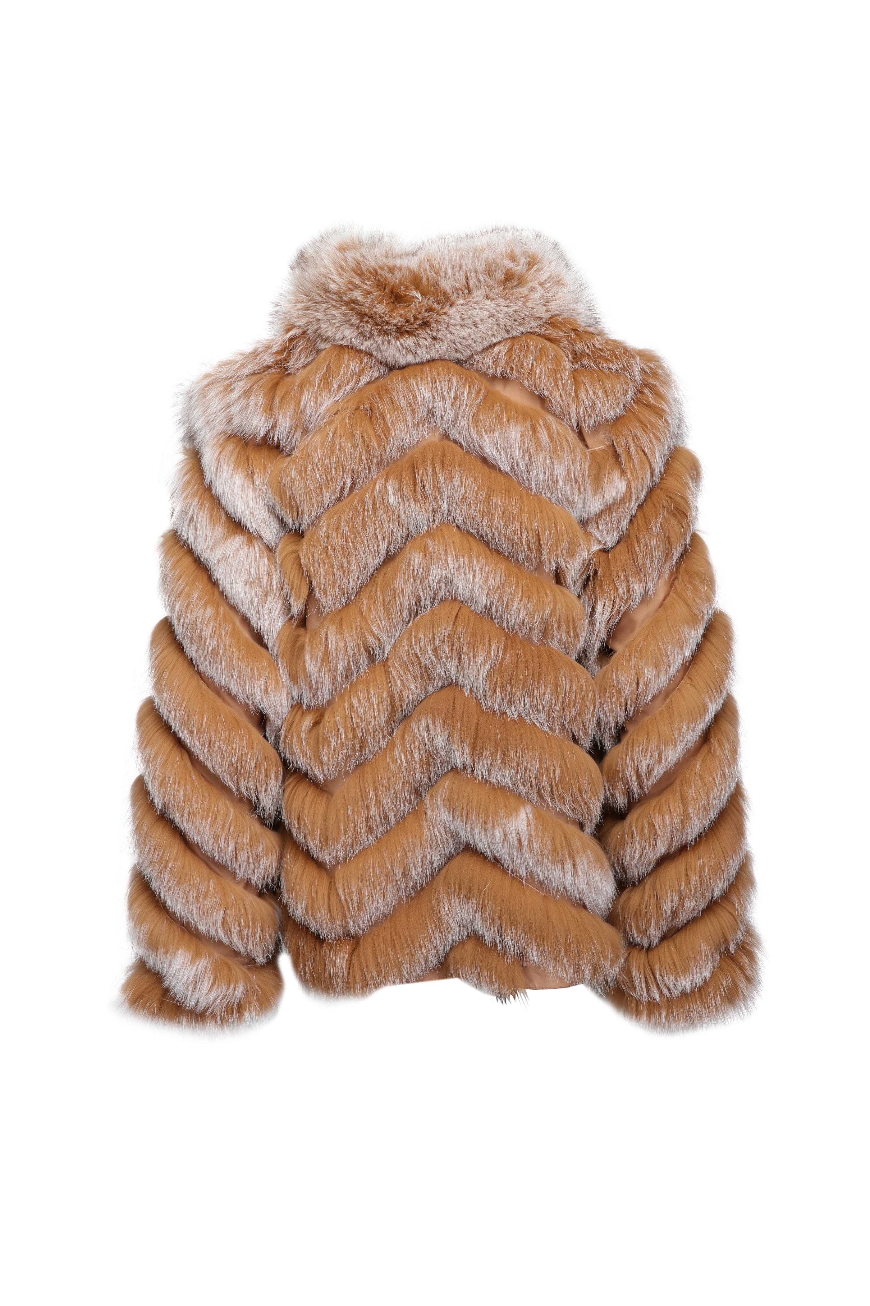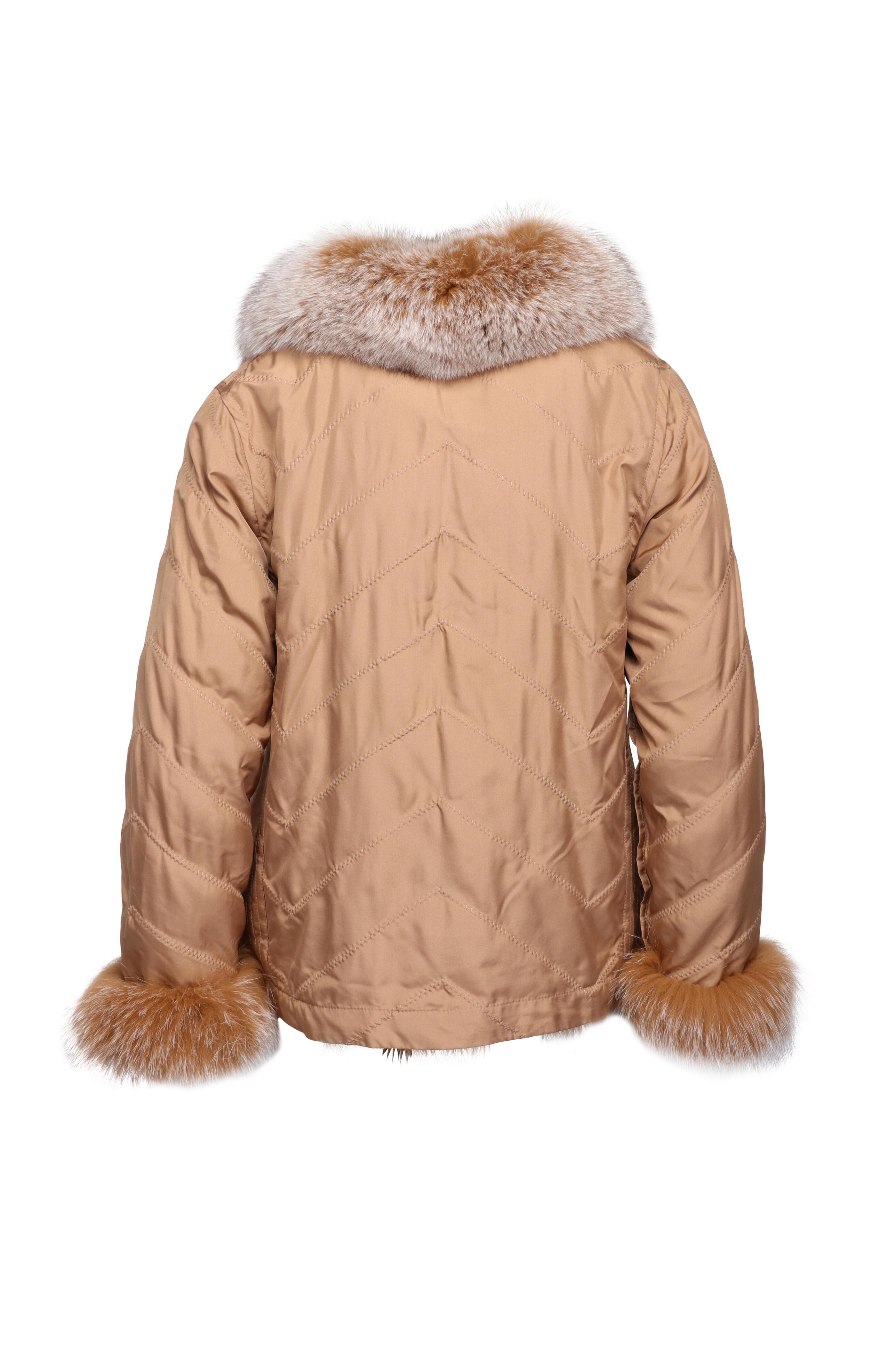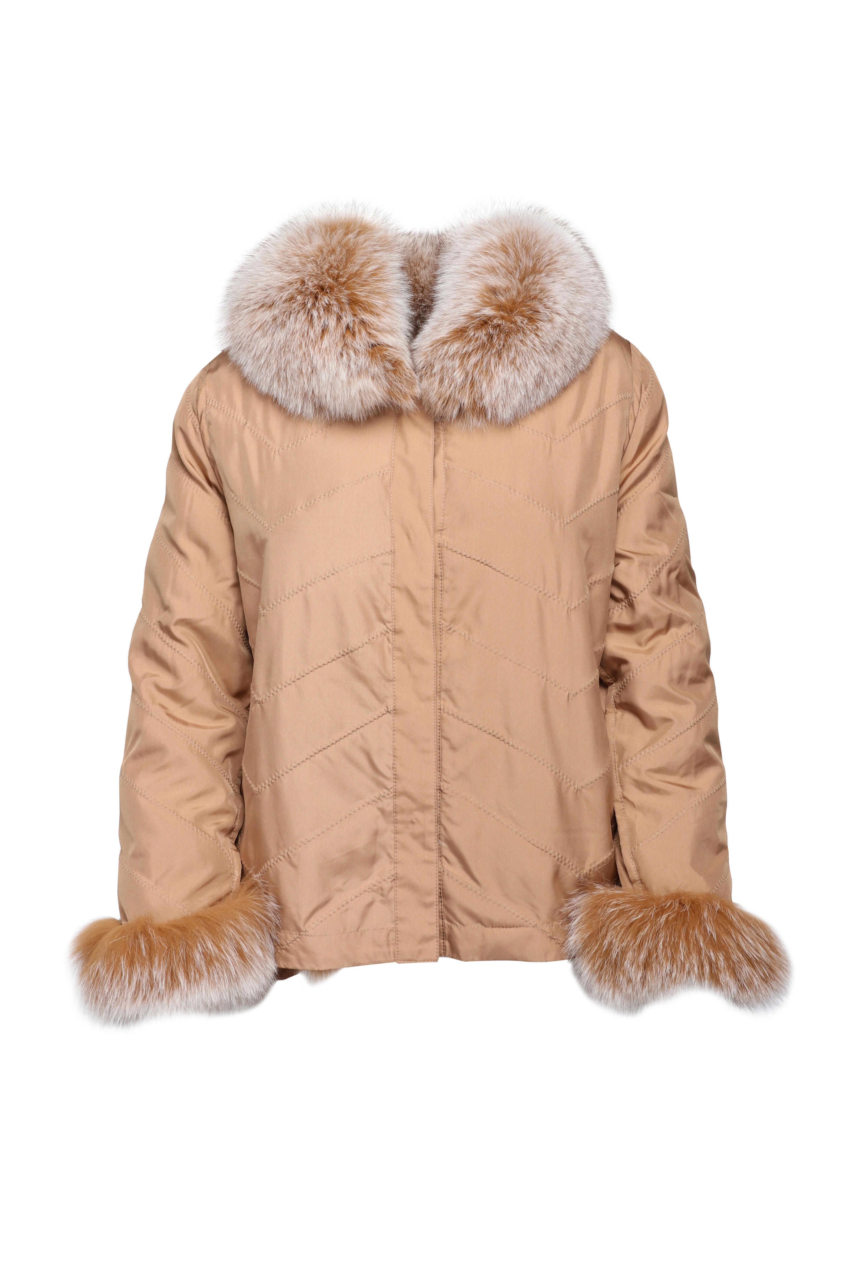 Notched collar. Snap button closure. Side slip pockets. Reversible. Long sleeves. Made in the USA. Fits true to size. 100% silk nylon, 100% fox fur. Dry clean only.