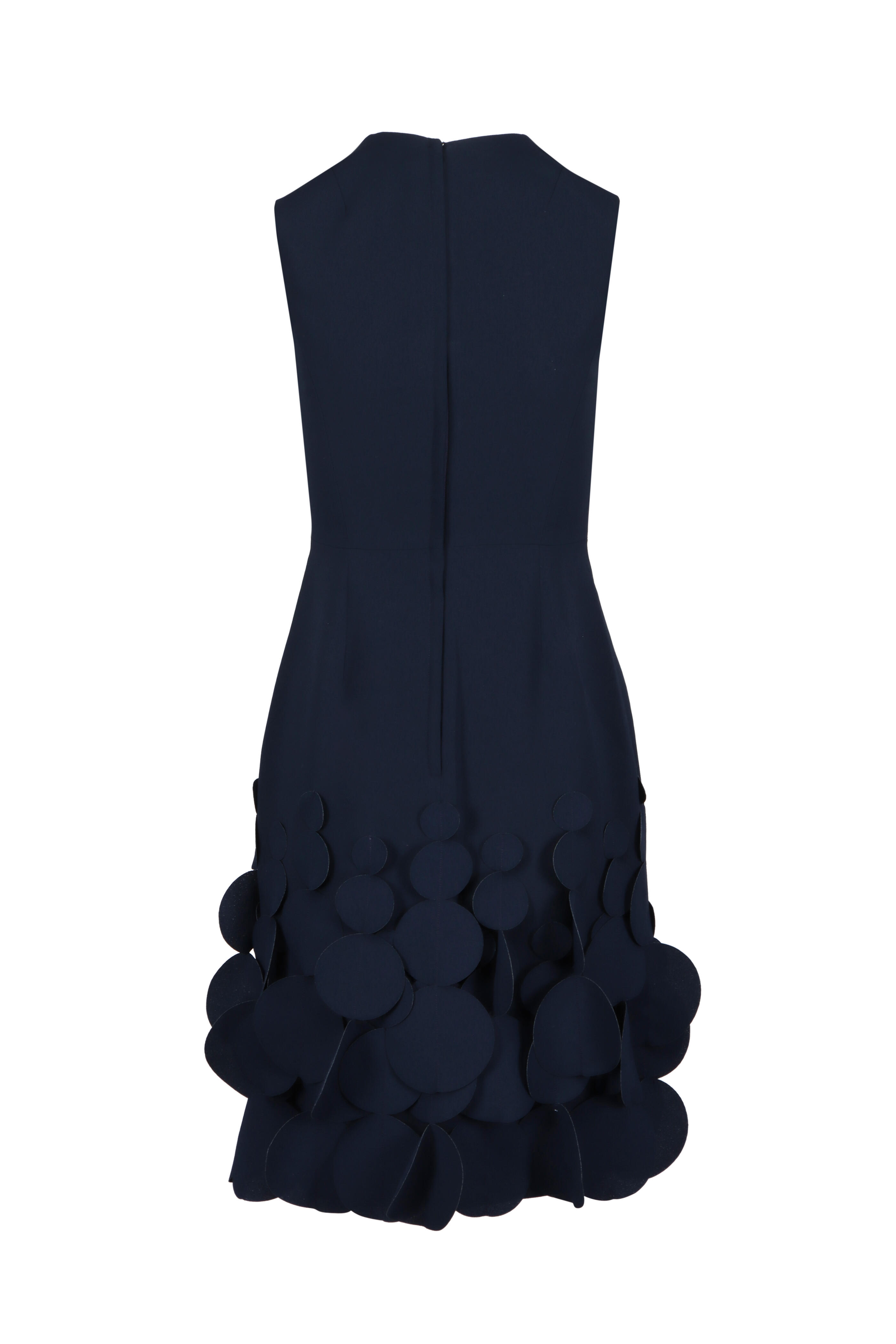 Jewel neckline. Sleeveless. Hidden zipper at back with hook and eye. Swinging disc detail at hem. Slit at back. Imported. True to size. 100% polyester. Dry clean only.