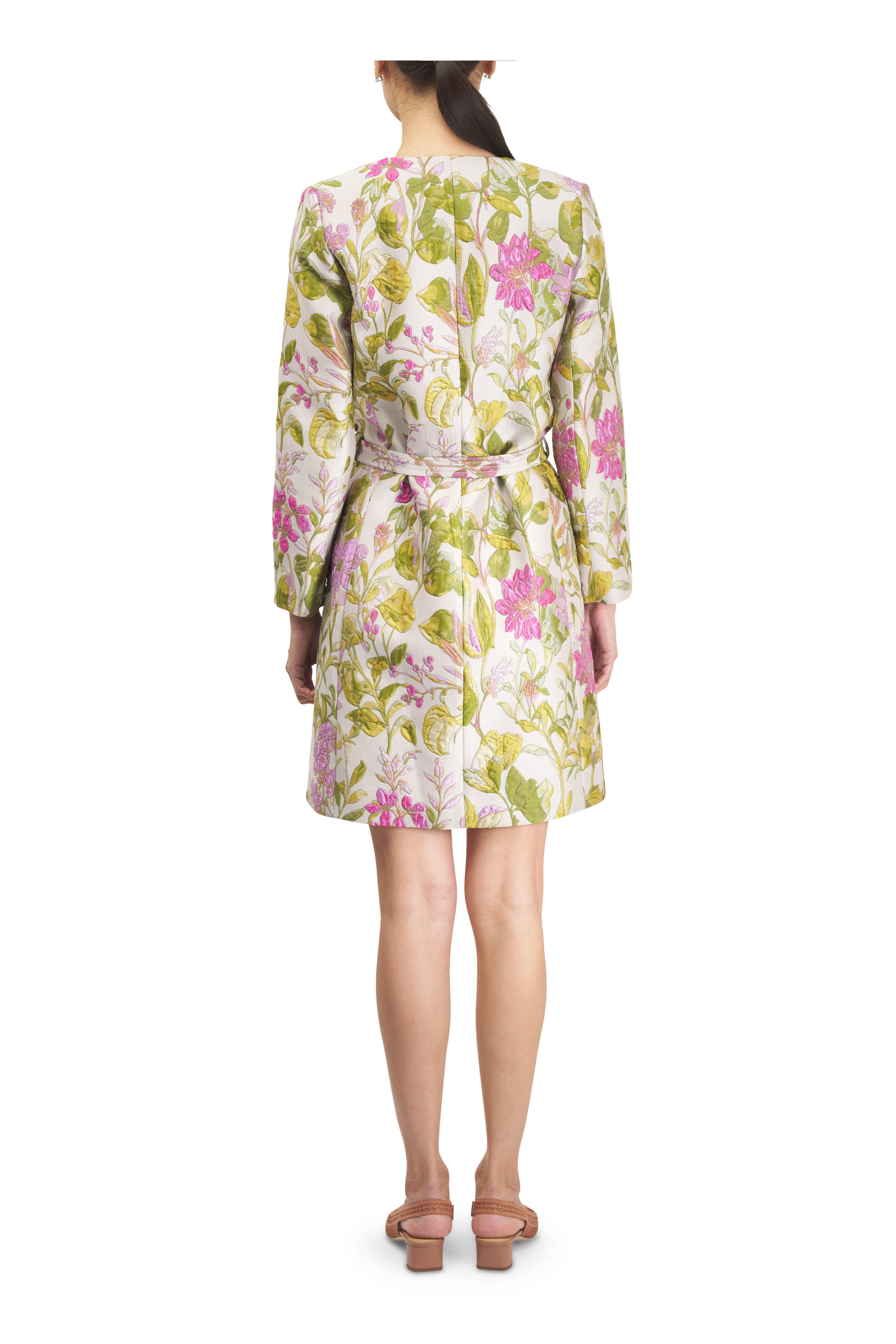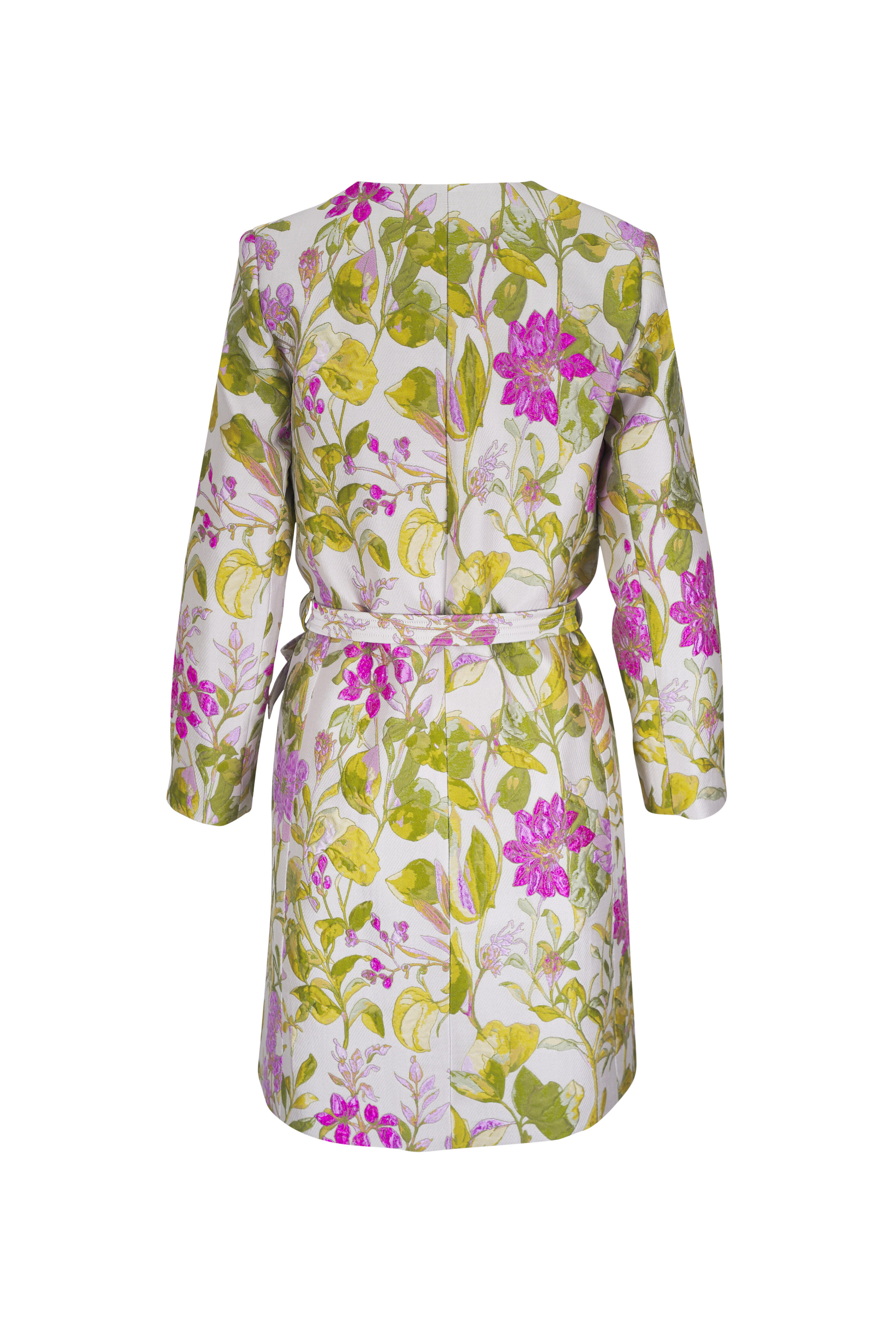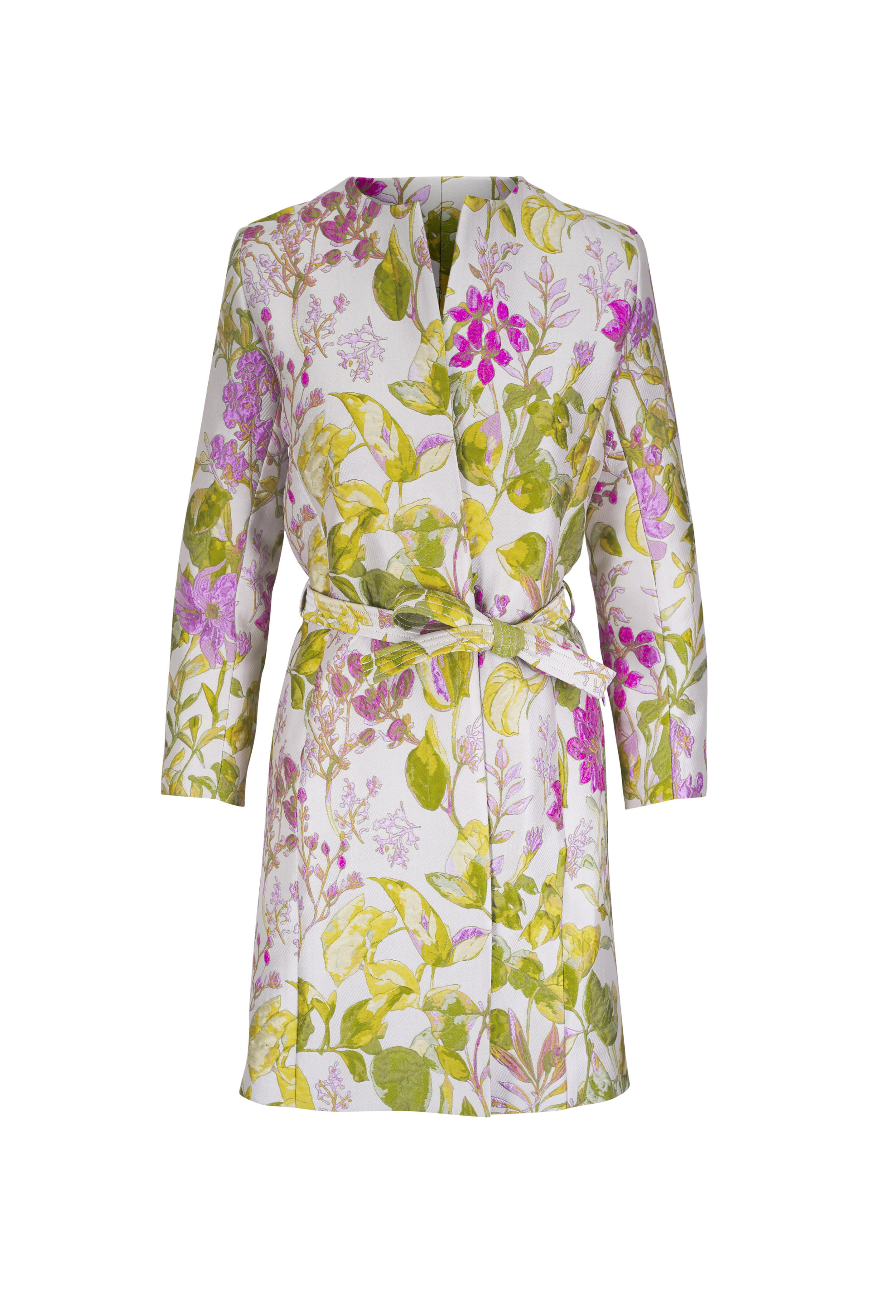 Collarless. Open front. Self tie fabric belt. Made in the USA. Approx. 36" shoulder to hem (measurements from size S). 46% polyester, 36% recycled polyester, 10% silk, 8% polyamide; lined. Dry clean.