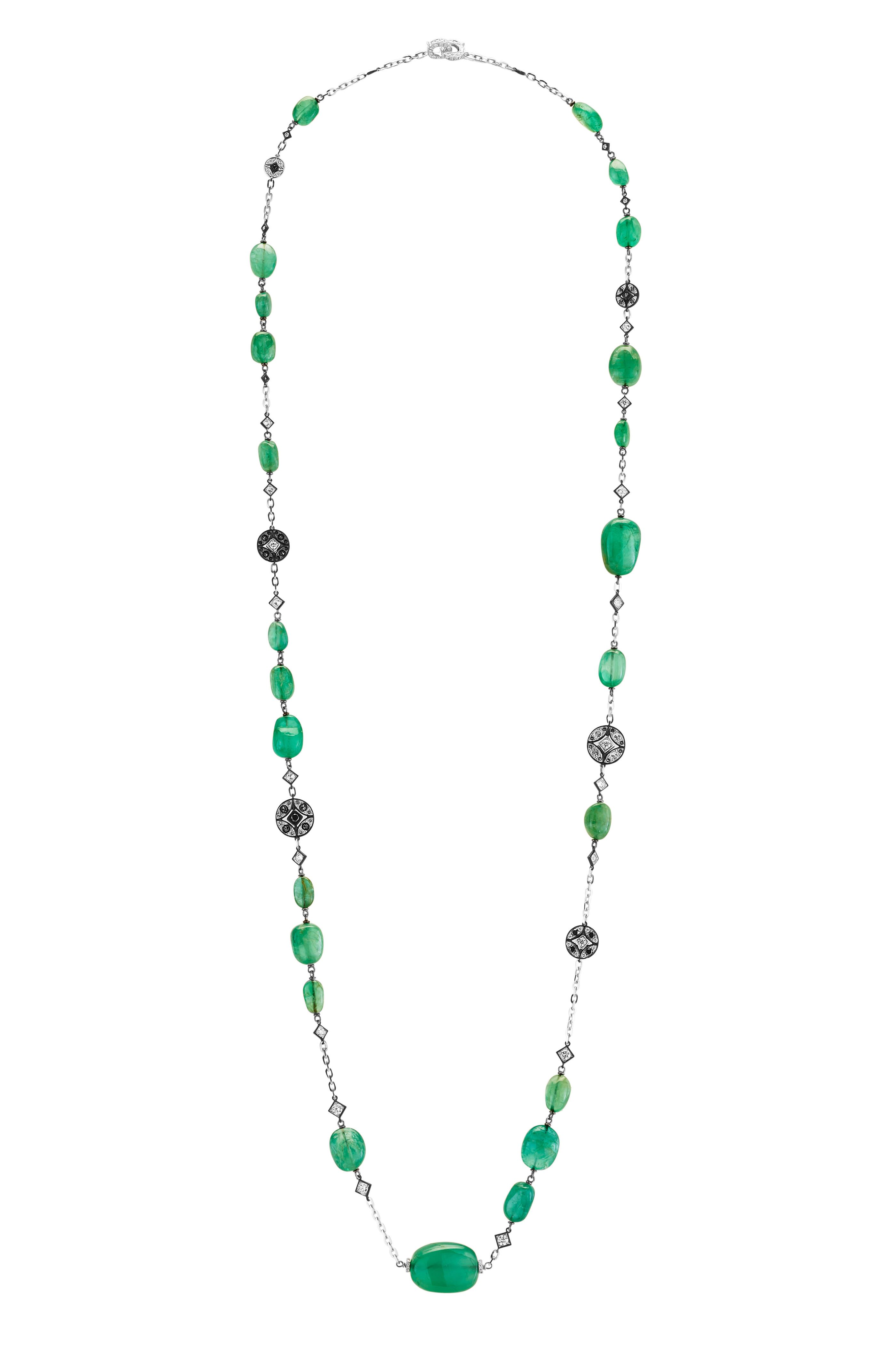 18k White Gold. 1.90 ct Black Diamond. 5.15 ct White Diamond. 237.65 ct Emerald.
