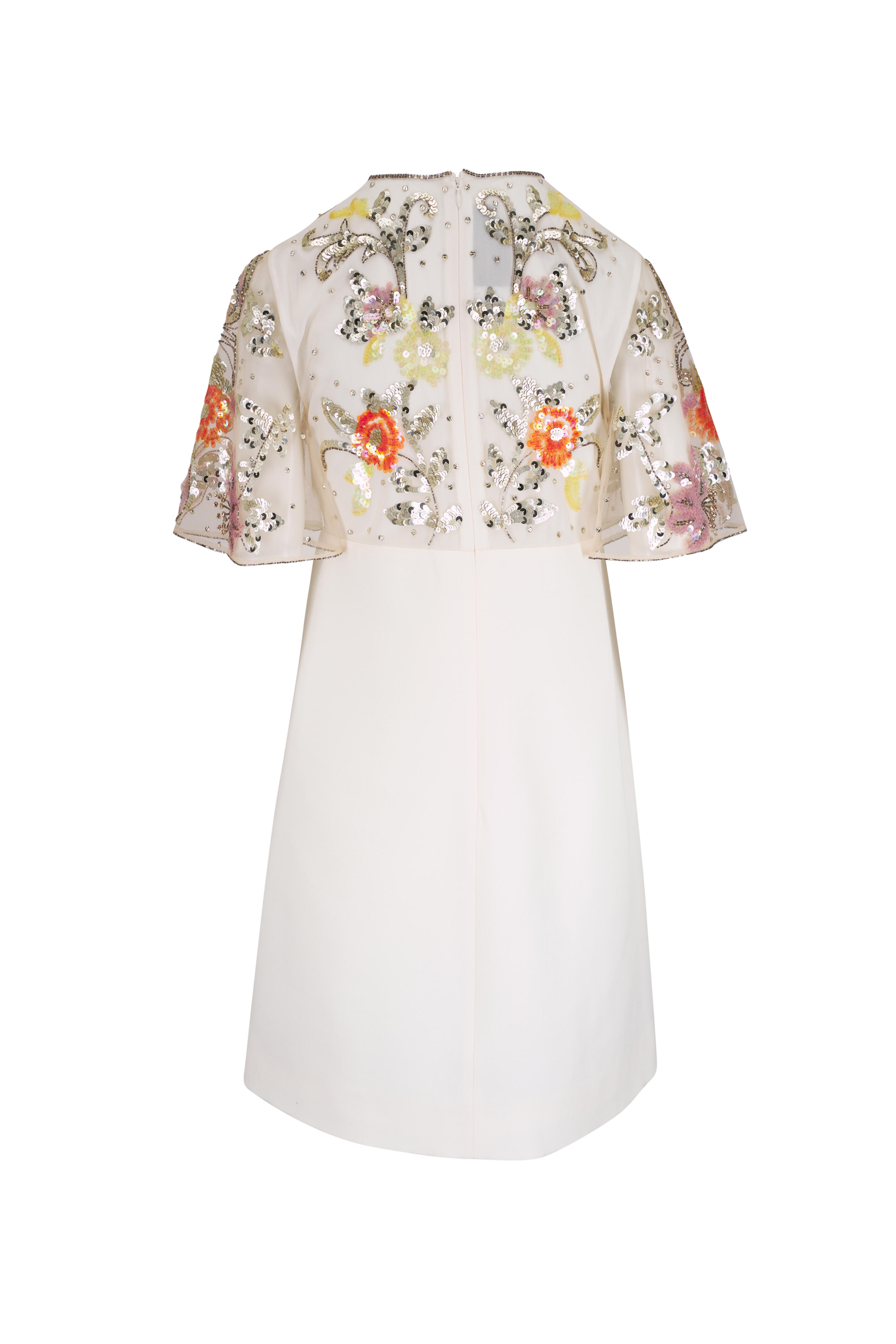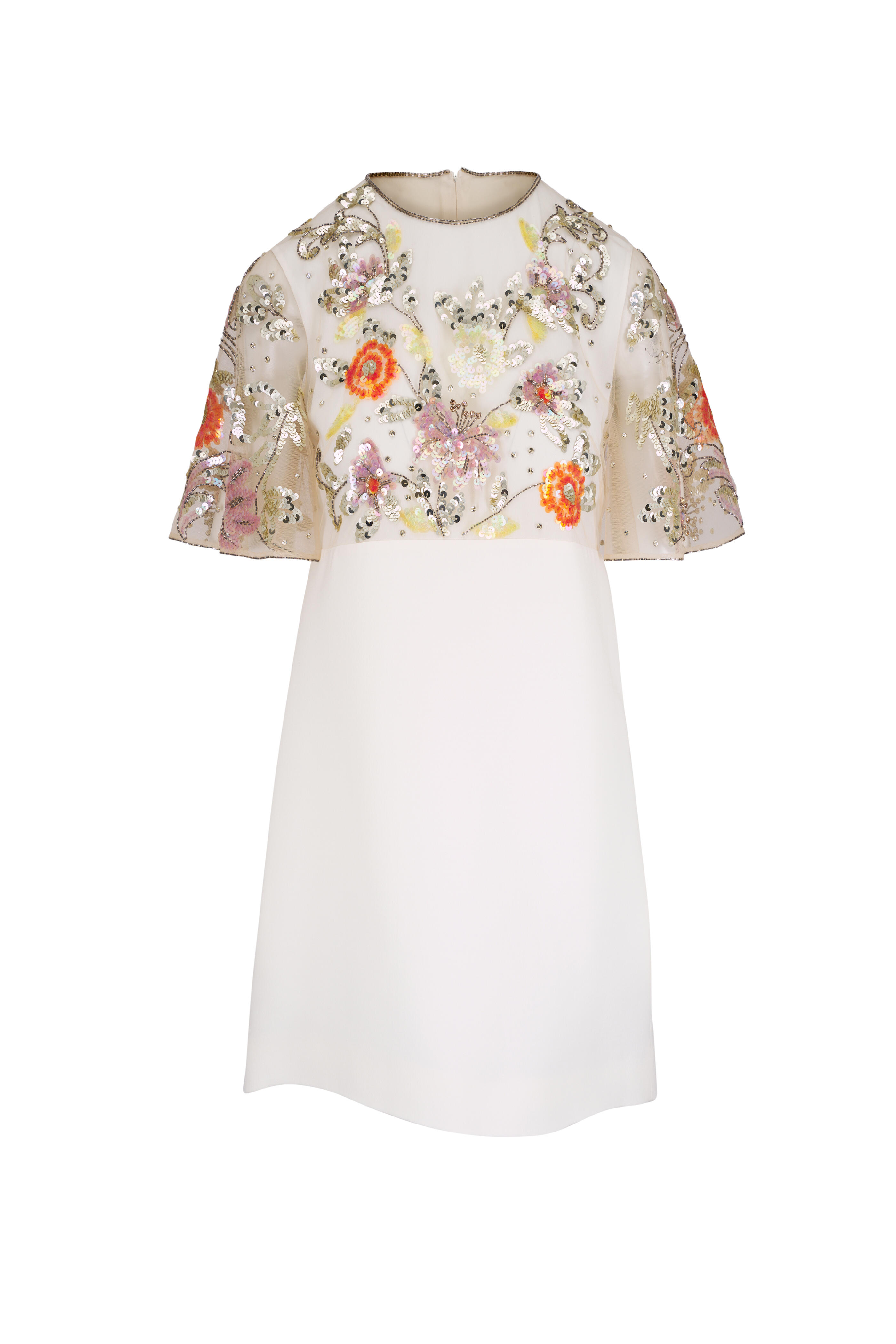 Jewel neckline. Concealed back zip. Sheer overlay with paillettes and bead embroidery. Made in Italy. 100% polyamide; fabric 2: 65% virgin wool, 35% silk; lining: 100% silk. Dry clean.