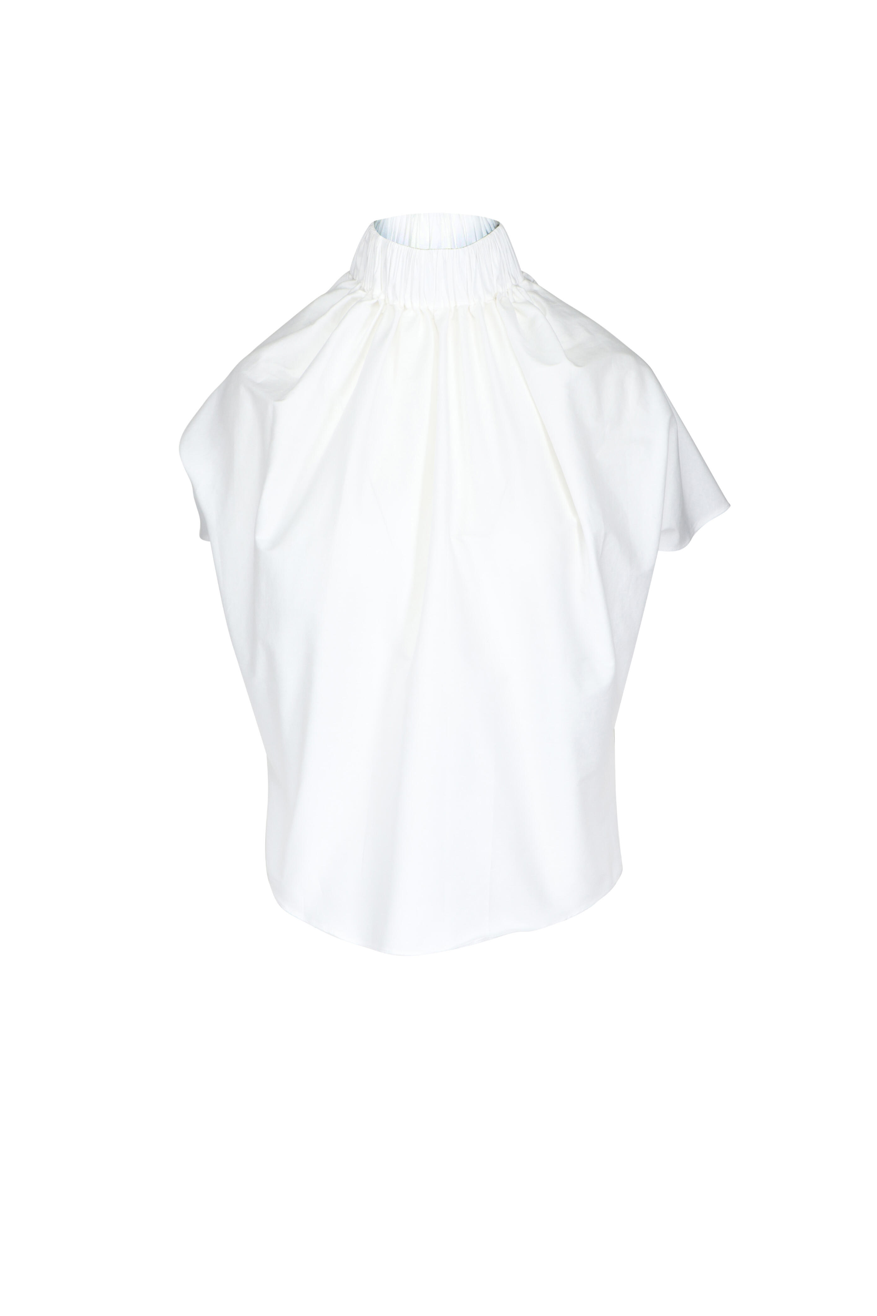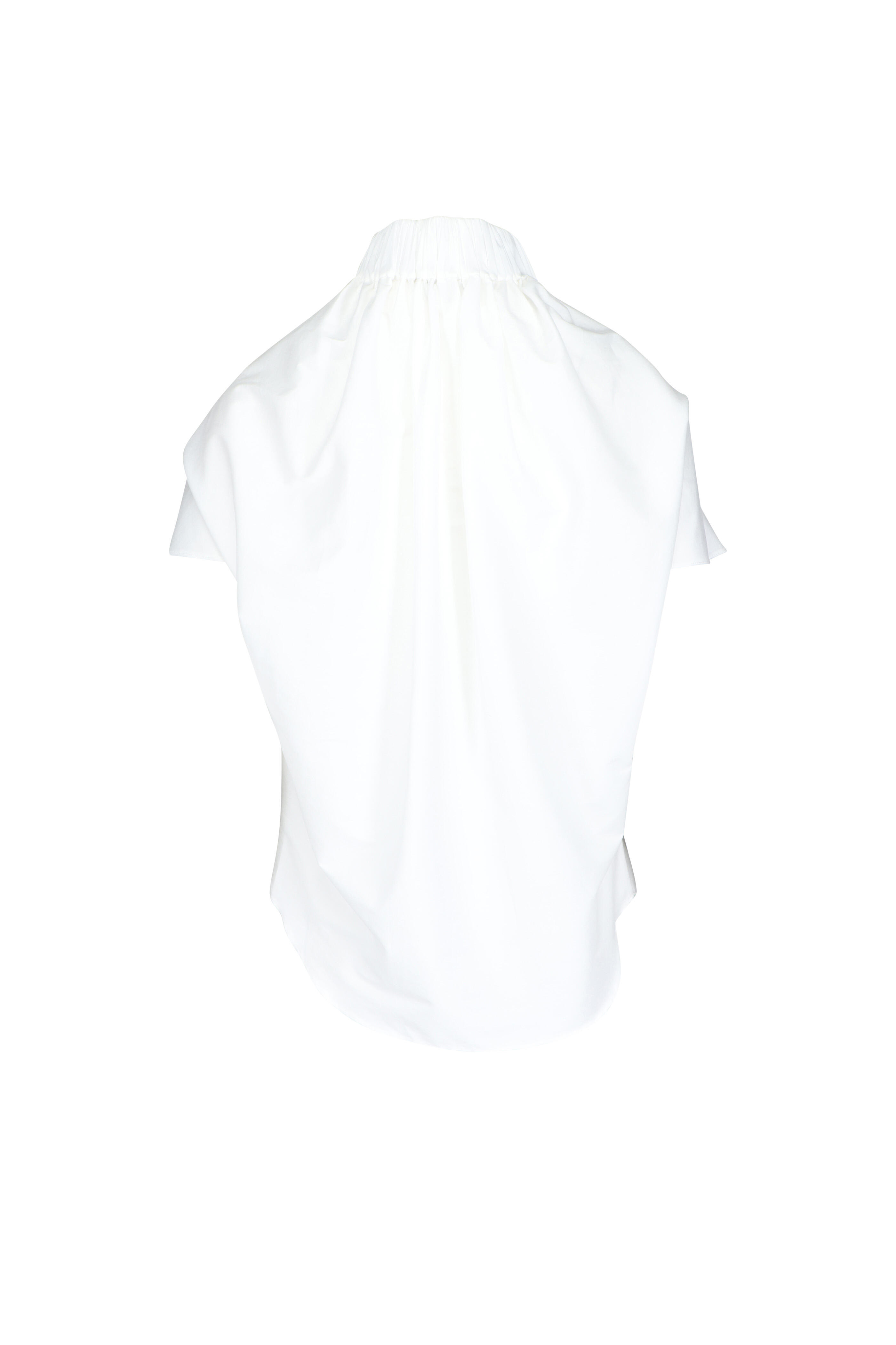 Elastic ruffled stand collar. Short sleeves. Made in England. Relaxed fit. 79% cotton, 18% polyamide, 3% elastane. Dry clean.