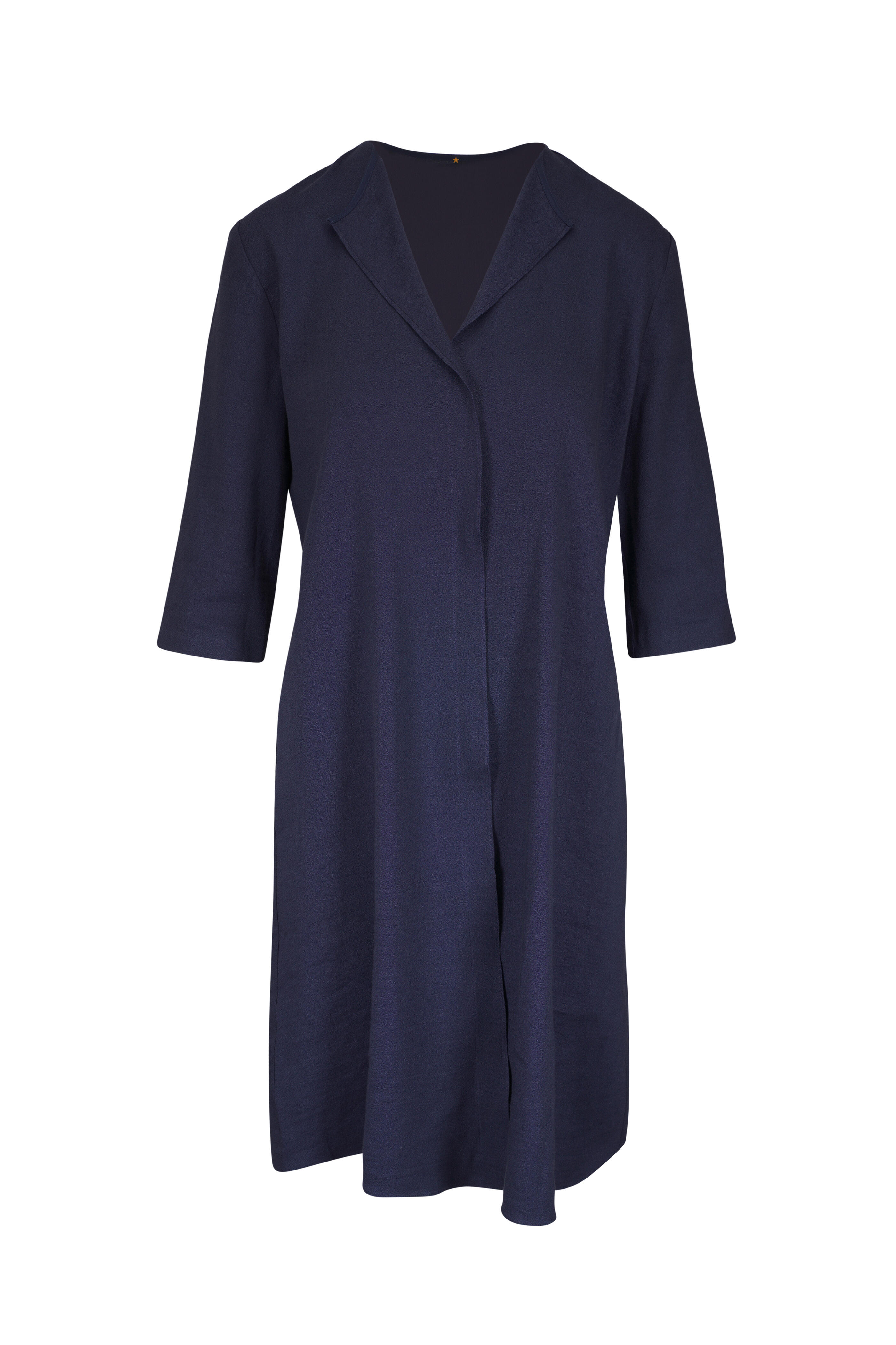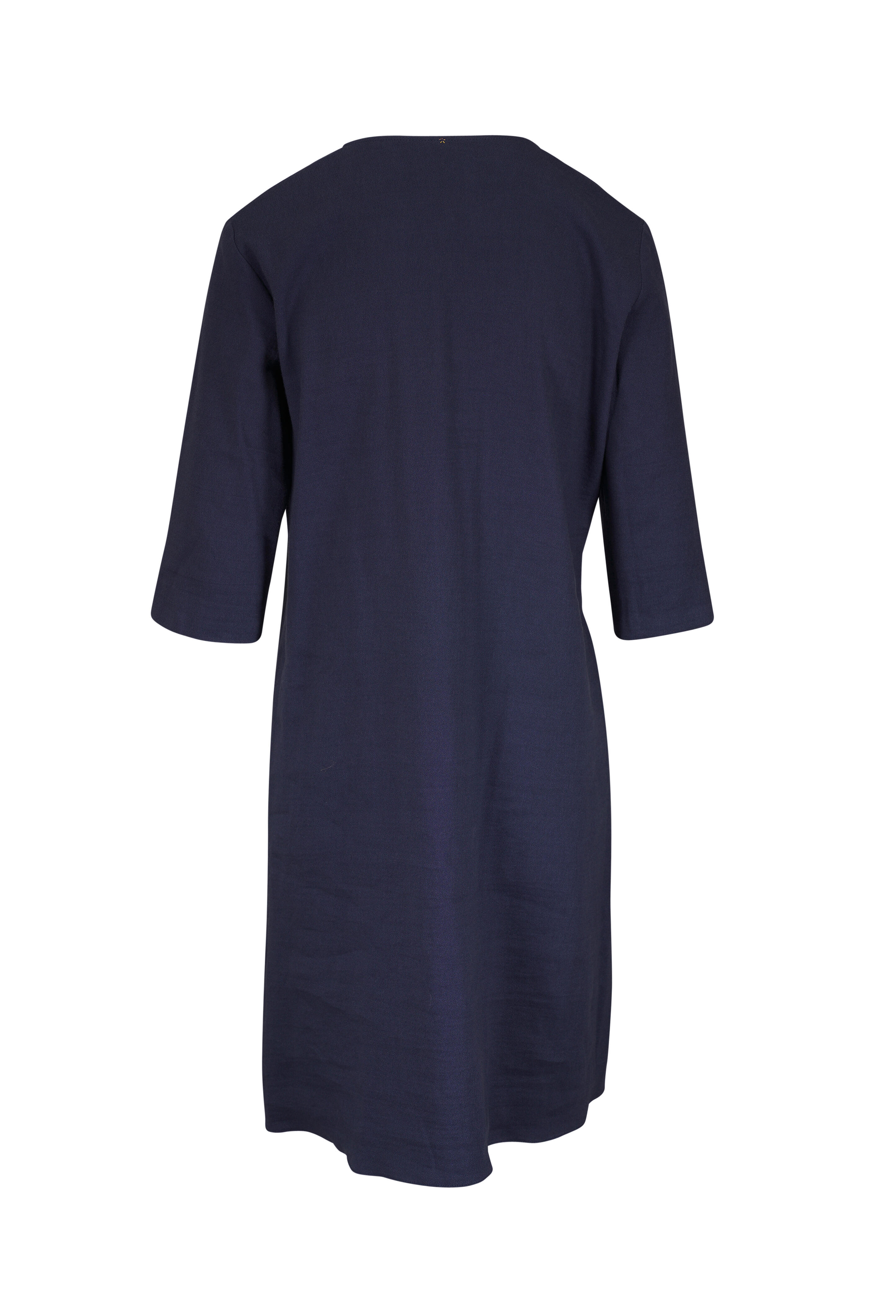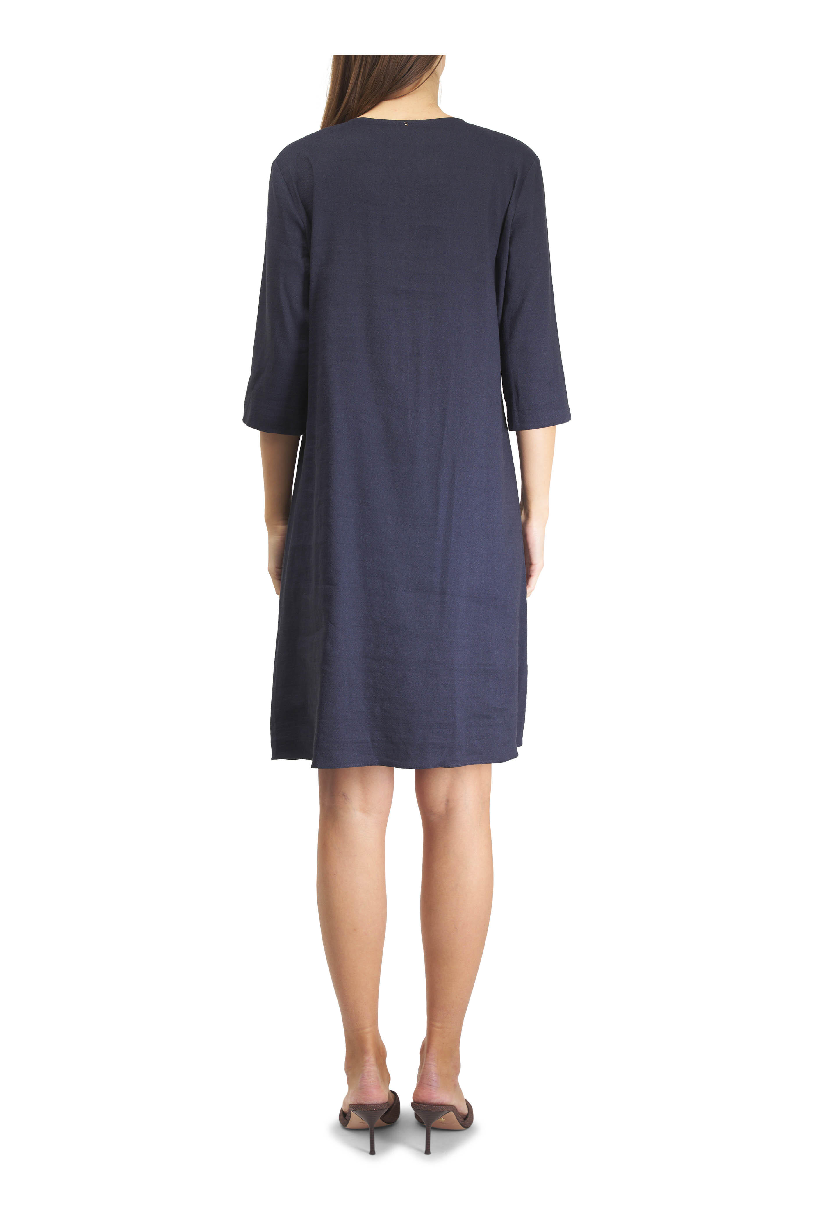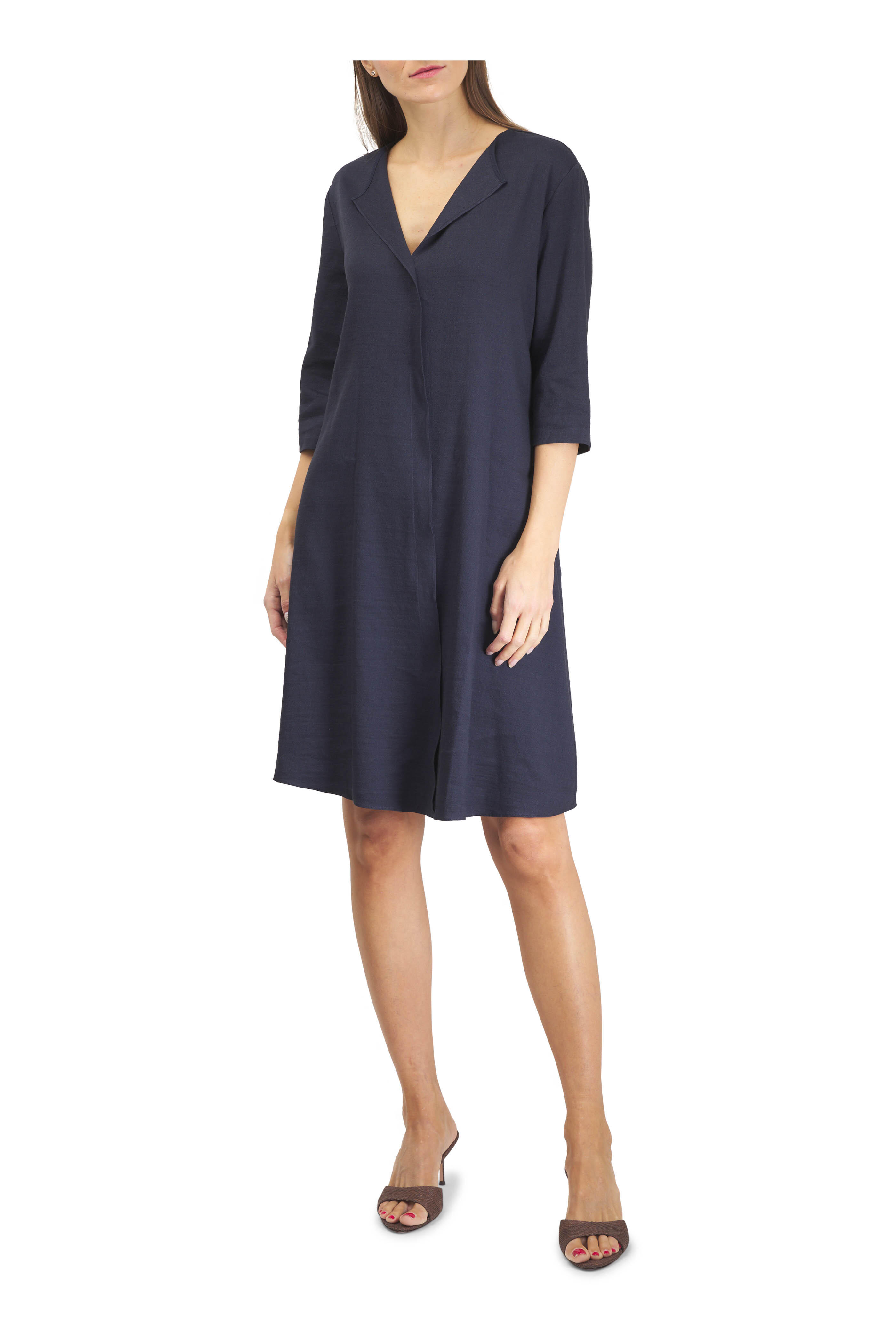 V-neckline. Slip-on style. Three-quarter length sleeves. Made in the USA. Approximately 39" shoulder to hem (measurements taken from size M). 62% linen, 33% viscose, 5% elastane. Dry clean.