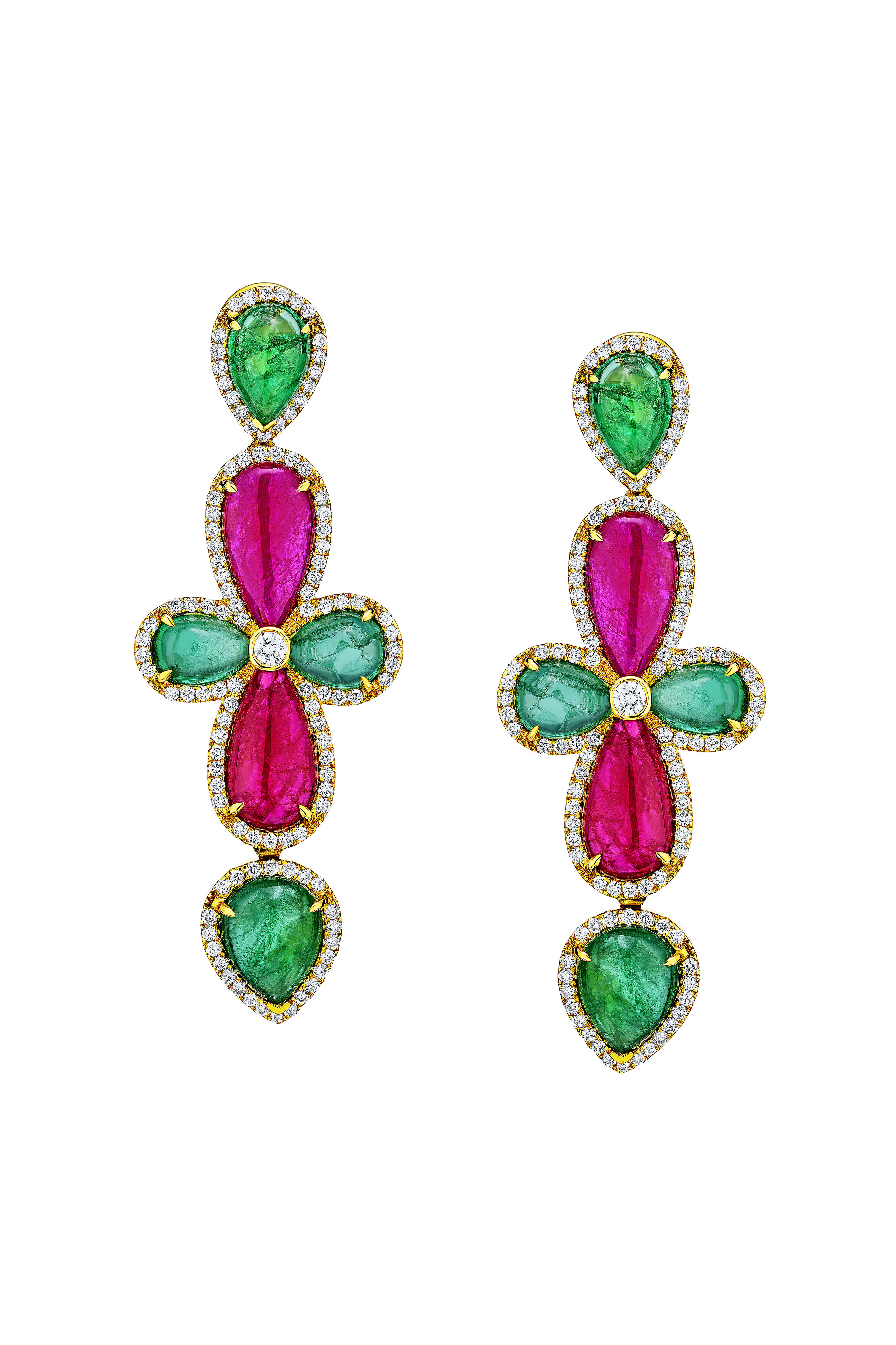 18k Yellow Gold Diamond Emerald & Ruby Earrings